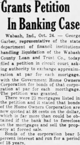 Wabash, Ind., Oct. 24. George Garber, representative of the state department of financil institutions handling liquidation of the Wabash County Loan and Trust Co., today filed a petition in circuit court asking authority to exchange approximration at par for each mortgage. with the Government Home Owners Corporation for bonds of that corporation at par for each morthgage. The petition was granted. There were 23 mortgages listed in the petition and it stated that bonds of the Home Owners Corporation are now quoted at 88 cents on the dollar, which is far more than could be obtained if the bank had to foreclose on the mortgages and sell the property at forced sale. Bonds of the corporation bear percent interest and run for a period of 18 years.