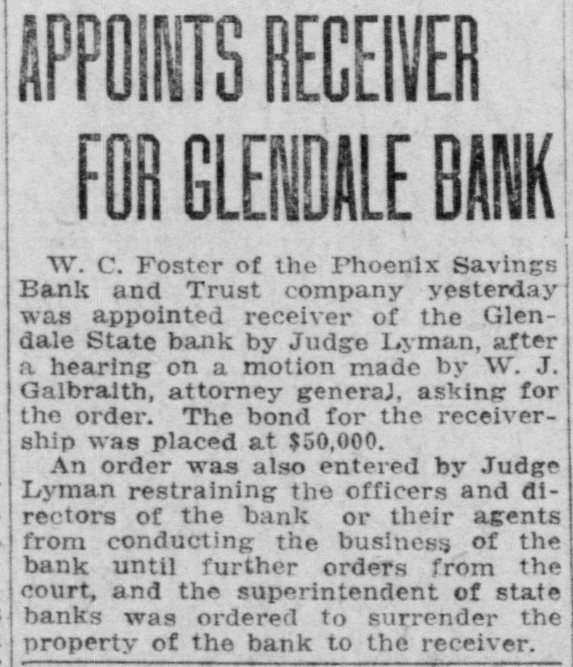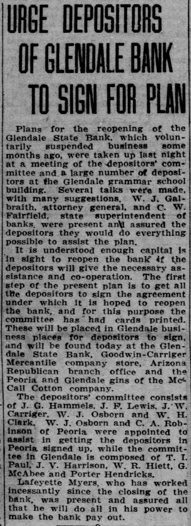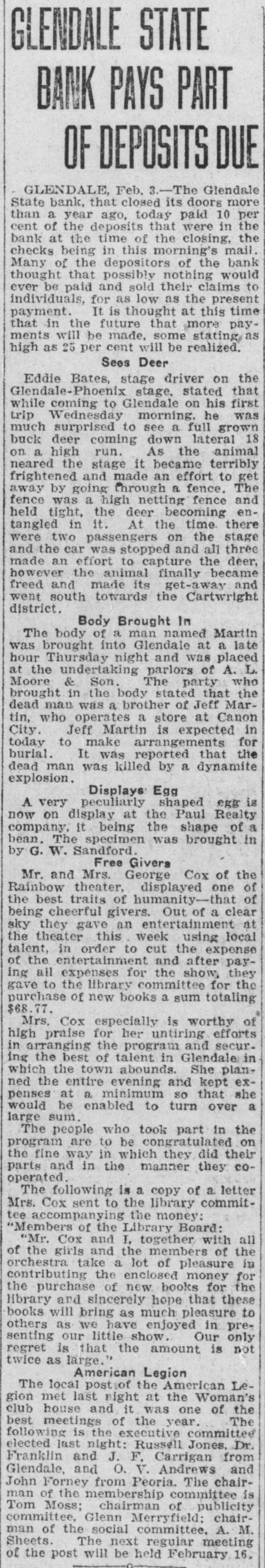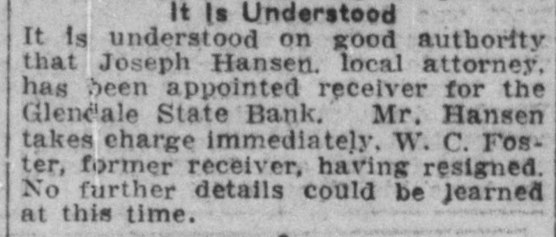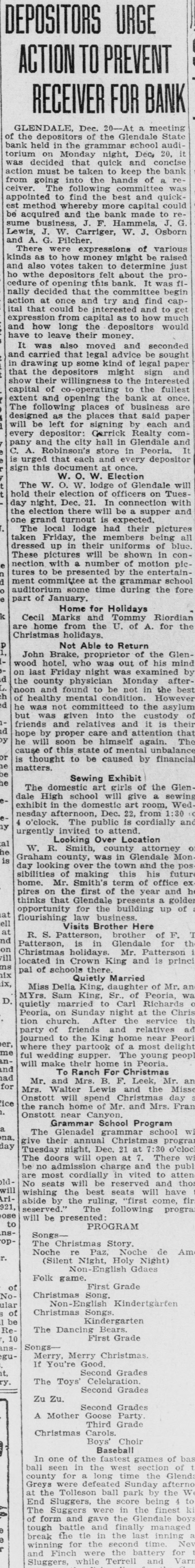 DEPOSITORS URGE TO ACTION PREVENT a 20 Dec. -At meeting of RECEIVER FOR BANK the of Glend GLENDALE, depositors in the bank grammar on was ceiver going into taken to and concise from action decide Monday must The be that quick night keep school Dec audi. State bank J. G. appoint and est be Lewis, sume acquired method pointed A. business J. W. to whereby and find following the the the more hands committee capital and of the to Pilcher There were kinds It the and once and cedure action nally ho wthe also as decided of at take to votes depositors how that this felt to bank. about determine of be the various Osborn pro. just Ital that expressional their leave and have how to long from be the and find to begin It also was moved seconded and that carried in paper legal kind drawing up some and the that sign show the the depositors of Willingnessnight capital co-operating and extent The followingening every left the for places of at in pany C. and depositor: signing that by said paper Peoria and wesigned will be is A, Robinscity as the places Carrick hall the bank the each fullest every this sign urged that store in Glendale Realty hold The their W. W. W. Election at once will there day one the election night election Dec. 21. of grand turnout expected. The lodge had local taken Friday, blue dressed in con shown of motion be to by the tures These nection pictures with up in their the will members be uniform their being Dictures of ment fore auditorimmister of January. Home time during the school plc the for are Cecil home Marks and for Holidays Not Christmas holidays. from the Tommy of the Glen. John his of who wood on hotel Brake Able to Return last Friday the county Monday be and noon found healthy he to the the into custody their and and but friends was was not given mental in How the after best by that hope proper attention he will The soon again. of this cause is to be by caused financial s thought matters. Exhibit Sewing The domestic dale in the school girls of the exhibities nesday urgently o'clock. w Looking afternood invited shoon, The public to Dec. attend is 22, art give cordially from room, Glen is pos day lookinounty, Graham Smith county Location sibilities home. of thinks Dires on Mr. the Smith's making first term this and his the future Mon at opport opportunity Glendale of the year of office flourishing R that Visits law for the business building presents nd ell at and S. Pattern Brother in Christmas Patterson, terson. is in brother Here is princi pal located in holidays Glendale of F of schools Crown there King Mr. and for D. MYrs. Miss Delia Quietly King. Married Carl Richard at the Sunday quietly Peoria on Sam married King. to Sr., of of Mr the tion After church of party and friends to Peor the King near homelatives Journed er. they most delight where partook me ful The peop wedding will their make nd To Mr. for Lewis will Onstott Mrs. Walt and Ranch Mrs. B. For Christonia. Christmas Peoria young ice Mrs and Onstott the ranch near home spend Mr and the Mr. Missouri School Program GrammaCanyon. The school na, give theilenadel annual day 21 7:30 Dec. night. Tuesday will The There doors be no and admission are most cordially old. No wish seats abide wishing the will the to ose to seserved. the ruling, will PROGRAM opns- will be Songs by presented best following 'first come have The Am Noch Christmas re Story (Silent Nonente Night Paz Noche of Folk game. English Holy Gdaes Night) de Noular Christmas Song First Grade of Kindertgarte 10 The Dancinginder Songs getgarten First Grade Songs If Merry You're Merry Good Christmas, Grades Secondration. The Toys Celebrattades second Zu Zu. A Mother Second Goose Grades Boys Choir Christmas Third Carols Grade Party Baseball of the In one the End The and of forman battle finally tough last break timesing the winning