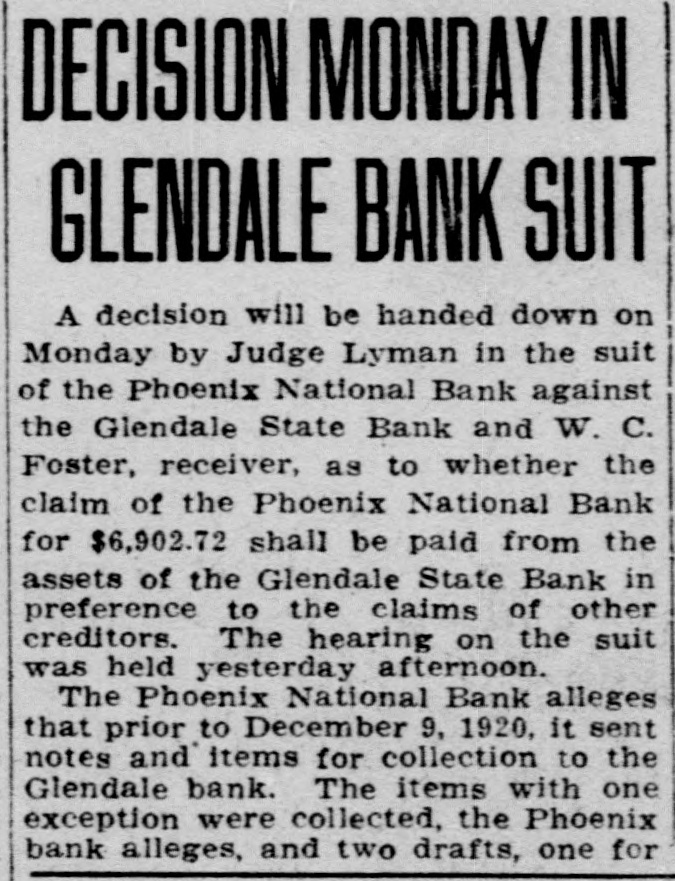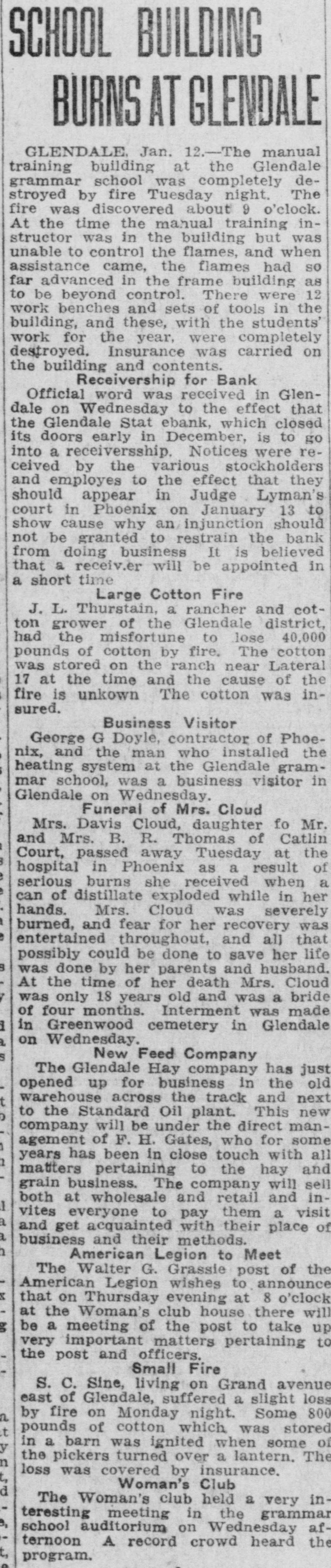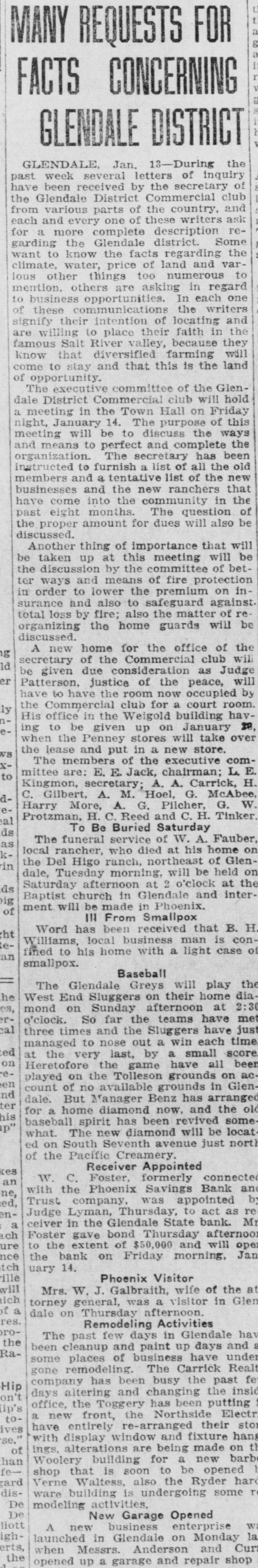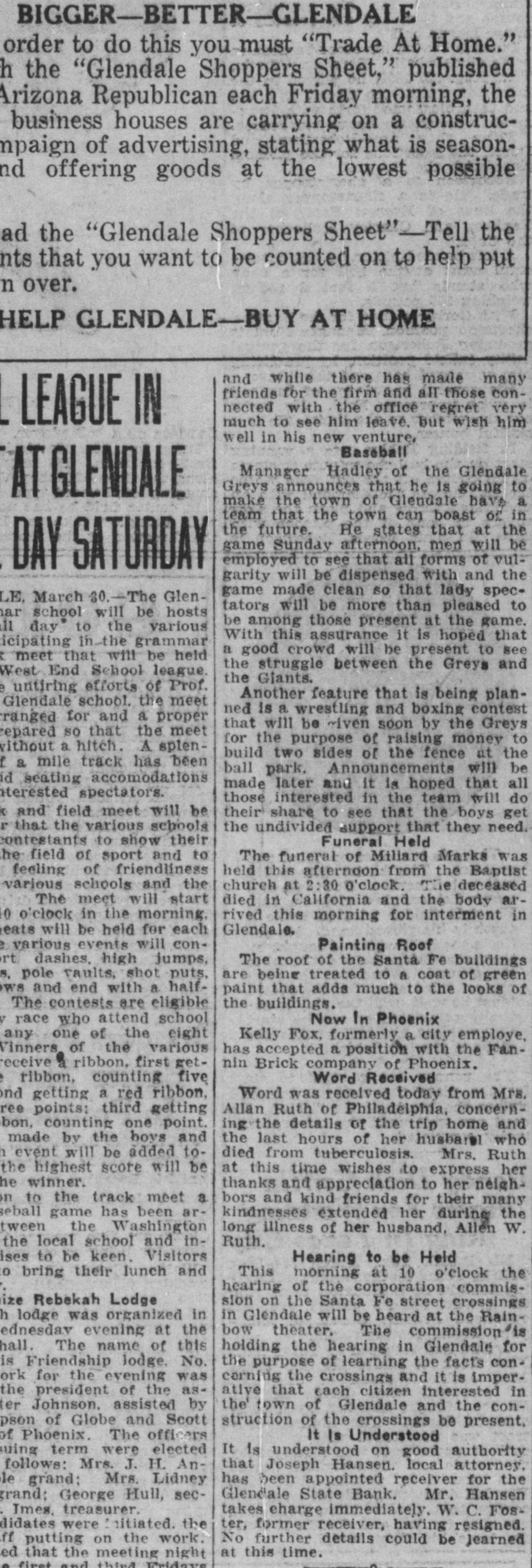 DEPOSITORS URGE TO ACTION PREVENT a 20 Dec. -At meeting of RECEIVER FOR BANK the of Glend GLENDALE, depositors in the bank grammar on was ceiver going into taken to and concise from action decide Monday must The be that quick night keep school Dec audi. State bank J. G. appoint and est be Lewis, sume acquired method pointed A. business J. W. to whereby and find following the the the more hands committee capital and of the to Pilcher There were kinds It the and once and cedure action nally ho wthe also as decided of at take to votes depositors how that this felt to bank. about determine of be the various Osborn pro. just Ital that expressional their leave and have how to long from be the and find to begin It also was moved seconded and that carried in paper legal kind drawing up some and the that sign show the the depositors of Willingnessnight capital co-operating and extent The followingening every left the for places of at in pany C. and depositor: signing that by said paper Peoria and wesigned will be is A, Robinscity as the places Carrick hall the bank the each fullest every this sign urged that store in Glendale Realty hold The their W. W. W. Election at once will there day one the election night election Dec. 21. of grand turnout expected. The lodge had local taken Friday, blue dressed in con shown of motion be to by the tures These nection pictures with up in their the will members be uniform their being Dictures of ment fore auditorimmister of January. Home time during the school plc the for are Cecil home Marks and for Holidays Not Christmas holidays. from the Tommy of the Glen. John his of who wood on hotel Brake Able to Return last Friday the county Monday be and noon found healthy he to the the into custody their and and but friends was was not given mental in How the after best by that hope proper attention he will The soon again. of this cause is to be by caused financial s thought matters. Exhibit Sewing The domestic dale in the school girls of the exhibities nesday urgently o'clock. w Looking afternood invited shoon, The public to Dec. attend is 22, art give cordially from room, Glen is pos day lookinounty, Graham Smith county Location sibilities home. of thinks Dires on Mr. the Smith's making first term this and his the future Mon at opport opportunity Glendale of the year of office flourishing R that Visits law for the business building presents nd ell at and S. Pattern Brother in Christmas Patterson, terson. is in brother Here is princi pal located in holidays Glendale of F of schools Crown there King Mr. and for D. MYrs. Miss Delia Quietly King. Married Carl Richard at the Sunday quietly Peoria on Sam married King. to Sr., of of Mr the tion After church of party and friends to Peor the King near homelatives Journed er. they most delight where partook me ful The peop wedding will their make nd To Mr. for Lewis will Onstott Mrs. Walt and Ranch Mrs. B. For Christonia. Christmas Peoria young ice Mrs and Onstott the ranch near home spend Mr and the Mr. Missouri School Program GrammaCanyon. The school na, give theilenadel annual day 21 7:30 Dec. night. Tuesday will The There doors be no and admission are most cordially old. No wish seats abide wishing the will the to ose to seserved. the ruling, will PROGRAM opns- will be Songs by presented best following 'first come have The Am Noch Christmas re Story (Silent Nonente Night Paz Noche of Folk game. English Holy Gdaes Night) de Noular Christmas Song First Grade of Kindertgarte 10 The Dancinginder Songs getgarten First Grade Songs If Merry You're Merry Good Christmas, Grades Secondration. The Toys Celebrattades second Zu Zu. A Mother Second Goose Grades Boys Choir Christmas Third Carols Grade Party Baseball of the In one the End The and of forman battle finally tough last break timesing the winning