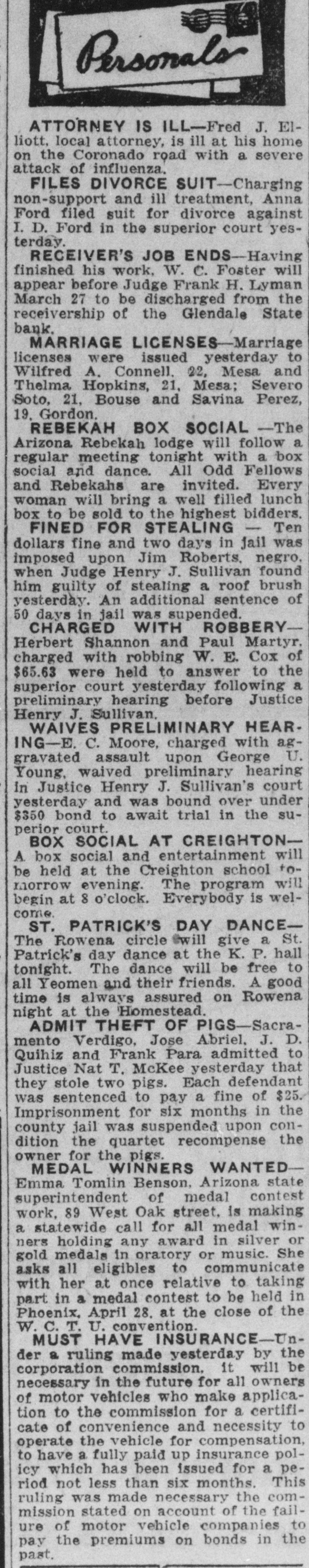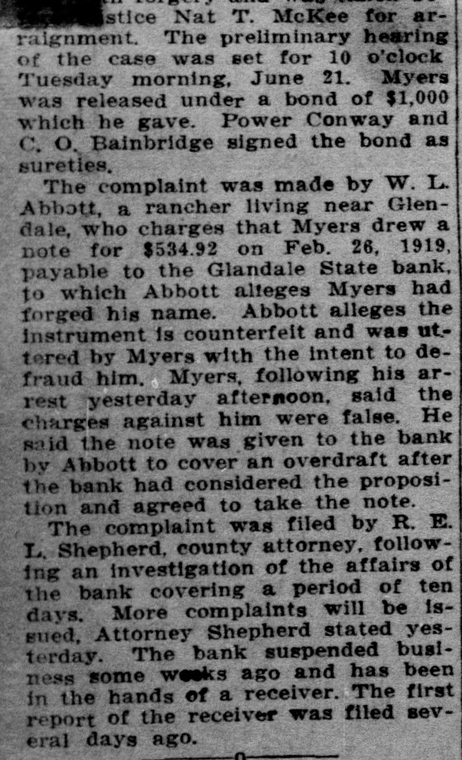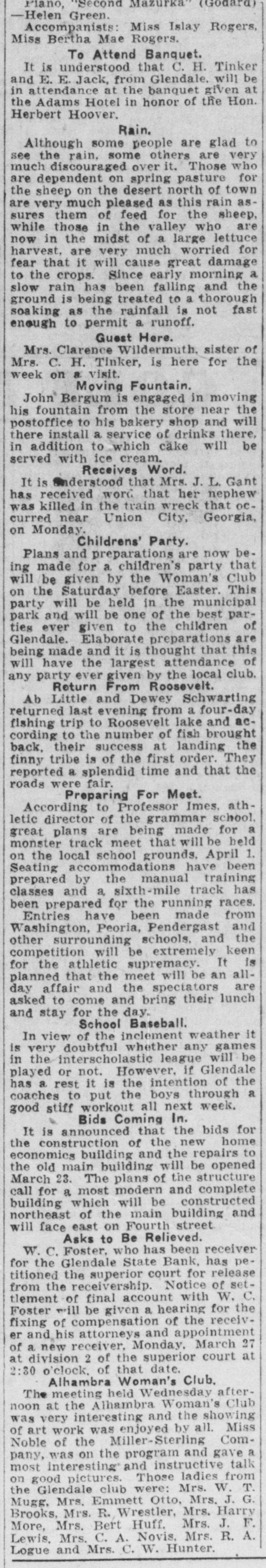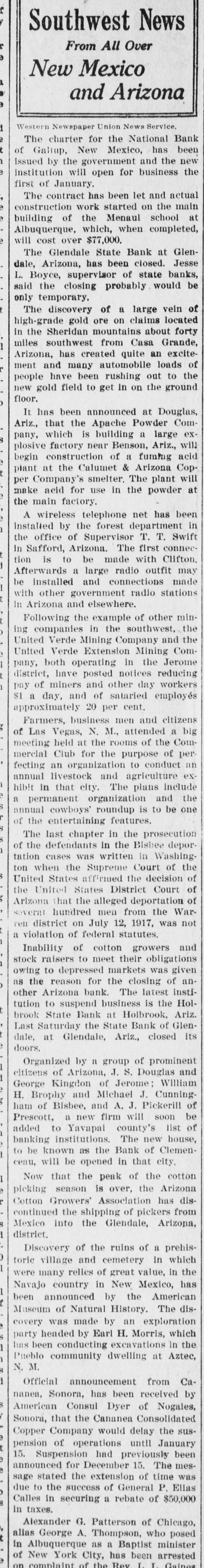 DEPOSITORS URGE TO ACTION PREVENT a 20 Dec. -At meeting of RECEIVER FOR BANK the of Glend GLENDALE, depositors in the bank grammar on was ceiver going into taken to and concise from action decide Monday must The be that quick night keep school Dec audi. State bank J. G. appoint and est be Lewis, sume acquired method pointed A. business J. W. to whereby and find following the the the more hands committee capital and of the to Pilcher There were kinds It the and once and cedure action nally ho wthe also as decided of at take to votes depositors how that this felt to bank. about determine of be the various Osborn pro. just Ital that expressional their leave and have how to long from be the and find to begin It also was moved seconded and that carried in paper legal kind drawing up some and the that sign show the the depositors of Willingnessnight capital co-operating and extent The followingening every left the for places of at in pany C. and depositor: signing that by said paper Peoria and wesigned will be is A, Robinscity as the places Carrick hall the bank the each fullest every this sign urged that store in Glendale Realty hold The their W. W. W. Election at once will there day one the election night election Dec. 21. of grand turnout expected. The lodge had local taken Friday, blue dressed in con shown of motion be to by the tures These nection pictures with up in their the will members be uniform their being Dictures of ment fore auditorimmister of January. Home time during the school plc the for are Cecil home Marks and for Holidays Not Christmas holidays. from the Tommy of the Glen. John his of who wood on hotel Brake Able to Return last Friday the county Monday be and noon found healthy he to the the into custody their and and but friends was was not given mental in How the after best by that hope proper attention he will The soon again. of this cause is to be by caused financial s thought matters. Exhibit Sewing The domestic dale in the school girls of the exhibities nesday urgently o'clock. w Looking afternood invited shoon, The public to Dec. attend is 22, art give cordially from room, Glen is pos day lookinounty, Graham Smith county Location sibilities home. of thinks Dires on Mr. the Smith's making first term this and his the future Mon at opport opportunity Glendale of the year of office flourishing R that Visits law for the business building presents nd ell at and S. Pattern Brother in Christmas Patterson, terson. is in brother Here is princi pal located in holidays Glendale of F of schools Crown there King Mr. and for D. MYrs. Miss Delia Quietly King. Married Carl Richard at the Sunday quietly Peoria on Sam married King. to Sr., of of Mr the tion After church of party and friends to Peor the King near homelatives Journed er. they most delight where partook me ful The peop wedding will their make nd To Mr. for Lewis will Onstott Mrs. Walt and Ranch Mrs. B. For Christonia. Christmas Peoria young ice Mrs and Onstott the ranch near home spend Mr and the Mr. Missouri School Program GrammaCanyon. The school na, give theilenadel annual day 21 7:30 Dec. night. Tuesday will The There doors be no and admission are most cordially old. No wish seats abide wishing the will the to ose to seserved. the ruling, will PROGRAM opns- will be Songs by presented best following 'first come have The Am Noch Christmas re Story (Silent Nonente Night Paz Noche of Folk game. English Holy Gdaes Night) de Noular Christmas Song First Grade of Kindertgarte 10 The Dancinginder Songs getgarten First Grade Songs If Merry You're Merry Good Christmas, Grades Secondration. The Toys Celebrattades second Zu Zu. A Mother Second Goose Grades Boys Choir Christmas Third Carols Grade Party Baseball of the In one the End The and of forman battle finally tough last break timesing the winning