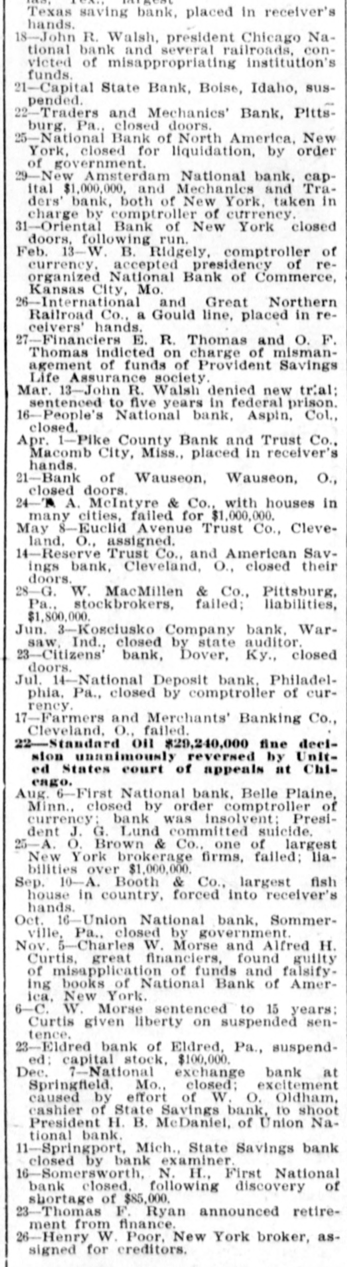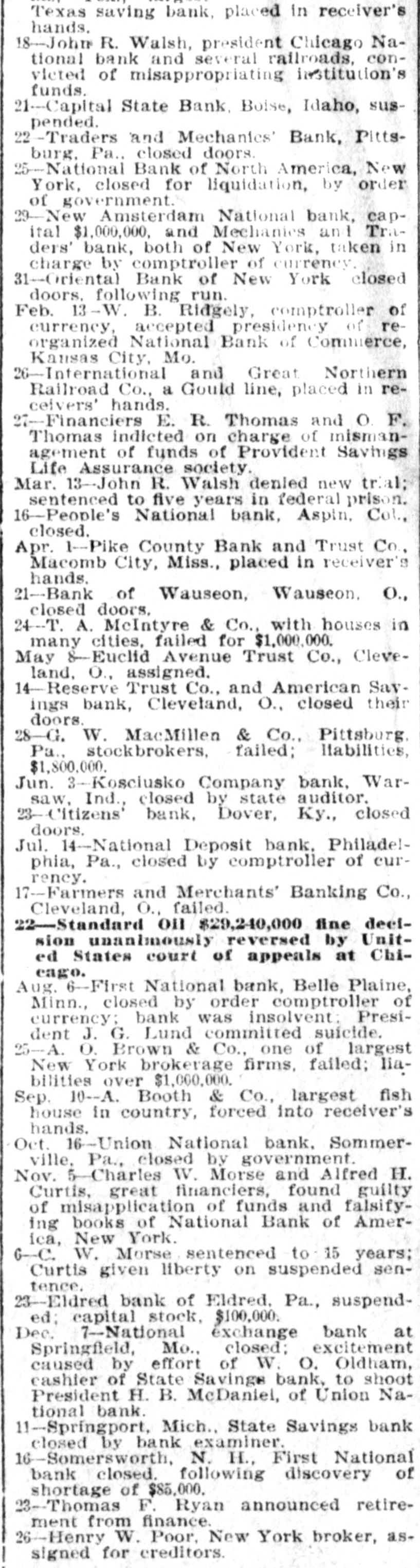 FINANCIAL $ $ Jan. 2-State Bank, Rockyford, Col., closed doors. Ka 6-Four big New York diamond firms forced into trustee's hands: liabilities, $4,500,000. 8-Chicago Great Western railroad JOHN placed in hands of D. receivers. ROCKEFELLER 16-Western Bank and Trust Co., Dallas, Tex. largest Texas saving bank, placed in receiver's hands. 18-John R. Walsh, president Chicago National bank and several railroads, convicted of misappropriating institution's funds. 21-Capital State Bank, Boise, Idaho, suspended. 22-Traders and Mechanics' Bank, Pittsburg. Pa.. closed doors. 25-National Bank of North America, New York, closed for liquidation, by order of government. 29-New Amsterdam National bank, capital $1,000,000, and Mechanics and Traders' bank, both of New York, taken in charge by comptroller of currency. 31-Oriental Bank of New York closed doors, following run. Feb. 13-W. B. Ridgely, comptroller of currency, accepted presidency of reorganized National Bank of Commerce, Kansas City, Mo. 26-International and Great Northern Railroad Co., a Gould line, placed in receivers' hands. 27-Financiers E. R. Thomas and O. F. Thomas indicted on charge of mismanagement of funds of Provident Savings Life Assurance society. Mar. 13-John R. Walsh denied new trial; sentenced to five years in federal prison. -People's National bank. Aspin. Col., closed. Apr. 1-Pike County Bank and Trust Co., Macomb City, Miss., placed in receiver's hands. 21-Bank of Wauseon. Wauseon, O., closed doors. 24-T. A. McIntyre & Co., with houses in many cities, failed for $1,000,000. May 8-Euclid Avenue Trust Co., Cleveland, O., assigned. 14-Reserve Trust Co., and American Savings bank, Cleveland, O., closed their doors. 28-G. W. MacMillen & Co., Pittsburg, Pa.. stockbrokers. failed; liabilities, $1,800,000. Jun. 3-Kosclusko Company bank, Warsaw, Ind., closed by state auditor. 23-Citizens' bank, Dover, Ky., closed doors. Jul. 14-National Deposit bank. Philadelphia, Pa., closed by comptroller of currency. 17-Farmers and Merchants' Banking Co., Cleveland, O., failed. 22-Standard on $29,240,000 fine declsion unanimously reversed by United States court of appeals at Chicago. Aug. 6-First National bank, Belle Plaine, Minn., closed by order comptroller of currency; bank was insolvent: President J. G. Lund committed suicide. 25-A. a Brown & Co., one of largest New York brokerage firms, failed; liabilities over $1,000,000. Sep. 10-A. Booth & Co., largest fish house in country, forced into receiver's hands. Oct. 16-Union National bank, Sommerville, Pa., closed by government. Nov. -Charles W. Morse and Alfred H. Curtis, great financiers, found guilty of misapplication of funds and falsifying books of National Bank of America, New York. 6-C. W. Morse sentenced to 15 years; Curtis given liberty on suspended sentence. 23-Eldred bank of Eldred, Pa., suspended: capital stock, $100,000. Dec. 7-National exchange bank at Springfield, Mo., closed: excitement caused by effort of W. O. Oldham, cashier of State Savings bank, to shoot President H. B. McDaniel, of Union National bank. 11-Springport, Mich., State Savings bank closed by bank examiner. 16-Somersworth, N. H., First National bank closed. following discovery of shortage of $85,000. 23-Thomas F. Ryan announced retirement from finance. 26-Henry W. Poor, New York broker, assigned for creditors.