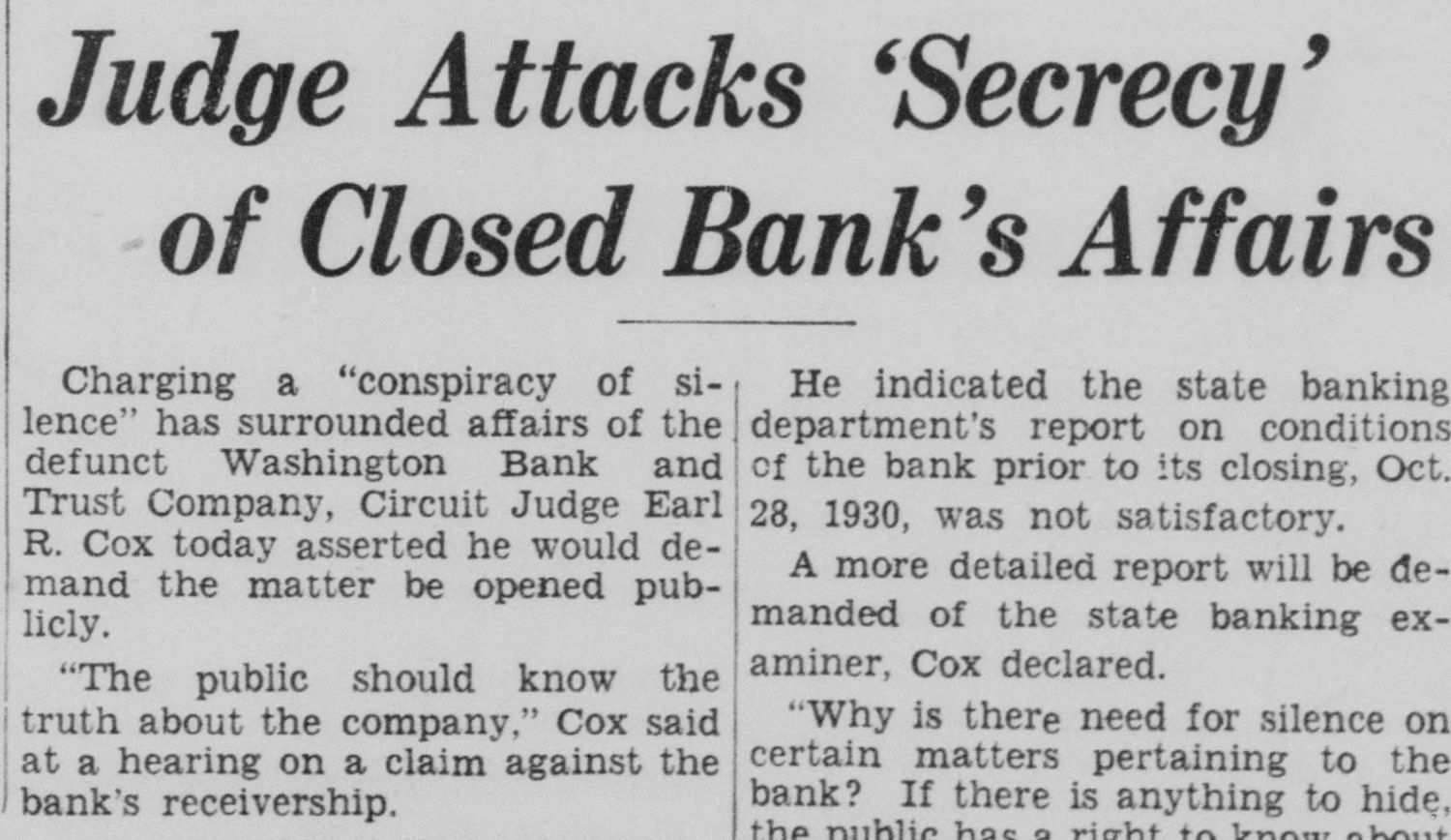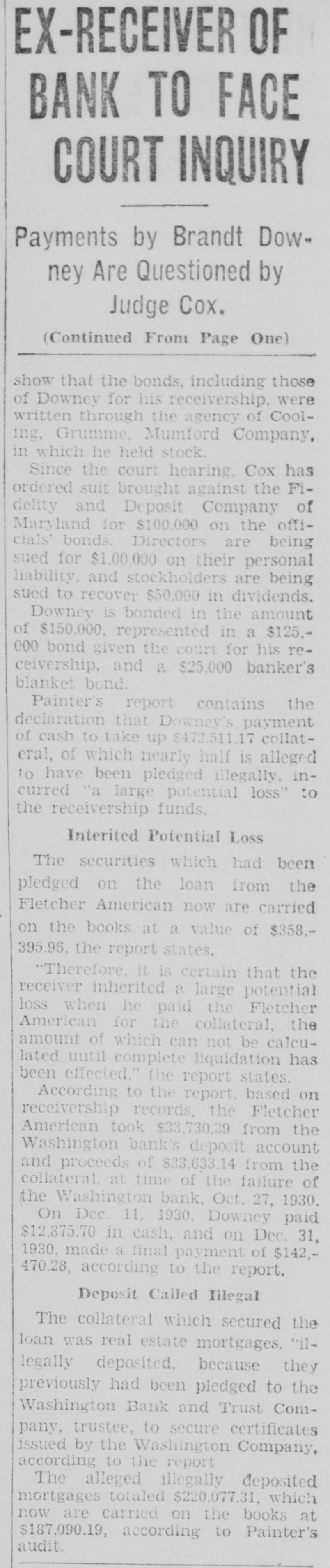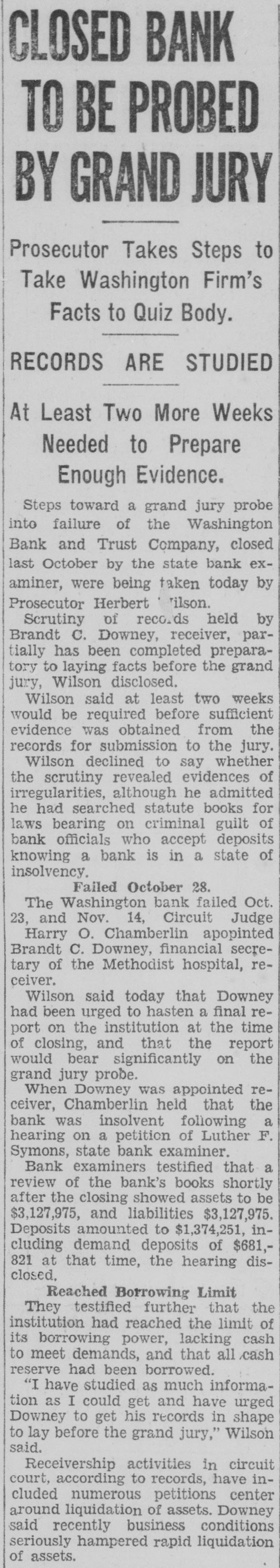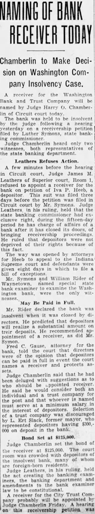 OF BANK RECEIVER TODAY Chamberlin to Make Decision on Washington Company Insolvency Case. A receiver for the Washington Bank and Trust Company will be named by Judge Harry O. Chamberlin Circuit The bank was held be insolvent the judge following hearing yesterday petition filed by Luther Symons, state banking commissioner Judge Chamberlin heard only the state banking department. Leathers Refuses Action A few minutes before the hearing in Circuit court, Judge James M. Leathers of Superior court, Room refused appoint receiver for the bank on petition Iva Heeb, This suit was days before the filed in Circuit court by Mr. Judge Leathers his ruling, held that the state banking commissioner had exclusive right, during the fifteen-day period he has charge of affairs of bank after has its doors, of bringing receivership proceedings He ruled that depositors were not deprived of their rights because of this fact. way was opened by attorneys for Heeb appeal Indiana court were given eight days in which to file of exceptions Mr. Symons and William Rider of Waynetown, named state examiner the ington bank, were the only nesses. May Be Paid in Full. Mr. Rider declared the bank was insolvent when it closed by directors. He predicted that depositors will realize substantial amount He pointment treir deposits. of receiver, as did Mr. attorney for the Fred bank, told the that depositors directors of the opinion that were can be paid full in event the court names receiver and protects asJudge Chamberlin said that he had been deluged with who should be appointed receiver. would consider both an He said he individual and trust company for the post and that whoever is named serve minimum salary the interest depositors. Selection trust was discouraged by Ert Slack, mayor, having $300,000 on deposit in the bank. Bond Set at $125,000 Judge Chamberlin set the bond of The court the at with the insolvent bank, many of whom foreign-born residents. in his held Judge the act creating the banking and iners, the the bank examiner law to be receiver for the City Trust Comwill be appointed by pany probably Judge Chamberlin hearing on this receivership petition was