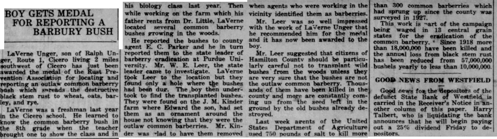LaVerne Unger, son of Ralph Unger, Route 1, Cicero living 2 miles southwest of Cicero has just been awarded the medal of the Rust Prevention Association for locating and reporting an outlaw common barberry bush which sureads the destructive black stem rust to wheat, oats, barley, and rye. LaVerne was a freshman last year in the Cicero school. He learned to know the common barberry bush in the 8th grade when the teacher brought one to show the class and in while working on the farm which his father rents from Dr. Little, LaVerne located several common barberry bushes growing in the woods. He reported the bushes to county agent E. C. Parker and he in turn reported them to the state leader of barberry eradication at Purdue University. Mr. W. E. Leer, the state leader came to investigate. LaVerne took Leer to the location but they found only a hole where the bushes had been dug. The boy then undertook to find the transplanted bushes. They were found on the J. M. Kinder farm where Edward the son, had set them as an ornament around the house not knowing that they were the outlaw common barberries. Mr. Kinder was ~lad to have them removed vicinity identified them as barberries. Mr. Leer was so well impressed with the work of LaVerne Unger that he recommended him for the medal and it has now been awarded to the boy. Mr. Leer suggested that citizens of Hamilton County should be particularly careful not to transplant wild bushes from the woods unless they are very sure that the bushes are not the outlaw common barberry. Thousands of them have been killed in the county and more are constantly coming up from the seed left in the ground by the old bushes already destroyed. Last week agents of the United States Department of Agriculture used 750 pounds of salt to kill more than 300 common barberries which had sprung up since the county was surveyed in 1927. This work is nart of the campaign being waged in 13 central grain states for the eradication of the common barberry. Since 1918 more than 18,000,000 have been killed and the annual loss from black stem rust has been reduced from 57,000,000 bushels yearly to less than 10,000,000.