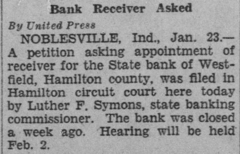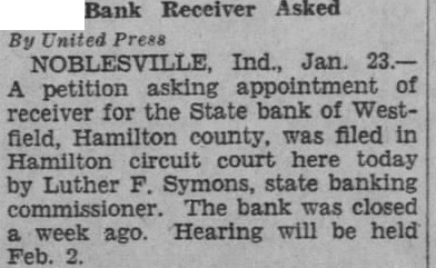 Bank Receiver Asked By United Press NOBLESVILLE, Ind., Jan. 23.A petition asking appointment of receiver for the State bank of Westfield, Hamilton county, was filed in Hamilton circuit court here today by Luther F. Symons, state banking commissioner. The bank was closed a week ago. Hearing will be held Feb. 2.