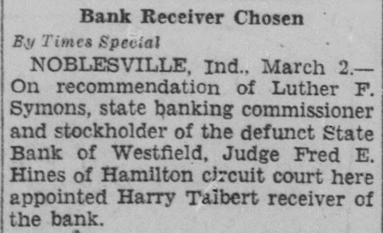 Times Special NOBLESVILLE, Ind., March On Luther Symons, state banking commissioner of the defunct State Bank Westfield, Judge Fred Hines of Hamilton circuit court here appointed Harry Talbert receiver of the bank.
