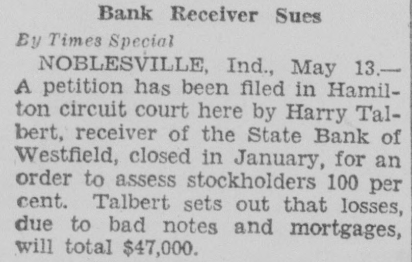Bank Receiver Sues By Times Special NOBLESVILLE, Ind., May 13.A petition has been filed in Hamilton circuit court here by Harry Talbert, receiver of the State Bank of Westfield, closed in January, for an order to assess stockholders 100 per cent. Talbert sets out that losses, due to bad notes and mortgages, will total $47,000.