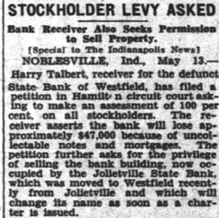 Bank Receiver Also Seeks Permission to Sell Property. [Special to The News) NOBLESVILLE, Ind., May 13.Harry Talbert, receiver for the defunct State Bank of Westfield, has filed a petition in n court asking to make an assessment of 100 per cent. on all stockholders. The receiver asserts the bank will lose approximately $47 000 because of uncollectable notes and mortgages. The petition further asks for the privilege of selling the bank building, now occupied by the Jolietville State Bank, which was moved to Westfield recently from Jolietville and which will change its name as soon as charter is issued.