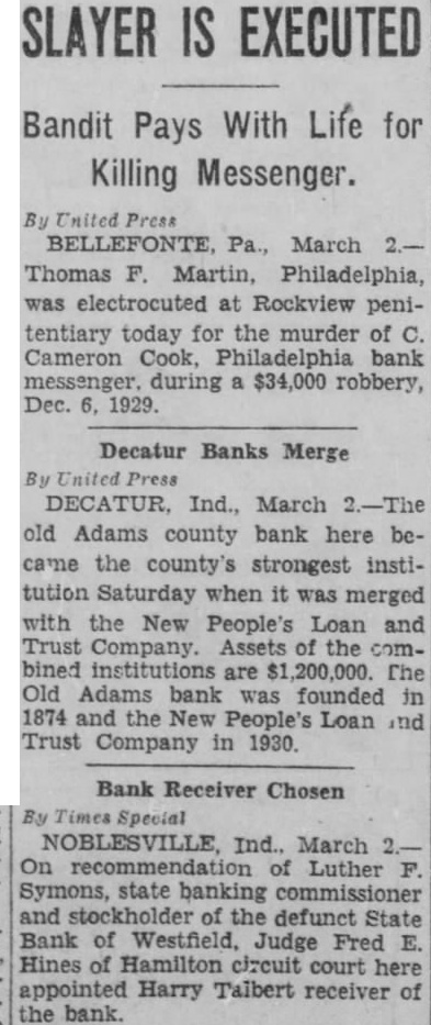 DECATUR, Ind., March old Adams county bank here became the county's strongest institution Saturday when it was merged with the New People's Loan Trust Company. the bined institutions are Old Adams bank founded 1874 People's Loan Trust Company in 1930.