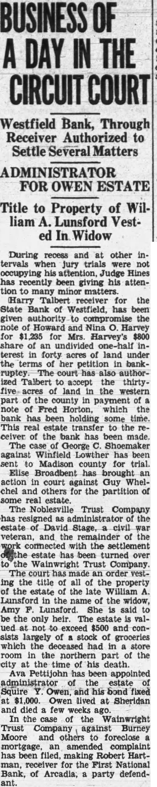 During recess and other tervals when jury trials occupying attention, Judge Hines recently been giving his attento many matters. Harry the State Bank of Westfield, has given to the Howard and Nina for for Mrs. Harvey's share interest acres land under the her petition bankcourt has Talbert accept thirtyland the western part county in payment of note Fred which the bank has been holding some time. This real estate transfer to the ceiver the bank has been The George Shoemaker against Winfield Lowther has been sent Madison county for trial. Elise brought an action in court against Guy Whelchel and others for the partition of some estate. The Noblesville Trust Company has the estate Stage, civil veteran, and the of with the settlement estate been turned over Wainwright Trust Company. The made an order vesting the title all the property the estate of the late William Lunsford the name the widow, Amy Lunsford. She said the only heir. The estate ued to exceed $500 and sists largely of stock of groceries which the deceased had in room the part of the city the time of his death. Ava has appointed the estate Squire and his bond fixed Owen lived at Sheridan few weeks case of the Wainwright Trust Company against Burney Moore and others to foreclose mortgage, amended complaint has been filed, making Robert Hartman, receiver for the First National Bank, of Arcadia, party defendant.