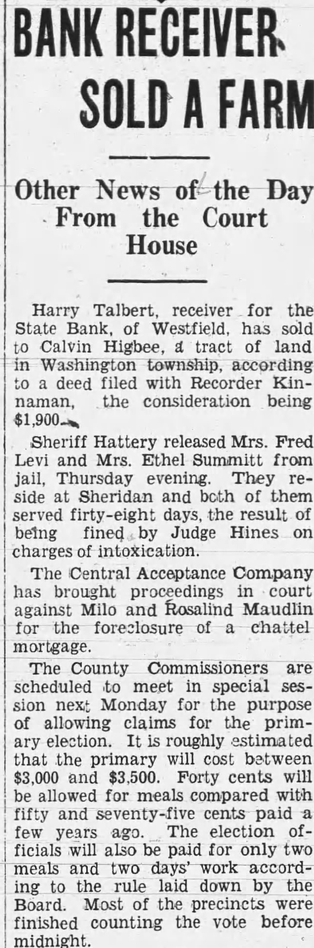 Harry Talbert receiver for the State Bank, of Westfield. has Calvin Higbee, tract of land in Washington township, according deed filed with Recorder Kinnaman, the consideration being