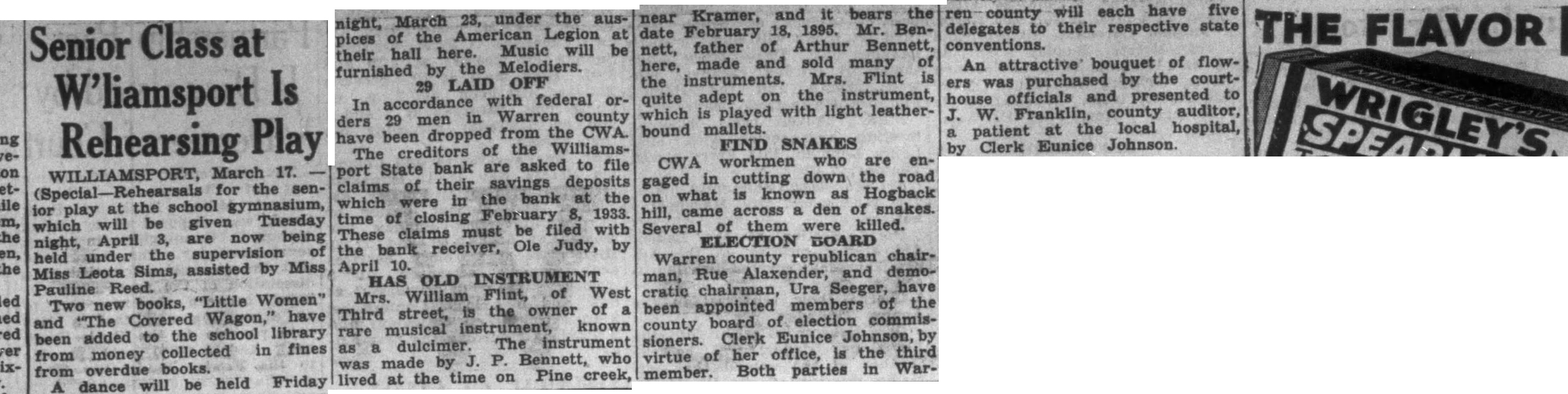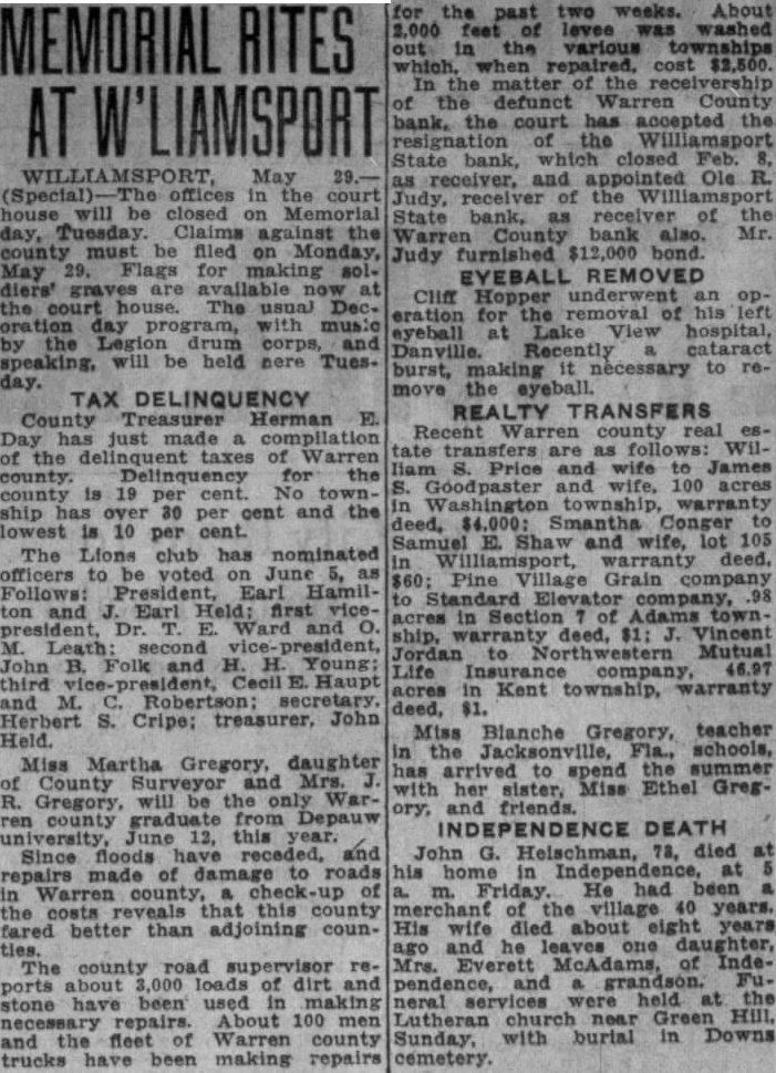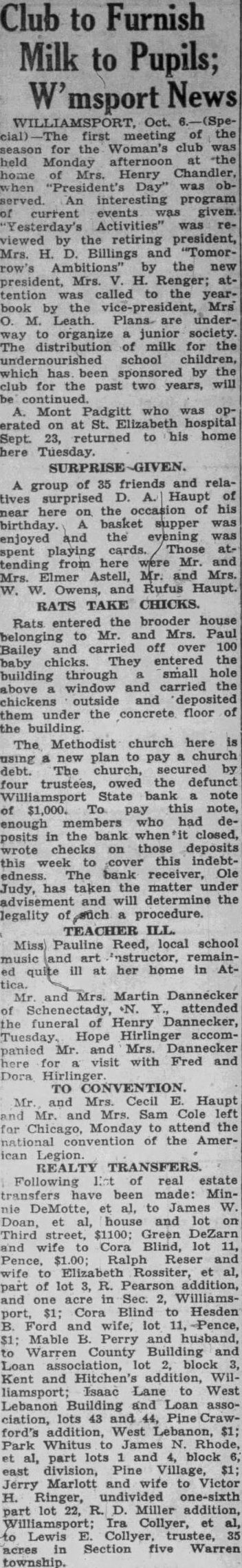 A group of 35 friends and relatives surprised D. A. Haupt of near here on the occasion of his birthday. A basket supper was enjoyed and the evening was spent playing cards. Those attending from here were Mr. and Mrs. Elmer Astell, Mr. and Mrs. W. W. Owens, and Rufus Haupt. RATS TAKE CHICKS. Rats entered the brooder house belonging to Mr. and Mrs. Paul Bailey and carried off over 100 baby chicks. They entered the building through a small hole above a window and carried the chickens outside and deposited them under the concrete floor of the building. The Methodist church here is using a new plan to pay a church debt. The church, secured by four trustees, owed the defunct Williamsport State bank a note of $1,000. To pay this note, enough members who had deposits in the bank when it closed, wrote checks on those deposits this week to cover this indebtedness. The bank receiver, Ole Judy, has taken the matter under advisement and will determine the legality of such a procedure. TEACHER ILL. Miss) Pauline Reed, local school music and art instructor, remained quite ill at her home in Attica. Mr. and Mrs. Martin Dannecker of Schenectady, N. Y., attended the funeral of Henry Dannecker, Tuesday. Hope Hirlinger accompanied Mr. and Mrs. Dannecker here for visit with Fred and Dora Hirlinger TO CONVENTION. Mr and Mrs. Cecil E. Haupt and Mr. and Mrs. Sam Cole left for Chicago, Monday to attend the national convention of the American Legion. REALTY TRANSFERS. Following Est of real estate transfers have been made: Minnie DeMotte, et al, to James W. Doan, et al, house and lot on Third street, $1100; Green DeZarn and wife to Cora Blind, lot 11, Pence, $1.00; Ralph Reser and wife to Elizabeth Rossiter, et al, part of lot 3, R. Pearson addition, and one acre in Sec. 2, Williamsport, $1; Cora Blind to Hesden B. Ford and wife, lot 11, Pence, $1: Mable B. Perry and husband, to Warren County Building and Loan association, lot 2, block 3, Kent and Hitchen's addition, Williamsport; Isaac Lane to West Lebanon Building and Loan association, lots 43 and 44, Pine Crawford's addition, West Lebanon, $1; Park Whitus to James N. Rhode, et al, part lots 1 and 4, block 6; east division, Pine Village, $1; Jerry Marlott and wife to Victor H. Ringer, undivided one-sixth part lot 22, R. D. Miller addition, Williamsport; Ira Collyer, et al, to Lewis E. Collyer, trustee, 35 acres in Section five Warren township.