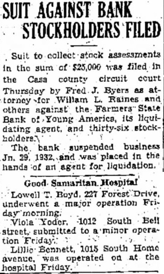 SUIT AGAINST STOCKHOLDERS Suit to collect stock assessments of $25,000 was filed in in the sum the Casa county circuit court Thursday by Fred Byers as at torney Willam Raines others against the Farmers State Bank Young America, its liquidating agent, and thirty-six stockThe bank suspended business Jn. 29. 1932, placed in the hands of an agent for liquidation. Good Samaritan Hospital Lowell Boyd 227 Forest Drive underwent major operation Fri- 1012 South Bell Viola Yoder. street, submitted to minor operation Lillic Bennett, 1015 South Home was operated on at the avenue. Friday.