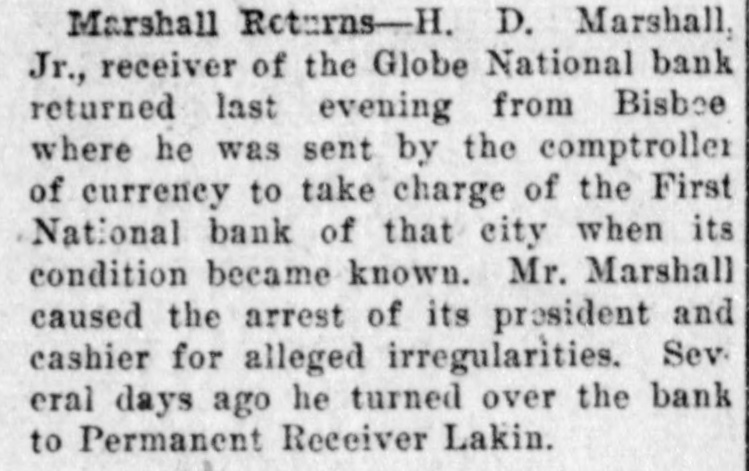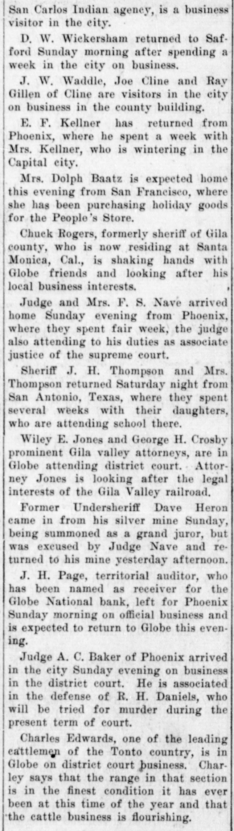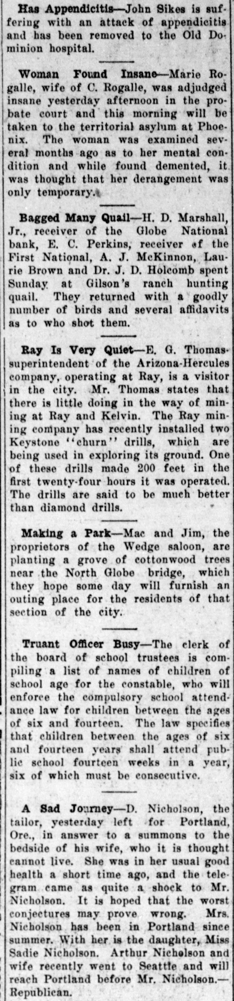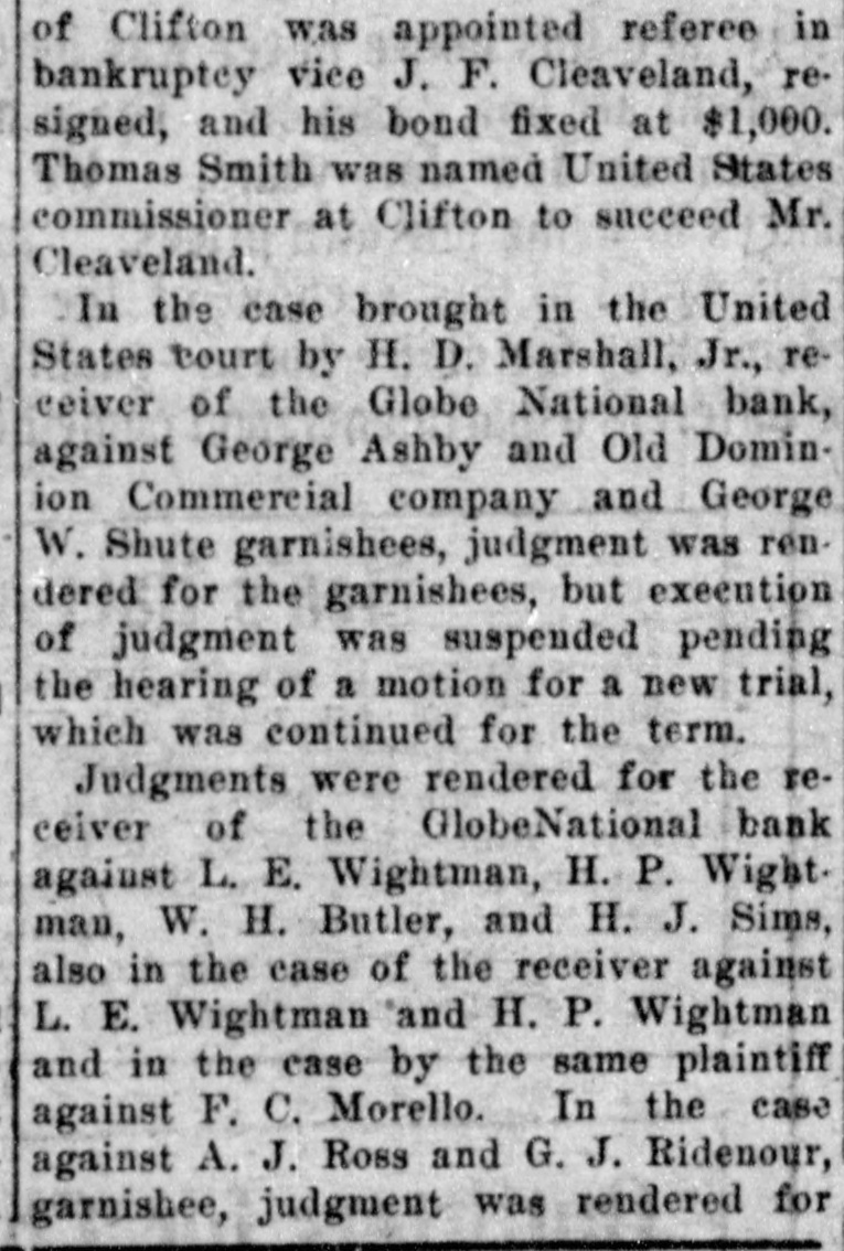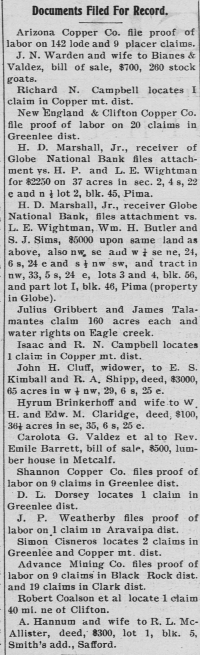 Documents Filed For Record. Arizona Copper Co. file proof of labor on 142 lode and 9 placer claims. J. N. Warden and wife to Bianes & Valdez, bill of sale, $700, 260 stock goats. Richard N. Campbell locates I claim in Copper mt. dist. New England & Clifton Copper Co. file proof of labor on 20 claims in Greenlee dist. H. D. Marshall, Jr., receiver of Globe National Bank files attachment vs. H. P. and L. E. Wightman for $2250 on 37 acres in sec. 2, 4 s, 22 e and n 1 lot 2, blk. 45, Pima. H. D. Marshall, Jr., receiver Globe National Bank, files attachment vs. L. E. Wightman, Wm. H. Butler and S. J. Sims, $5000 upon same land as above, also nw, se and W t se ne, 24, 6 s, 24 e and S 1/2 nw sw, and tract in nw, 33, 5 s, 24 e, lots 3 and 4, blk. 56, and part lot I, blk. 46, Pima (property in Globe). Julius Gribbert and James Talamantes claim 160 acres each and water rights on Eagle creek. Isaac and R. N. Campbell locates 1 claim in Copper mt. dist. John H. Cluff, widower, to E. S. Kimball and R. A. Shipp, deed, $3000, 65 acres in W 1 nw, 29, 6 s, 25 e. Hyrum Brinkerhoff and wife to w. H. and Edw. M. Claridge, deed, $100, 361 acres in se, 35, 6 s, 25 e. Carolota G. Valdez et al to Rev. Emile Barrett, bill of sale, $500, lumber house in Metcalf. Shannon Copper Co. files proof of labor on 9 claims in Greenlee dist. D. L. Dorsey locates 1 claim in Greenlee dist. J. P. Weatherby files proof of labor on 1 claim in Aravaipa dist. Simon Cisneros locates 2 claims in Greenlee and Copper mt. dist. Advance Mining Co. files proof of labor on 9 claims in Black Rock dist. and 19 claims in Clark dist. Robert Coalson et al locate 1 claim 40 mi. ne of Clifton. A. Hannum and wife to R. L. McAllister, deed, $300, lot 1, blk. 5, Smith's add., Safford.