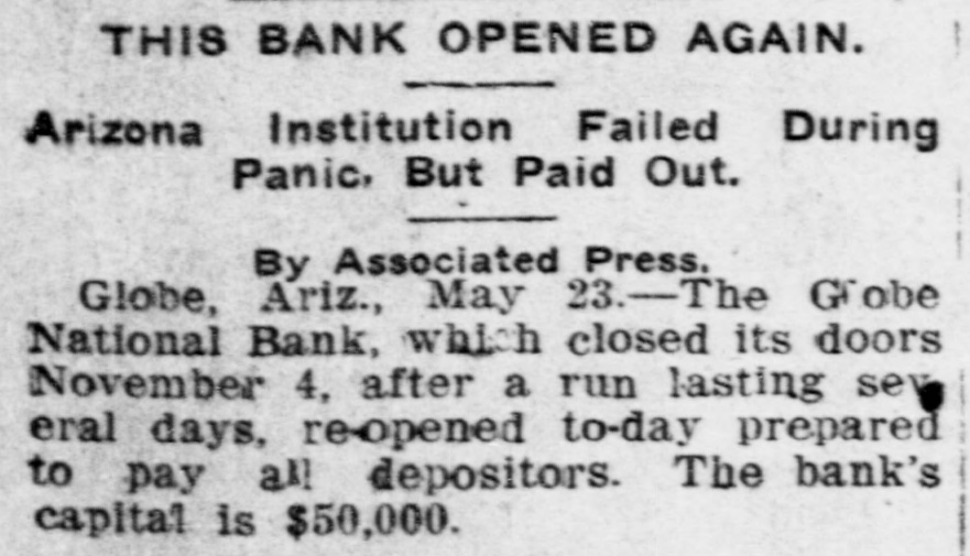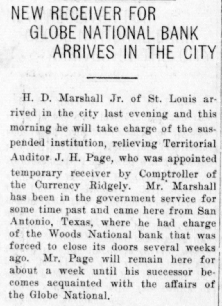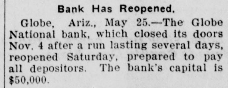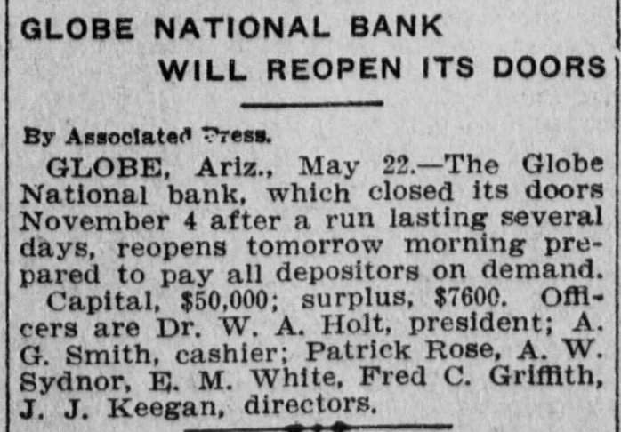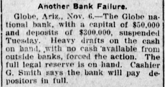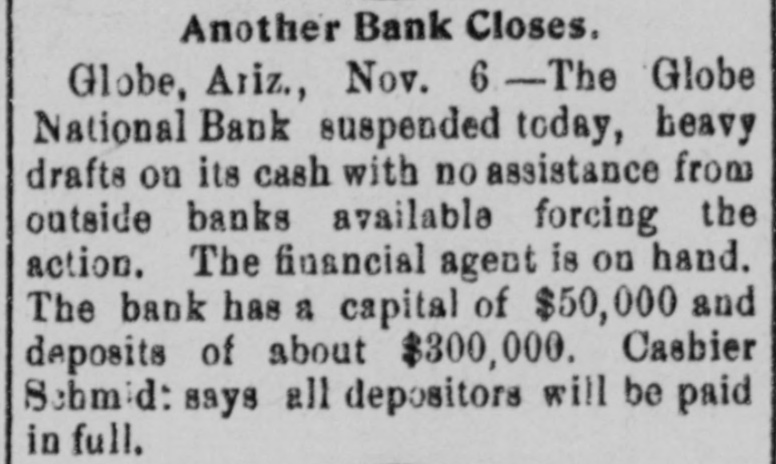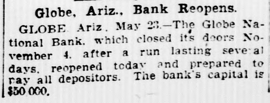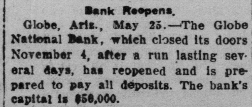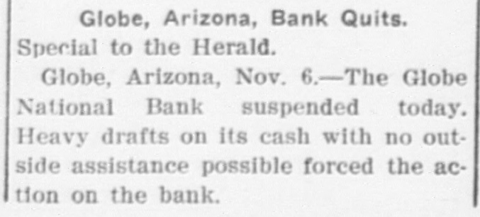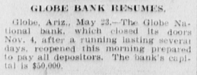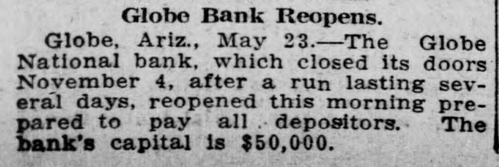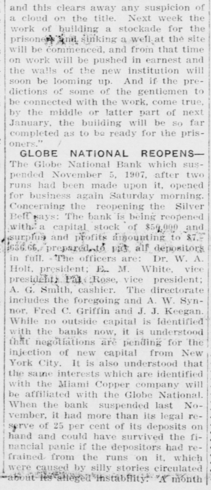 Documents Filed For Record. Arizona Copper Co. file proof of labor on 142 lode and 9 placer claims. J. N. Warden and wife to Bianes & Valdez, bill of sale, $700, 260 stock goats. Richard N. Campbell locates I claim in Copper mt. dist. New England & Clifton Copper Co. file proof of labor on 20 claims in Greenlee dist. H. D. Marshall, Jr., receiver of Globe National Bank files attachment vs. H. P. and L. E. Wightman for $2250 on 37 acres in sec. 2, 4 s, 22 e and n 1 lot 2, blk. 45, Pima. H. D. Marshall, Jr., receiver Globe National Bank, files attachment vs. L. E. Wightman, Wm. H. Butler and S. J. Sims, $5000 upon same land as above, also nw, se and W t se ne, 24, 6 s, 24 e and S 1/2 nw sw, and tract in nw, 33, 5 s, 24 e, lots 3 and 4, blk. 56, and part lot I, blk. 46, Pima (property in Globe). Julius Gribbert and James Talamantes claim 160 acres each and water rights on Eagle creek. Isaac and R. N. Campbell locates 1 claim in Copper mt. dist. John H. Cluff, widower, to E. S. Kimball and R. A. Shipp, deed, $3000, 65 acres in W 1 nw, 29, 6 s, 25 e. Hyrum Brinkerhoff and wife to w. H. and Edw. M. Claridge, deed, $100, 361 acres in se, 35, 6 s, 25 e. Carolota G. Valdez et al to Rev. Emile Barrett, bill of sale, $500, lumber house in Metcalf. Shannon Copper Co. files proof of labor on 9 claims in Greenlee dist. D. L. Dorsey locates 1 claim in Greenlee dist. J. P. Weatherby files proof of labor on 1 claim in Aravaipa dist. Simon Cisneros locates 2 claims in Greenlee and Copper mt. dist. Advance Mining Co. files proof of labor on 9 claims in Black Rock dist. and 19 claims in Clark dist. Robert Coalson et al locate 1 claim 40 mi. ne of Clifton. A. Hannum and wife to R. L. McAllister, deed, $300, lot 1, blk. 5, Smith's add., Safford.