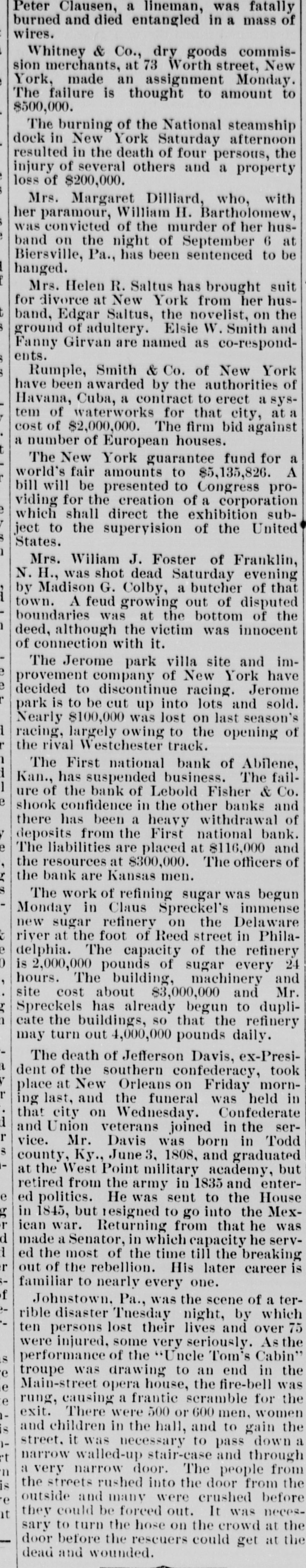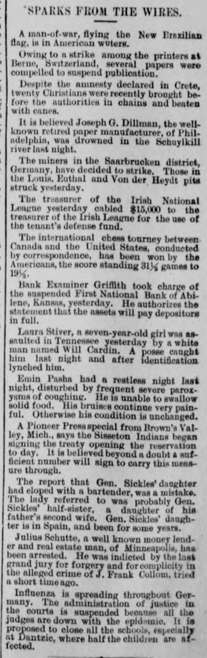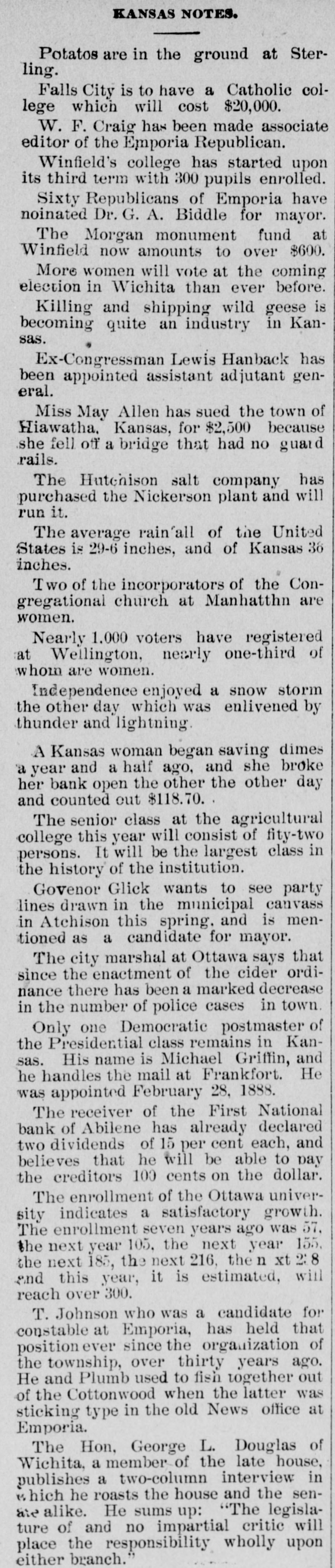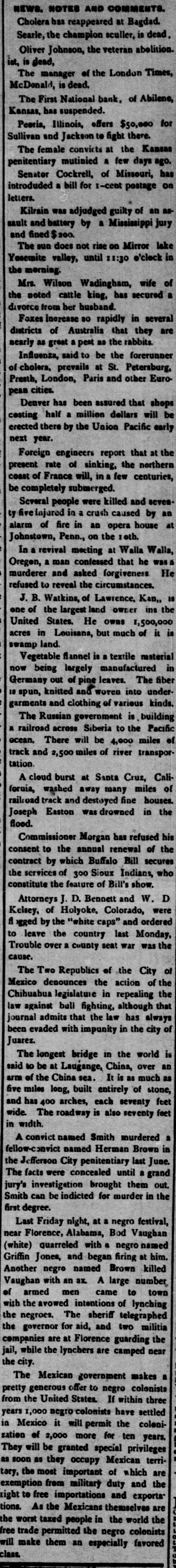 Cholera has reappeared at Bagdad. Searle, the champion sculler, is dead. Oliver Johnson, the veteran abolition. ist, is glead, The manager of the London Times, McDonald, is dead. The First National bank, of Abilene, Kansas, has suspended. Peoria, Illinois, offers $50,000 for Sullivan and Jackson to fight there. The female convicts at the Kansas penitentiary mutinied a few days ago, Senator Cockrell, of Missouri, has introduded a bill for I-cent postage on letters. Kilrain was adjudged guilty of an assault and battery by a Mississippi jury and fined $200. The sun does not rise on Mirror lake Yosemite valley, until 11:30 e'clock in the merning. Mrs. Wilson Wadingham, wife of the noted cattle king, has secured a divorce from her husband. Foxes increase so rapidly in several districts of Australia that they are nearly as great a pest as the rabbits. Influenza, said to be the forerunner of cholera, prevails at St. Petersburg, Presth, London, Paris and other European cities. Denver has been assured that shops costing half a million dellars will be erected there by the Union Pacific early next year. Foreign engineers report that at the present rate of sinking, the northern coast of France will, in a few centuries, be completely submerged. Several people were killed and sevenfive injured in a crush caused by an alarm of fire in an opera house at Johnstown, Penn., on the 10th. In a revival meeting at Walla Walla, Oregon, a man confessed that he was a murderer and asked forgiveness. He refused to reveal the circumstances. J. B. Watkins, of Lawrence, Kan,, IS one of the largest land owner ins the United States. He owns 1,500,000 acres in Louisana, but much of it is swamp land. Vegetable flannel is a textile material now being largely manufactured in Germany out of pine leaves. The fiber IS spun, knitted and woren into undergarments and clothing of various kinds. The Russian government is building a railroad across Siberia to the Pacific ocean. There will be 4,000 miles of track and 2,500 miles of river transportation. A cloud burst at Santa Cruz, Califoruia, washed away many miles of railroad track and destoyed fine houses. Joseph Easton was drowned in the flood. Commissioner Morgan has refused his consent to the annual renewal of the contract by which Buffalo Bill secures the services of 300 Sioux Indians, who constitute the feature of Bill's show. Attorneys J. D. Bennett and W. D Kelsey, of Holyoke, Colorado, were fl >gged by the "white caps" and ordered to leave the country last Monday, Trouble over a county seat war was the cause. The Two Republics of the City of Mexico denounces the action of the Chibuabua legislature in repealing the law against ball fighting, although that journal admits that the law has always been evaded with impunity in the city of Juarez. The longest bridge in the world is said to be at Laugange, China, over an arm of the China sea. It is as much as five miles long, built entirely of stone, and has 400 arches, each seventy feet wide. The roadway is also seventy feet in width. A convict named Smith murdered a fellow-convict named Herman Brown in the Jefferson City penitentiary last June. The facts were concealed until a grand jury's investigation brought them out. Smith can be indicted for murder in the first degree. Last Friday night, at a negro festival, near Florence, Alabama, Bod Vaughan (white) quarreled with a negro named Griffin Jones, and began firing at him. Another negro named Brown killed Vaughan with an ax. A large number of armed men came to town with the avowed intentions of lynching the negroes. The sheriff telegraphed the governor for aid, and two militia companies are at Florence guarding the jail, while the lynchers are camped near the city. The Mexican government makes a pretty generous offer to negro colonists from the United States. If within three years 1,000 negro colonists have settled in Mexico it will permit the colonization of 2,000 more for ten years. They will be granted special privileges as soon as they occupy Mexican territary, the most important of which are exemption from military duty and the right to free importations and exportations. As the Mexicans themselves are the worst taxed people in the world the free trade permitted the negro colonists will make them an especially favored class.
