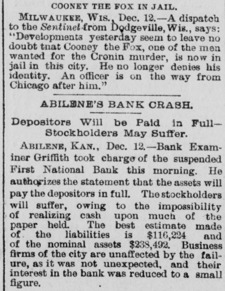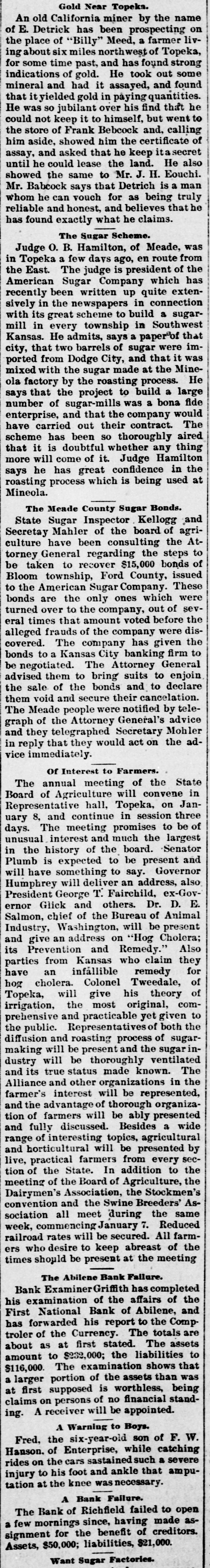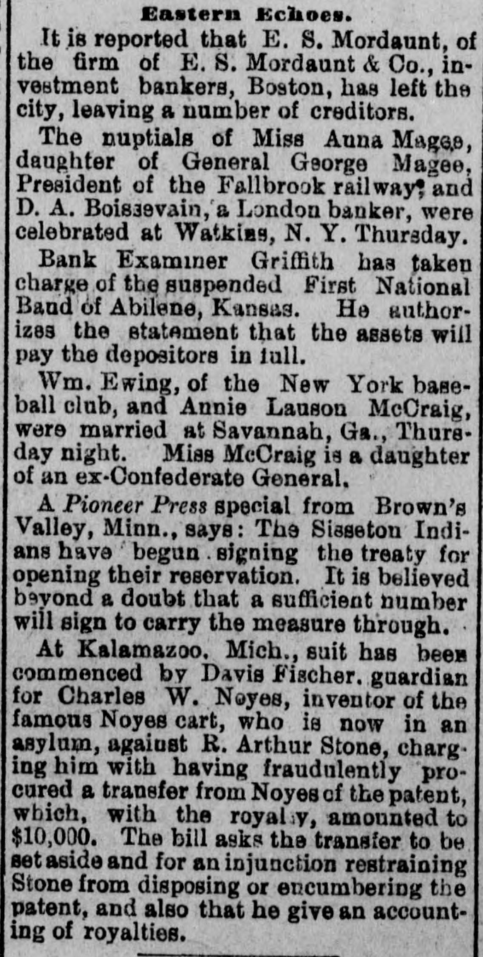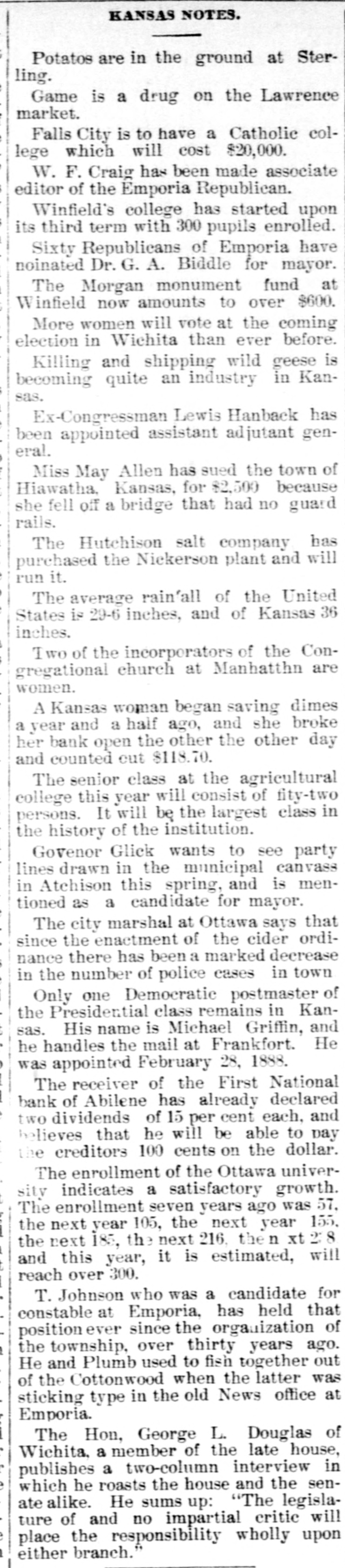 Cholera has reappeared at Bagdad. Searle, the champion sculler, is dead. Oliver Johnson, the veteran abolition. ist, is glead, The manager of the London Times, McDonald, is dead. The First National bank, of Abilene, Kansas, has suspended. Peoria, Illinois, offers $50,000 for Sullivan and Jackson to fight there. The female convicts at the Kansas penitentiary mutinied a few days ago, Senator Cockrell, of Missouri, has introduded a bill for I-cent postage on letters. Kilrain was adjudged guilty of an assault and battery by a Mississippi jury and fined $200. The sun does not rise on Mirror lake Yosemite valley, until 11:30 e'clock in the merning. Mrs. Wilson Wadingham, wife of the noted cattle king, has secured a divorce from her husband. Foxes increase so rapidly in several districts of Australia that they are nearly as great a pest as the rabbits. Influenza, said to be the forerunner of cholera, prevails at St. Petersburg, Presth, London, Paris and other European cities. Denver has been assured that shops costing half a million dellars will be erected there by the Union Pacific early next year. Foreign engineers report that at the present rate of sinking, the northern coast of France will, in a few centuries, be completely submerged. Several people were killed and sevenfive injured in a crush caused by an alarm of fire in an opera house at Johnstown, Penn., on the 10th. In a revival meeting at Walla Walla, Oregon, a man confessed that he was a murderer and asked forgiveness. He refused to reveal the circumstances. J. B. Watkins, of Lawrence, Kan,, IS one of the largest land owner ins the United States. He owns 1,500,000 acres in Louisana, but much of it is swamp land. Vegetable flannel is a textile material now being largely manufactured in Germany out of pine leaves. The fiber IS spun, knitted and woren into undergarments and clothing of various kinds. The Russian government is building a railroad across Siberia to the Pacific ocean. There will be 4,000 miles of track and 2,500 miles of river transportation. A cloud burst at Santa Cruz, Califoruia, washed away many miles of railroad track and destoyed fine houses. Joseph Easton was drowned in the flood. Commissioner Morgan has refused his consent to the annual renewal of the contract by which Buffalo Bill secures the services of 300 Sioux Indians, who constitute the feature of Bill's show. Attorneys J. D. Bennett and W. D Kelsey, of Holyoke, Colorado, were fl >gged by the "white caps" and ordered to leave the country last Monday, Trouble over a county seat war was the cause. The Two Republics of the City of Mexico denounces the action of the Chibuabua legislature in repealing the law against ball fighting, although that journal admits that the law has always been evaded with impunity in the city of Juarez. The longest bridge in the world is said to be at Laugange, China, over an arm of the China sea. It is as much as five miles long, built entirely of stone, and has 400 arches, each seventy feet wide. The roadway is also seventy feet in width. A convict named Smith murdered a fellow-convict named Herman Brown in the Jefferson City penitentiary last June. The facts were concealed until a grand jury's investigation brought them out. Smith can be indicted for murder in the first degree. Last Friday night, at a negro festival, near Florence, Alabama, Bod Vaughan (white) quarreled with a negro named Griffin Jones, and began firing at him. Another negro named Brown killed Vaughan with an ax. A large number of armed men came to town with the avowed intentions of lynching the negroes. The sheriff telegraphed the governor for aid, and two militia companies are at Florence guarding the jail, while the lynchers are camped near the city. The Mexican government makes a pretty generous offer to negro colonists from the United States. If within three years 1,000 negro colonists have settled in Mexico it will permit the colonization of 2,000 more for ten years. They will be granted special privileges as soon as they occupy Mexican territary, the most important of which are exemption from military duty and the right to free importations and exportations. As the Mexicans themselves are the worst taxed people in the world the free trade permitted the negro colonists will make them an especially favored class.