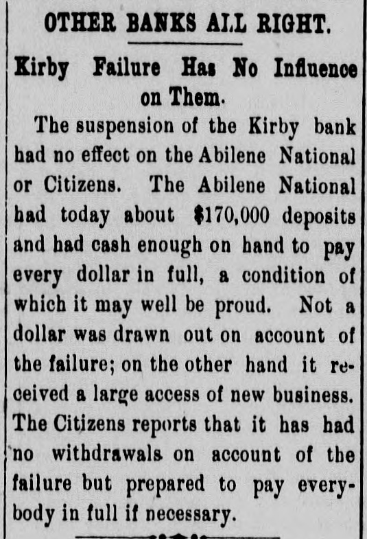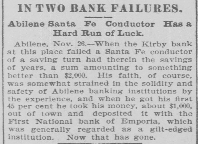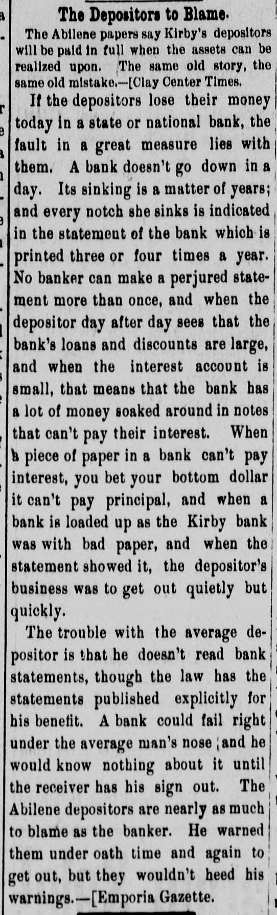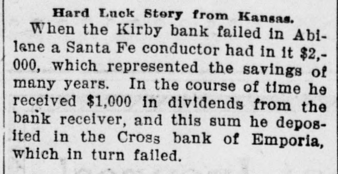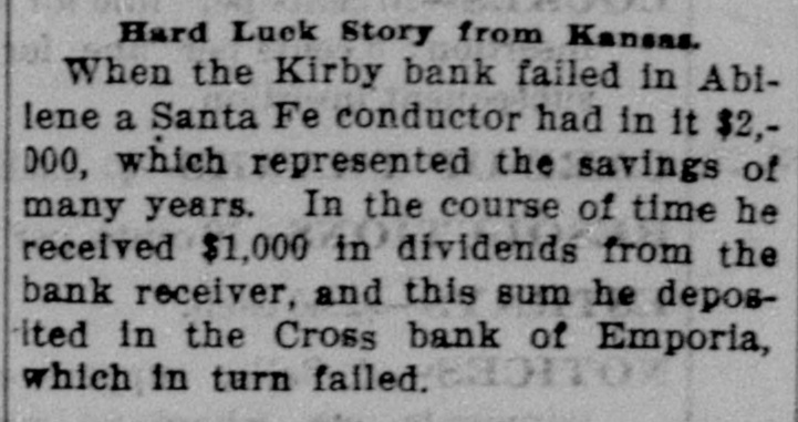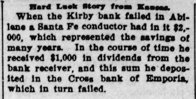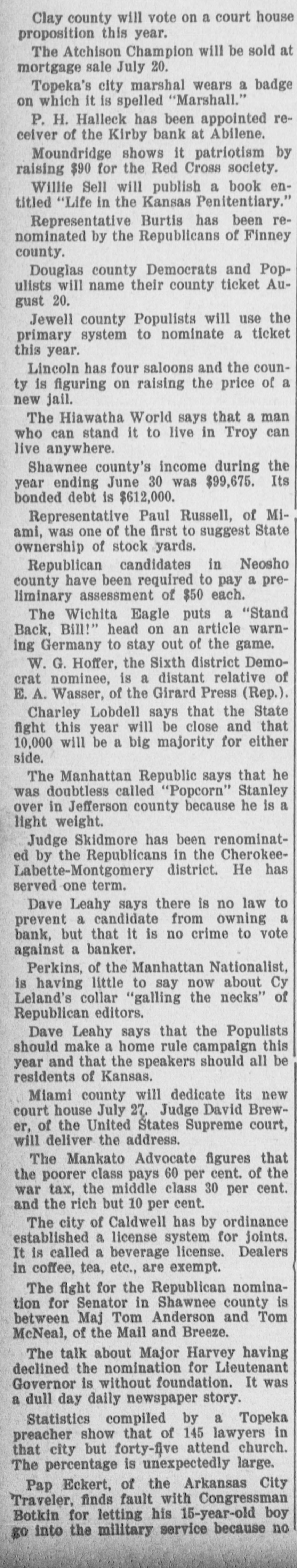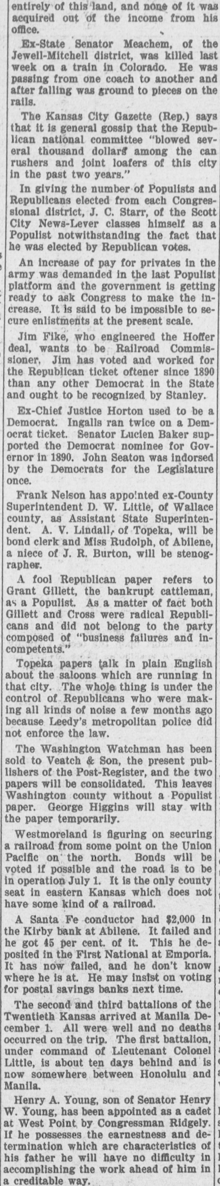 entirely of this land, and none of it was acquired out of the income from his office. Ex-State Senator Meachem, of the Jewell-Mitchell district, was killed last week on a train in Colorado. He was passing from one coach to another and after falling was ground to pieces on the rails. The Kansas City Gazette (Rep.) says that it is general gossip that the Republican national committee "blowed several thousand dollars among the can rushers and joint loafers of this city in the past two years." In giving the number of Populists and Republicans elected from each Congressional district, J. C. Starr, of the Scott City News-Lever classes himself as a Populist notwithstanding the fact that he was elected by Republican votes. An increase of pay for privates in the army was demanded in the last Populist platform and the government is getting ready to ask Congress to make the increase. It is said to be impossible to secure enlistments at the present scale. Jim Fike, who engineered the Hoffer deal, wants to be Railroad Commissioner, Jim has voted and worked for the Republican ticket oftener since 1890 than any other Democrat in the State and ought to be recognized by Stanley. Ex-Chief Justice Horton used to be a Democrat. Ingalls ran twice on a Democrat ticket. Senator Lucien Baker supported the Democrat nominee for Governor in 1890. John Seaton was indorsed by the Democrats for the Legislature once. Frank Nelson has appointed ex-County Superintendent D. W. Little, of Wallace county, as Assistant State Superintendent. A. V. Lindall, of Topeka, will be bond clerk and Miss Rudolph, of Abilene, a niece of J. R. Burton, will be stenographer. A fool Republican paper refers to Grant Gillett, the bankrupt cattleman, as a Populist. As a matter of fact both Gillett and Cross were radical Republicans and did not belong to the party composed of "business failures and incompetents." Topeka papers talk in plain English about the saloons which are running in that city. The whole thing is under the control of Republicans who were making all kinds of noise a few months ago because Leedy's metropolitan police did not enforce the law. The Washington Watchman has been sold to Veatch & Son, the present publishers of the Post-Register, and the two papers will be consolidated. This leaves Washington county without a Populist paper. George Higgins will stay with the paper temporarily. Westmoreland is figuring on securing a railroad from some point on the Union Pacific on the north. Bonds will be voted if possible and the road is to be in operation July 1. It is the only county seat in eastern Kansas which does not have some kind of a railroad. A Santa Fe conductor had $2,000 in the Kirby bank at Abilene. It failed and he got 45 per cent. of it. This he deposited in the First National at Emporia. It has now failed, and he don't know where he is at. He may insist on voting for postal savings banks next time. The second and third battalions of the Twentieth Kansas arrived at Manila December 1. All were well and no deaths occurred on the trip. The first battalion, under command of Lieutenant Colonel Little, is about ten days behind and is now somewhere between Honolulu and Manila. Henry A. Young, son of Senator Henry W. Young, has been appointed as a cadet at West Point by Congressman Ridgely. If he possesses the earnestness and determination which are characteristics of his father he will have no difficulty in accomplishing the work ahead of him in a creditable way.