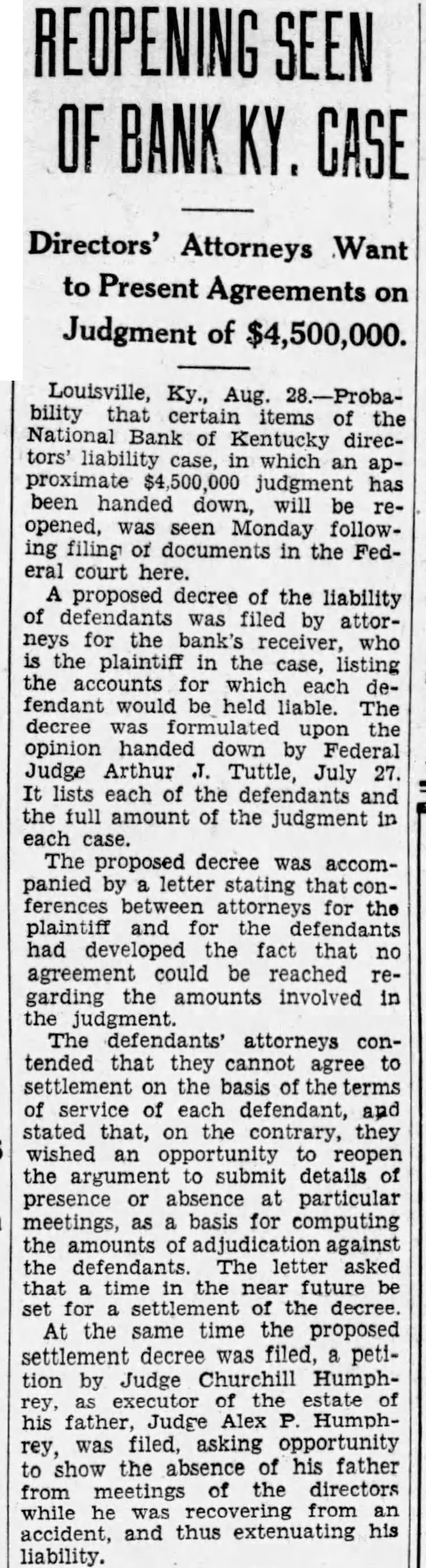REOPENING Directors' Attorneys Want to Present Agreements on Judgment of $4,500,000. Louisville, Ky., Aug. 28.-Probability that certain items of the Bank of Kentucky directors' liability case, which an apjudgment has been handed down, will be reopened, was seen Monday following filing documents in the Federal court here. proposed decree of the liability of defendants was filed by attorneys for the bank's receiver, who the plaintiff in the case, listing the accounts for which each defendant would be held liable. The decree was formulated upon the opinion handed down by Federal Judge Arthur Tuttle, July 27. It lists each of the defendants and the full amount of the judgment in each case. The proposed decree was accompanied by letter stating that conferences between attorneys for the plaintiff and for the defendants had developed the fact that no agreement could be reached regarding the amounts involved in the judgment. The defendants' attorneys contended that they cannot agree to settlement on the basis of terms of service each defendant, and stated that, on the contrary, they wished an opportunity reopen the argument to submit details of presence absence at particular meetings, as basis for computing the amounts of adjudication against the defendants The letter asked that time the near future be set for settlement of the At the same time the proposed settlement decree was filed, petition by Judge Churchill Humphexecutor of the estate of his father, Judge Alex Humphrey, was filed, asking opportunity to show the absence of his father from meetings the directors while he was recovering from accident, and thus extenuating liability.