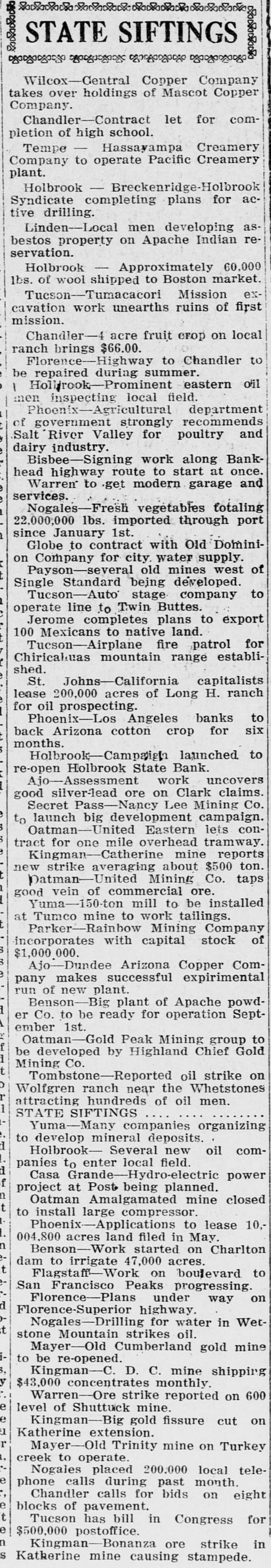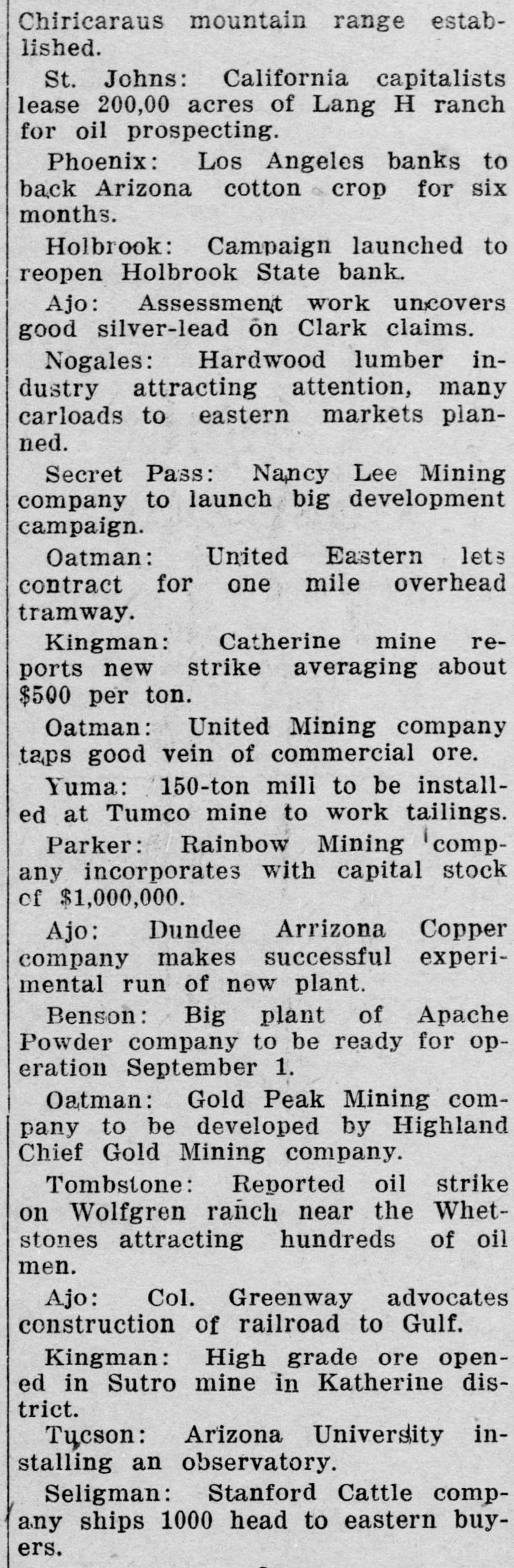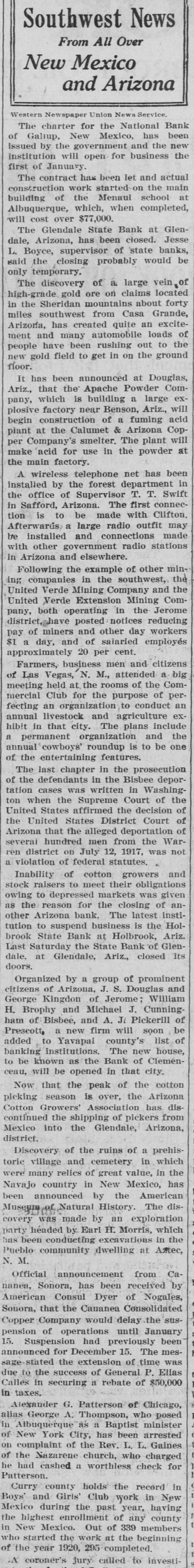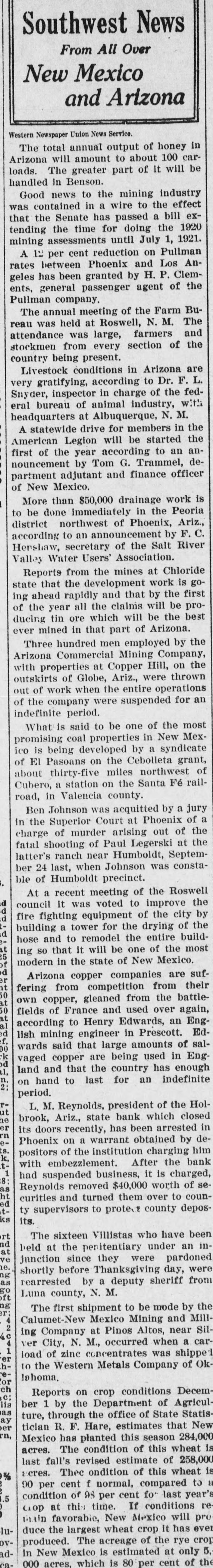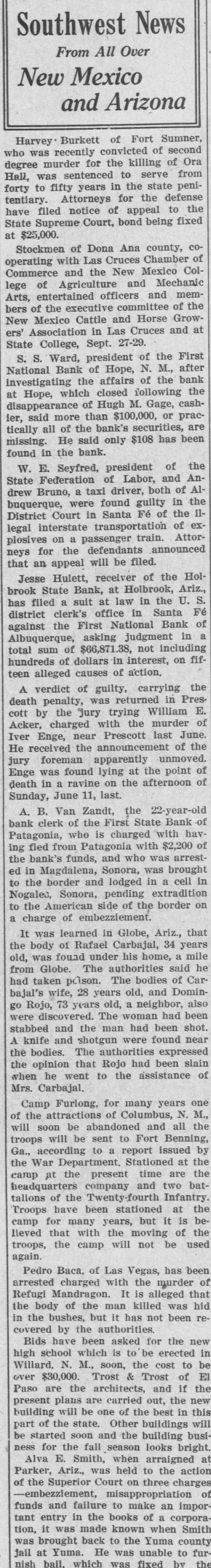 Southwest News From All Over New Mexico and Arizona Harvey Burkett of Fort Summer, second was recently convicted of who murder for the killing of from Ora degree was sentenced to serve peniHall, to fifty years in the state defense forty tentiary. Attorneys for the the have filed notice of appeal to fixed State Supreme Court, bond being at $25,000. Stockmen of Dona Ana county, co- of operating with Las Cruces Chamber ColCommerce and the New Mexico of Agriculture and Mechanic memlege entertained officers and of the Arts, of the executive committee New bers Mexico Cattle and Horse Growers' Association in Las Cruces and at State College, Sept. 27-29. S. S. Ward, president of the First after National Bank of Hope, N. M., investigating the affairs of the bank the Hope, which closed following disappearance at of Hugh M. Gage, cashsaid more than $100,000, or pracier, tically all of the bank's securities, been are missing. He said only $108 has found in the bank. W. E. Seyfred, president of An- the State Federation of Labor, and drew Bruno, a taxi driver, both of the Albuquerque, were found guilty in District Court in Santa Fé of the illegal interstate transportation of Attor- explosives on a passenger train. neys for the defendants announced that an appeal will be filed. Jesse Hulett, receiver of the Holbrook State Bank, at Holbrook, Ariz., has filed a suit at law in the U. Fé S. district clerk's office in Santa against the First National Bank of Albuquerque, asking judgment in a total sum of $66,871.38, not including hundreds of dollars in interest, on fifteen alleged causes of action. A verdict of guilty, carrying the death penalty, was returned in Pres- E. cott by the jury trying William Acker, charged with the murder of Iver Enge, near Prescott last June. He received the announcement of the jury foreman apparently unmoved. Enge was found lying at the point of death in a ravine on the afternoon of Sunday, June 11, last. A. B. Van Zandt, the 22-year-old bank clerk of the First State Bank of Patagonia, who is charged with having fled from Patagonia with $2,200 of the bank's funds, and who was arrested in Magdalena, Sonora, was brought to the border and lodged in a cell in Nogales, Sonora, pending extradition to the American side of the border on a charge of embezzlement. It was learned in Globe, Ariz., that the body of Rafael Carbajal, 34 years was found under his home, a mile The old, from Globe. authorities bodies said of Car- he had taken pcison. The wife, 28 years old, and 73 years old, a go bajal's Rojo, neighbor, Domin- been also were discovered. The woman had and the man had A and shotgun were stabbed knife found been shot. near the bodies. The authorities expressed the opinion that Rojo had been slain when he went to the assistance of Mrs. Carbajal. Camp Furlong, for many years one of the attractions of Columbus, N. M., will soon be abandoned and all the troops will be sent to Fort Benning, Ga., to a report the War according Department. Stationed time issued at the the by at the present are company two of the headquarters camp talions Twenty-fourth and Infantry. batTroops have been stationed at the camp for many years, but it is believed that with the moving of the troops, the camp will not be used again. Pedro Baca, of Las Vegas, has been arrested charged with the murder of Refugi Mandragon. It is alleged that the body of the man killed was hid in the bushes, but it has not been recovered by the authorities. have been asked for new which is to be erected in high Bids school the Willard, N. M., soon, the cost to be Trost & over $30,000. Trost of if the El Paso are the architects, and present plans are carried out, the new building will be one of the best in this part of the state. Other buildings will be started soon and the building business for the fall season looks bright. Alva E. Smith, when arraigned at was to Parker, Ariz., held three the action of the Superior Court on charges -embezzlement, misappropriation of funds and failure to make an important entry in the books of a corporait was made known when Smith was to the county tion, brought back Yuma jail at Yuma. He was unable to furnish bail. which was fixed by the
