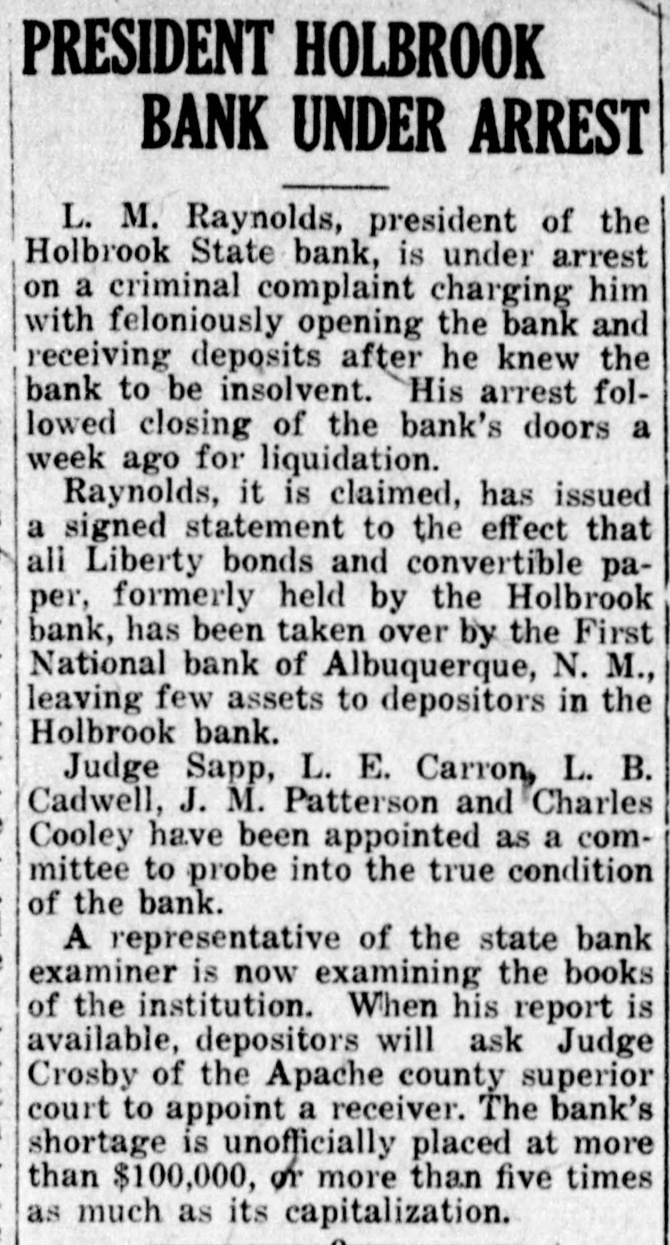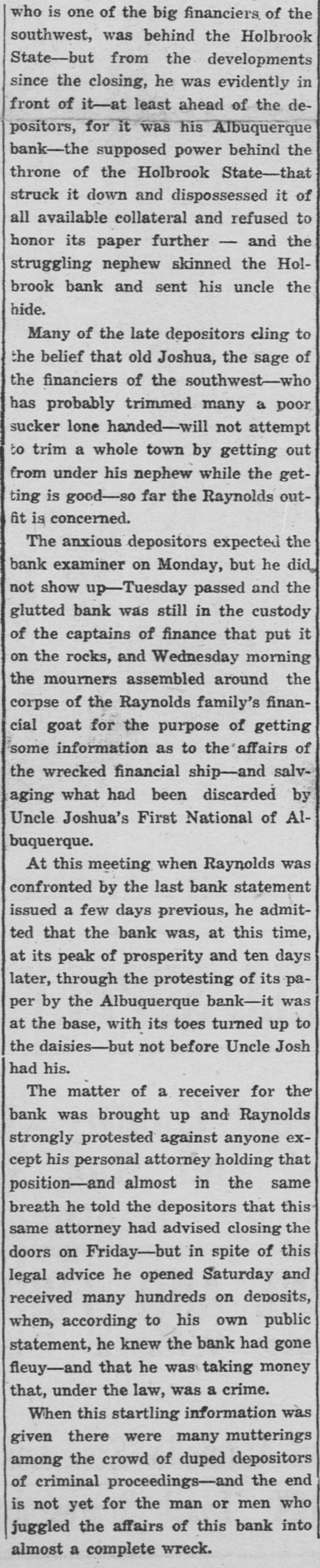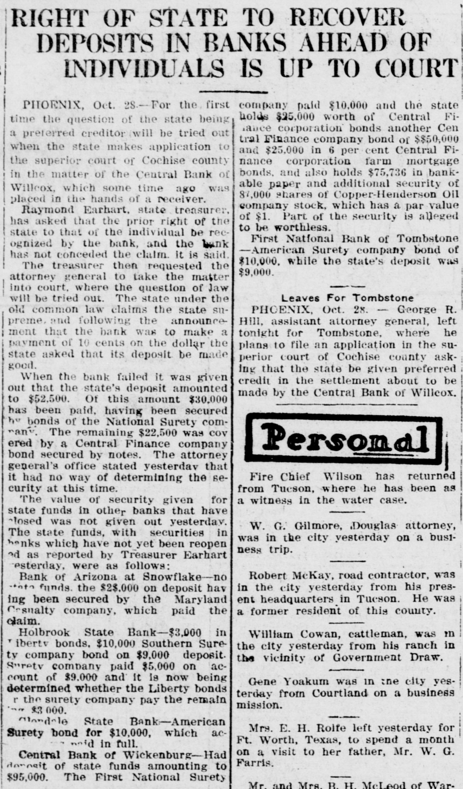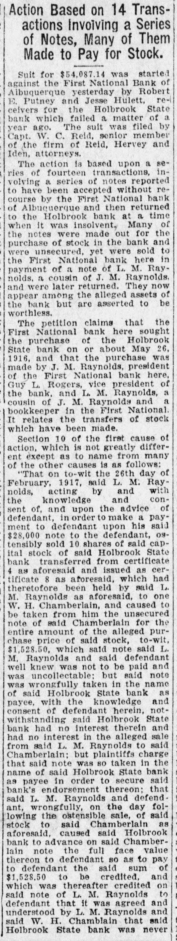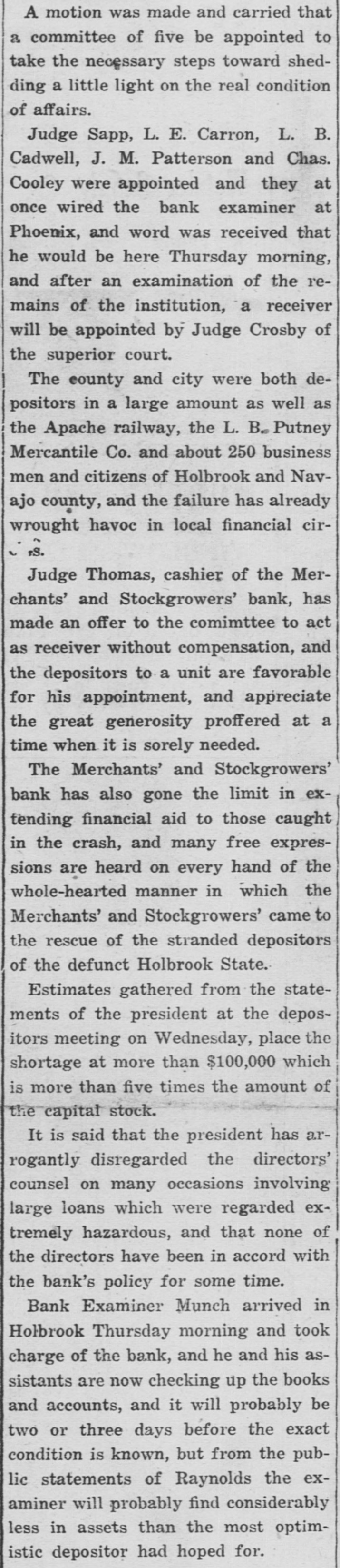 Southwest News From All Over New Mexico and Arizona Harvey Burkett of Fort Summer, second was recently convicted of who murder for the killing of from Ora degree was sentenced to serve peniHall, to fifty years in the state defense forty tentiary. Attorneys for the the have filed notice of appeal to fixed State Supreme Court, bond being at $25,000. Stockmen of Dona Ana county, co- of operating with Las Cruces Chamber ColCommerce and the New Mexico of Agriculture and Mechanic memlege entertained officers and of the Arts, of the executive committee New bers Mexico Cattle and Horse Growers' Association in Las Cruces and at State College, Sept. 27-29. S. S. Ward, president of the First after National Bank of Hope, N. M., investigating the affairs of the bank the Hope, which closed following disappearance at of Hugh M. Gage, cashsaid more than $100,000, or pracier, tically all of the bank's securities, been are missing. He said only $108 has found in the bank. W. E. Seyfred, president of An- the State Federation of Labor, and drew Bruno, a taxi driver, both of the Albuquerque, were found guilty in District Court in Santa Fé of the illegal interstate transportation of Attor- explosives on a passenger train. neys for the defendants announced that an appeal will be filed. Jesse Hulett, receiver of the Holbrook State Bank, at Holbrook, Ariz., has filed a suit at law in the U. Fé S. district clerk's office in Santa against the First National Bank of Albuquerque, asking judgment in a total sum of $66,871.38, not including hundreds of dollars in interest, on fifteen alleged causes of action. A verdict of guilty, carrying the death penalty, was returned in Pres- E. cott by the jury trying William Acker, charged with the murder of Iver Enge, near Prescott last June. He received the announcement of the jury foreman apparently unmoved. Enge was found lying at the point of death in a ravine on the afternoon of Sunday, June 11, last. A. B. Van Zandt, the 22-year-old bank clerk of the First State Bank of Patagonia, who is charged with having fled from Patagonia with $2,200 of the bank's funds, and who was arrested in Magdalena, Sonora, was brought to the border and lodged in a cell in Nogales, Sonora, pending extradition to the American side of the border on a charge of embezzlement. It was learned in Globe, Ariz., that the body of Rafael Carbajal, 34 years was found under his home, a mile The old, from Globe. authorities bodies said of Car- he had taken pcison. The wife, 28 years old, and 73 years old, a go bajal's Rojo, neighbor, Domin- been also were discovered. The woman had and the man had A and shotgun were stabbed knife found been shot. near the bodies. The authorities expressed the opinion that Rojo had been slain when he went to the assistance of Mrs. Carbajal. Camp Furlong, for many years one of the attractions of Columbus, N. M., will soon be abandoned and all the troops will be sent to Fort Benning, Ga., to a report the War according Department. Stationed time issued at the the by at the present are company two of the headquarters camp talions Twenty-fourth and Infantry. batTroops have been stationed at the camp for many years, but it is believed that with the moving of the troops, the camp will not be used again. Pedro Baca, of Las Vegas, has been arrested charged with the murder of Refugi Mandragon. It is alleged that the body of the man killed was hid in the bushes, but it has not been recovered by the authorities. have been asked for new which is to be erected in high Bids school the Willard, N. M., soon, the cost to be Trost & over $30,000. Trost of if the El Paso are the architects, and present plans are carried out, the new building will be one of the best in this part of the state. Other buildings will be started soon and the building business for the fall season looks bright. Alva E. Smith, when arraigned at was to Parker, Ariz., held three the action of the Superior Court on charges -embezzlement, misappropriation of funds and failure to make an important entry in the books of a corporait was made known when Smith was to the county tion, brought back Yuma jail at Yuma. He was unable to furnish bail. which was fixed by the