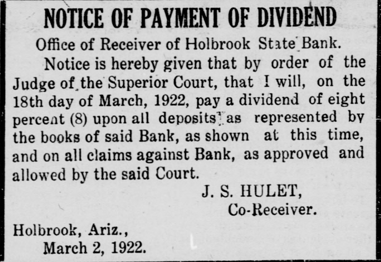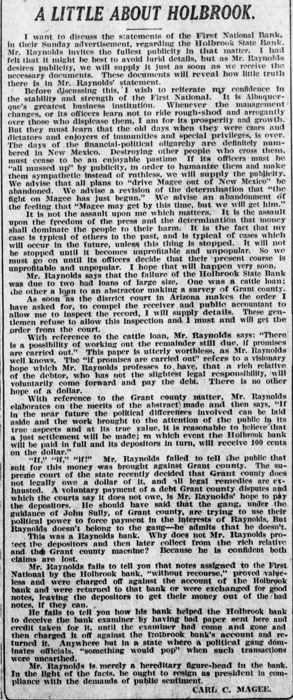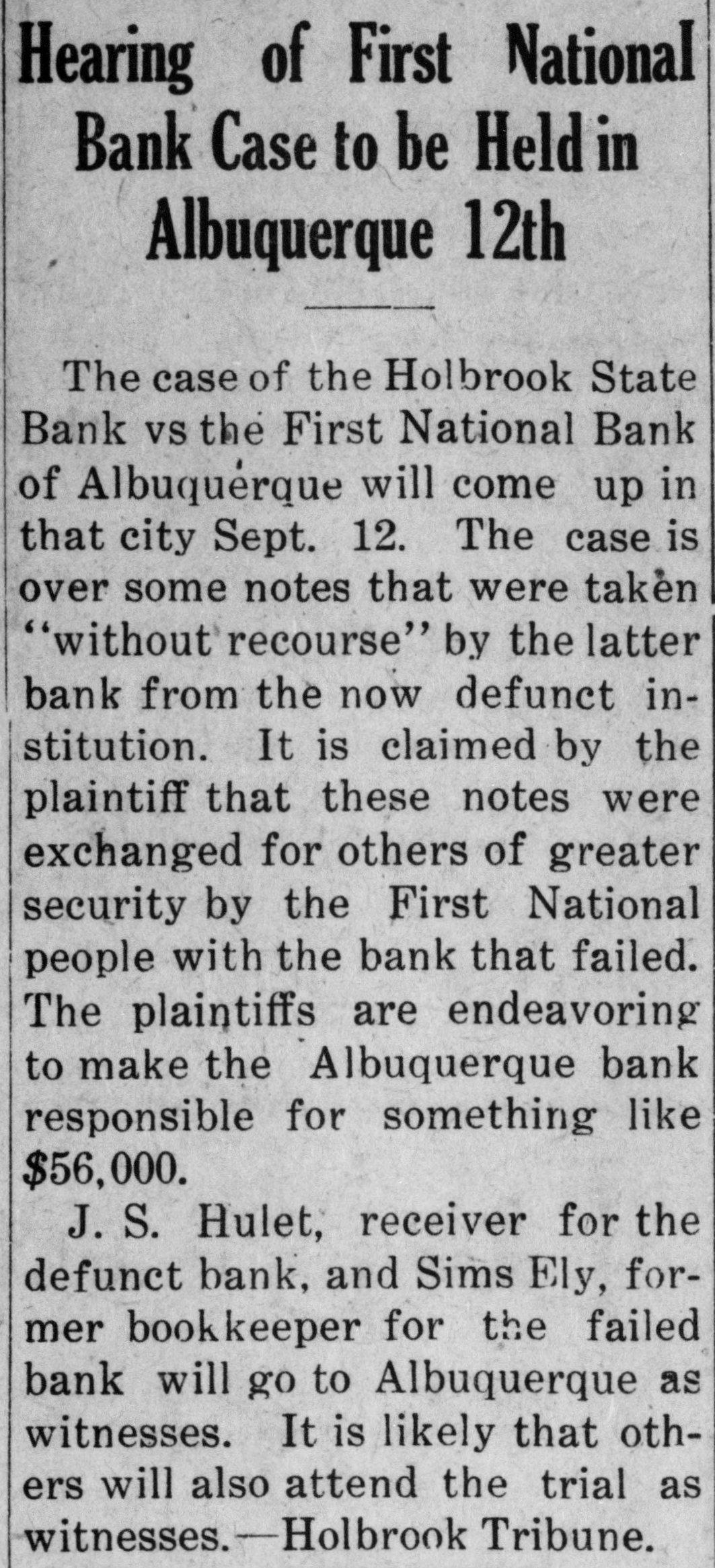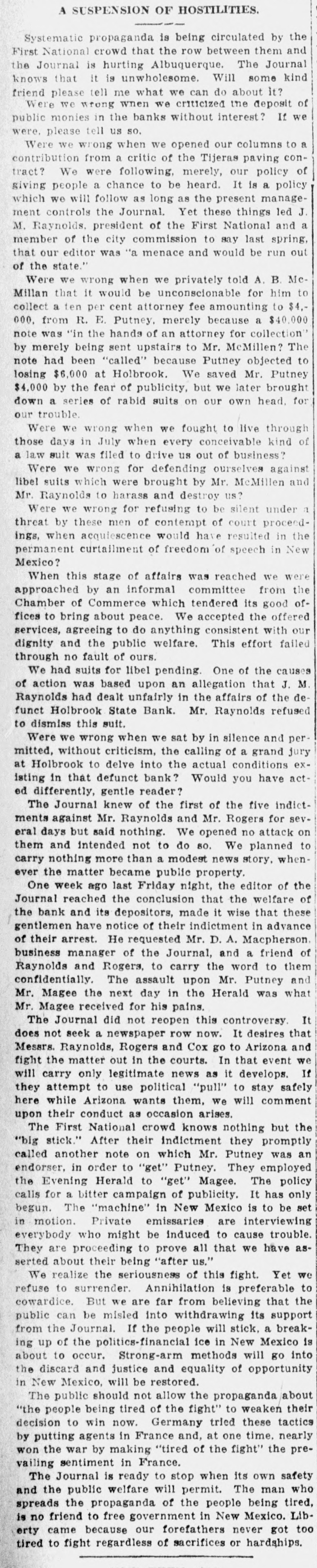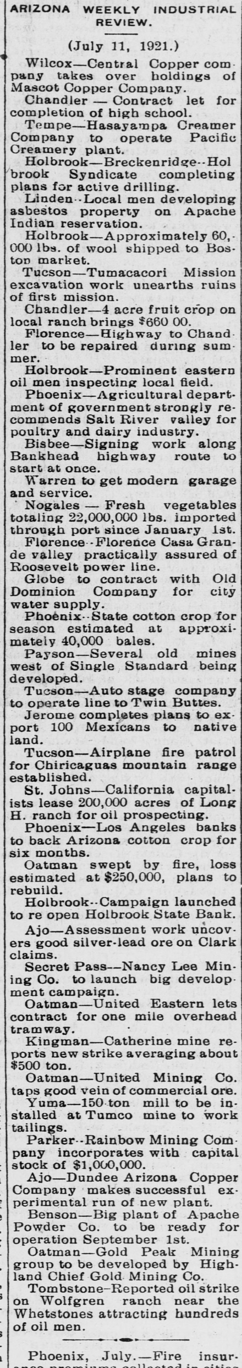 Southwest News From All Over New Mexico and Arizona Harvey Burkett of Fort Summer, second was recently convicted of who murder for the killing of from Ora degree was sentenced to serve peniHall, to fifty years in the state defense forty tentiary. Attorneys for the the have filed notice of appeal to fixed State Supreme Court, bond being at $25,000. Stockmen of Dona Ana county, co- of operating with Las Cruces Chamber ColCommerce and the New Mexico of Agriculture and Mechanic memlege entertained officers and of the Arts, of the executive committee New bers Mexico Cattle and Horse Growers' Association in Las Cruces and at State College, Sept. 27-29. S. S. Ward, president of the First after National Bank of Hope, N. M., investigating the affairs of the bank the Hope, which closed following disappearance at of Hugh M. Gage, cashsaid more than $100,000, or pracier, tically all of the bank's securities, been are missing. He said only $108 has found in the bank. W. E. Seyfred, president of An- the State Federation of Labor, and drew Bruno, a taxi driver, both of the Albuquerque, were found guilty in District Court in Santa Fé of the illegal interstate transportation of Attor- explosives on a passenger train. neys for the defendants announced that an appeal will be filed. Jesse Hulett, receiver of the Holbrook State Bank, at Holbrook, Ariz., has filed a suit at law in the U. Fé S. district clerk's office in Santa against the First National Bank of Albuquerque, asking judgment in a total sum of $66,871.38, not including hundreds of dollars in interest, on fifteen alleged causes of action. A verdict of guilty, carrying the death penalty, was returned in Pres- E. cott by the jury trying William Acker, charged with the murder of Iver Enge, near Prescott last June. He received the announcement of the jury foreman apparently unmoved. Enge was found lying at the point of death in a ravine on the afternoon of Sunday, June 11, last. A. B. Van Zandt, the 22-year-old bank clerk of the First State Bank of Patagonia, who is charged with having fled from Patagonia with $2,200 of the bank's funds, and who was arrested in Magdalena, Sonora, was brought to the border and lodged in a cell in Nogales, Sonora, pending extradition to the American side of the border on a charge of embezzlement. It was learned in Globe, Ariz., that the body of Rafael Carbajal, 34 years was found under his home, a mile The old, from Globe. authorities bodies said of Car- he had taken pcison. The wife, 28 years old, and 73 years old, a go bajal's Rojo, neighbor, Domin- been also were discovered. The woman had and the man had A and shotgun were stabbed knife found been shot. near the bodies. The authorities expressed the opinion that Rojo had been slain when he went to the assistance of Mrs. Carbajal. Camp Furlong, for many years one of the attractions of Columbus, N. M., will soon be abandoned and all the troops will be sent to Fort Benning, Ga., to a report the War according Department. Stationed time issued at the the by at the present are company two of the headquarters camp talions Twenty-fourth and Infantry. batTroops have been stationed at the camp for many years, but it is believed that with the moving of the troops, the camp will not be used again. Pedro Baca, of Las Vegas, has been arrested charged with the murder of Refugi Mandragon. It is alleged that the body of the man killed was hid in the bushes, but it has not been recovered by the authorities. have been asked for new which is to be erected in high Bids school the Willard, N. M., soon, the cost to be Trost & over $30,000. Trost of if the El Paso are the architects, and present plans are carried out, the new building will be one of the best in this part of the state. Other buildings will be started soon and the building business for the fall season looks bright. Alva E. Smith, when arraigned at was to Parker, Ariz., held three the action of the Superior Court on charges -embezzlement, misappropriation of funds and failure to make an important entry in the books of a corporait was made known when Smith was to the county tion, brought back Yuma jail at Yuma. He was unable to furnish bail. which was fixed by the