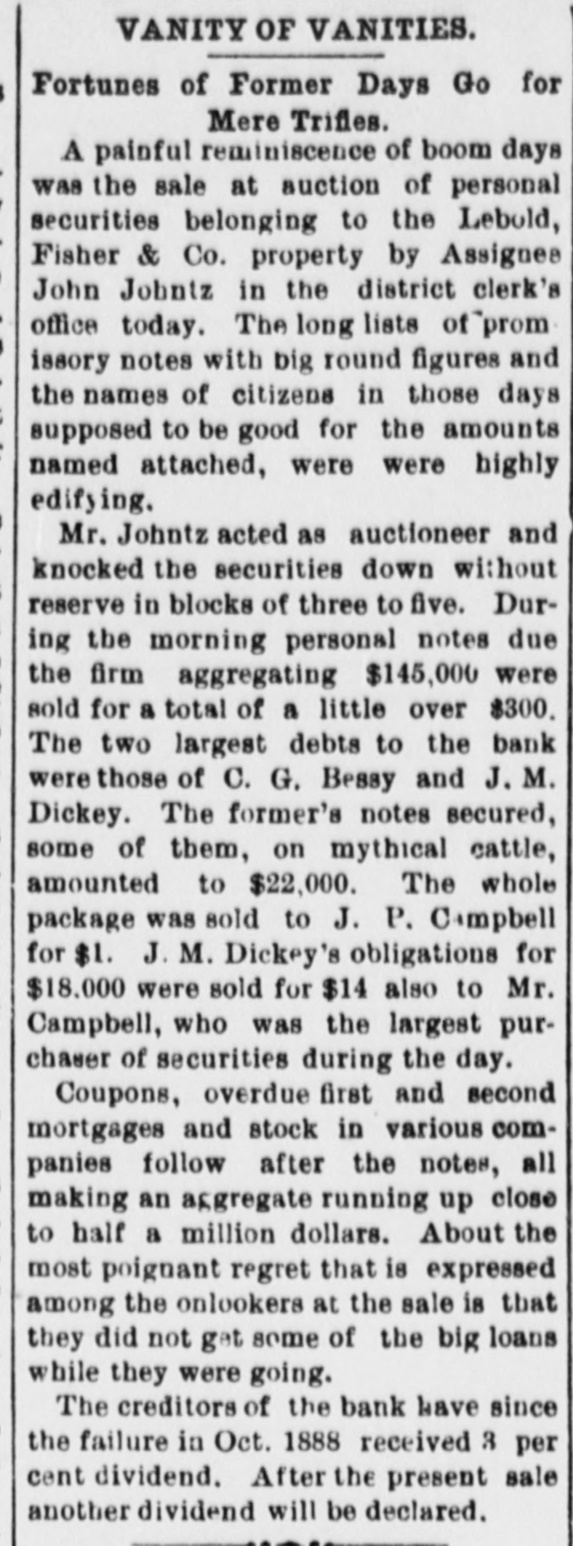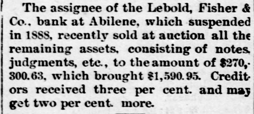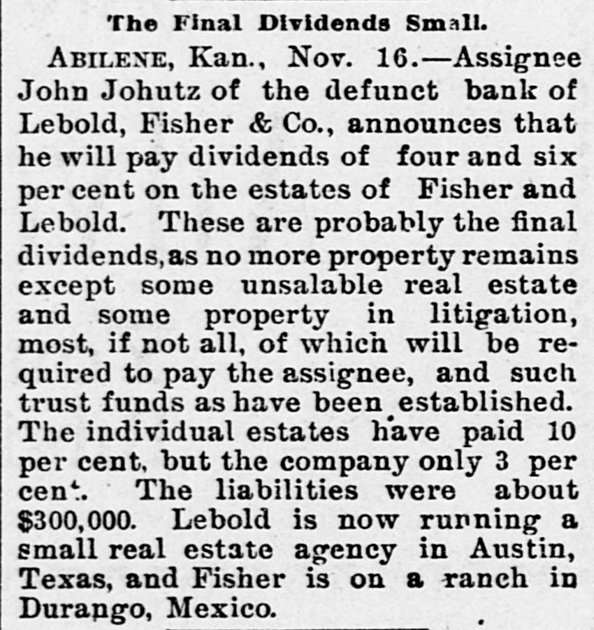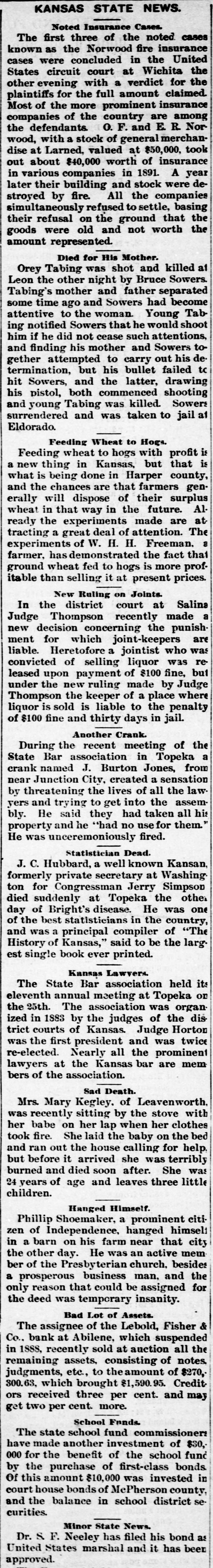 RECENT REFLECTIONS. -Dan Hornaday says the present State administration is on its last legs. -Harry Morley, Jefferson township, lost two heifers last week from running in the cornstalks. -Mrs. Hickey, the Chapman woman who has been in jail for liquor selling, was released today. -Wm. M. Purdy, of Abilene, and Laura Blanchett, of Herington, have been granted a license to wed. -John Mallaly who had so pernicious a habit of getting goods by impersonating someone else, was released from jail yesterday. -Mr. and Mrs. W. H. Anderson are moving from the Johns house just purchased by G. G. Huffman to rooms over Shane & Emig's. -Solomon City announces that at its next hop the "butterfly swing" dance will be one of the floor evolutions. It ought to prove very attractive. -Janitor Holzworth, of the court house, is building a storm _shed over the doer of the engine room of the jail, a much needed improvement. -Supt. Shirk's' new paper, School and Home, for December shows a decided advancement. It will be an invaluable aid to the educational interests of the county. -Grant Gaines, formerly of the county high school, has gone east to get married. When he returns he will take D. D. Hornaday's place in* the State house in Topeka. -D. D. Hornaday is enjoying a "snap." Although he has been discharged from the State superintendent's office his salary goes on until Jan. 1st but he is not working any. -The Fortnightly enjoyed progressive whist, dancing and a delectable lunch at the home of Mr. and Mrs. O.L. Moore last evening. The club meets next with Mr. and Mrs. J. B. Warfield Dec. 26. -The Abilene bank assets of Lebold, Fisher & Co. will be sold Jan. 22 by Assignee John Juhntz. The list of notes, stocks, mortgages etc. would about fill this paper if printed in fine type, but it would make "mighty interestin' readin'." -Districts No. 81, 61, 21, 36, 42, 53 and 49 have fine new school houses erected this season. The moral effect on the pupils has been already been observed. Pleasant surroundings are necessary in order to reach the highest development of the finer, purer nature. -[School and Home. -Solomon Sentinel: The county commissioners of Saline located the site for the new bridge over the Solomon river last week. It is about 50 feet south of the Union Pacific railroad bridge. This new route will be quite a boon to farmers living due west and northwest of our city and is expected to be ready for use next April. -In a decision against the Kansas Farmers Fire Insurance company the supreme court has just decided that. "Where & dwelling house is insured and the policy by mistake, misdescribes the land on which the house is situated this will not of itself affect the risk, or render the policy void and it is not necessary to reform the policy in case of a loss to recover thereon." -A large life like photograph in Forney's show case which attracts much attention and is greatly admired is that of Mr. and Mrs. J.S. Troxel, two of Dickiuson's popular and handsome young people. Mrs. Troxel is in her bridal array, while her husband sits near reading with pleased expression the notice of their marriage in the DAILY REFLECTOR. It is evident that Mr. Troxel knows a good thing when he 8008 it and a couple that starts out with such good literature in the family cannot help prospering. -A letter just received from Capt. Wm. Waring, with whom REFLECTOR readers have become acquainted through his excellent letters to this paper, tells of the burning of his ship while passing through Suez canal, Nov. 1. The ship was loaded with sugar and was proceeding through the canal by electric light when it was found to be on fire. Although fire boats filled the hold with water the ship continued to burn like coal and was destroyed. Capt. Waring lost all his clothing, instruments and many valu able curios which he was taking home. He will probably take charge of another vessel. Mr. J. P. Blaize, an extensive real estate dealer in Des Moines. Lowa