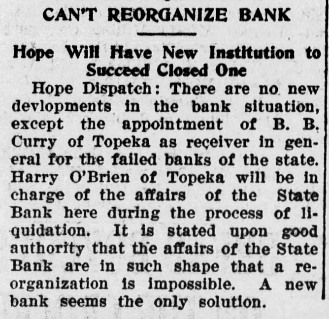 CAN'T REORGANIZE BANK Hope Will Have New Institution to Succeed Closed One Hope Dispatch: There are no new devlopments in the bank situation, except the appointment of B. B. Curry of Topeka as receiver in general for the failed banks of the state. Harry O'Brien of Topeka will be in charge of the affairs of the State Bank here during the process of liquidation. It is stated upon good authority that the affairs of the State Bank are in such shape that a reorganization is impossible. A new bank seems the only solution.