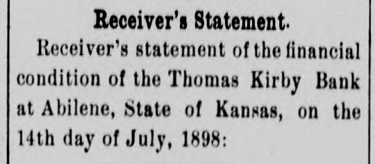 Receiver's Statement. Receiver's statement of the financial condition of the Thomas Kirby Bank at Abilene, State of Kansas, on the 14th day of July, 1898: