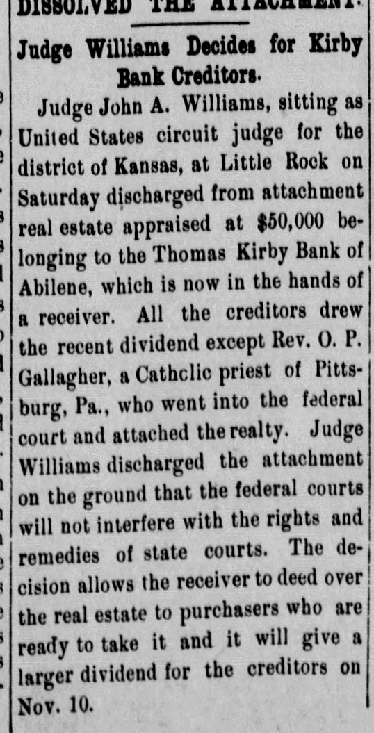 DISSOLVED Judge Williams Decides for Kirby Bank Creditors. Judge John A. Williams, sitting as United States circuit judge for the district of Kansas, at Little Rock on Saturday discharged from attachment real estate appraised at $50,000 belonging to the Thomas Kirby Bank of Abilene, which is now in the hands of a receiver. All the creditors drew the recent dividend except Rev. O.P. Gallagher, a Cathclic priest of Pittsburg, Pa., who went into the federal court and attached the realty. Judge Williams discharged the attachment on the ground that the federal courts will not interfere with the rights and remedies of state courts. The decision allows the receiver to deed over the real estate to purchasers who are ready to take it and it will give a larger dividend for the creditors on Nov. 10.