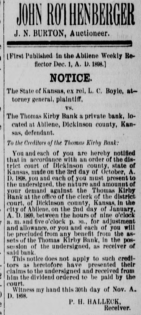 JOHN ROTHENBERGER J. N. BURTON, Auctioneer. [First Published in the Abliene Weekly Reflector Dec. 1, A. D. 1898.] NOTICE. The State of Kansas, ex rel, L. C. Boyle, attorney general, plaintiff, vs. The Thomas Kirby Bank a private bank, located at Abilene, Dickinson county, Kansas, defendant. To the Creditors of the Thomas Kirby Bank: You and each of you are hereby notified that in accordance with an order of the district court of Dickinson county, state of Kansas, made on the 3rd day of October, A. D. 1898, you and each of you must present to the undersigned, the nature and amount of your demand against the Thomas Kirby Bank at the office of the clerk of the district court, of Dickinson county, Kansas, in the city of Abilene, on the 2nd day of January, A. D. 1899, between the hours of nine o'clock a. m. and five o'clock p. M., for adjustment and allowance, or you and each of you will be precluded from any benefit from the assets of the Thomas Kirby Bank, in the possession of the undersigned, as receiver of said bank. This notice does not apply to such creditors as heretofore have presented their claims to the undersigned and received from him the dividend ordered to be paid by the court. Witness my hand this 30th day of Nov. A. D. 1898. P. H. HALLECK. Receiver.