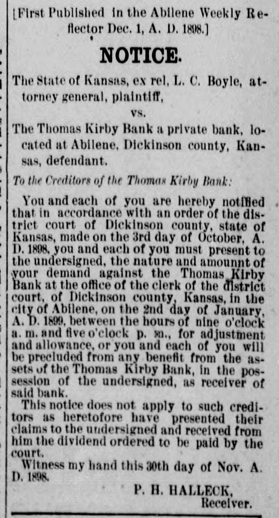 [First Published in the Abilene Weekly Reflector Dec. 1, A. D. 1898.] NOTICE. The State of Kansas, ex rel, L. C. Boyle, attorney general, plaintiff, vs. The Thomas Kirby Bank a private bank, located at Abilene, Dickinson county, Kansas, defendant. To the Creditors of the Thomas Kirby Bank: You and each of you are hereby notified that in accordance with an order of the district court of Dickinson county, state of Kansas, made on the 3rd day of October, A. D. 1898. you and each of you must present to the undersigned, the nature and amounnt of your demand against the Thomas Kirby Bank at the office of the clerk of the district court, of Dickinson county, Kansas, in the city of Abilene, on the 2nd day of January, A. D. 1899, between the hours of nine o'clock I a. m. and five o'clock p. m., for adjustment and allowance, or you and each of you will ) be precluded from any benefit from the assets of the Thomas Kirby Bank, in the possession of the undersigned, as receiver of said bank. This notice does not apply to such creditors as heretofore have presented their claims to the undersigned and received from him the dividend ordered to be paid by the court. Witness my hand this 30th day of Nov. A. D. 1898. P. H. HALLECK, Receiver.