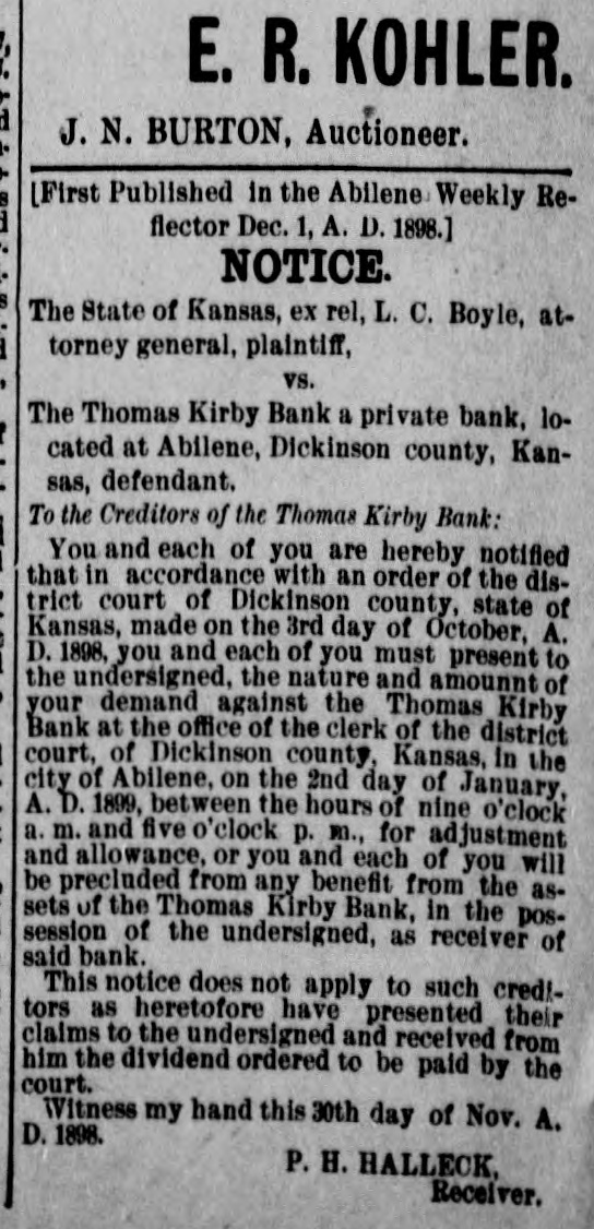 E. R. KOHLER. J. N. BURTON, Auctioneer. [First Published in the Abilene Weekly Reflector Dec. 1, A. D. 1898.] NOTICE. The State of Kansas, ex rel, L. C. Boyle, attorney general, plaintiff, vs. The Thomas Kirby Bank a private bank, located at Abilene, Dickinson county, Kansas, defendant. To the Creditors of the Thomas Kirby Bank: You and each of you are hereby notified that in accordance with an order of the district court of Dickinson county, state of Kansas, made on the 3rd day of October, A. D. 1898, you and each of you must present to the undersigned, the nature and amounnt of your demand against the Thomas Kirby Bank at the office of the clerk of the district court, of Dickinson county, Kansas, In the city of Abilene, on the 2nd day of January, A. D. 1899, between the hours of nine o'clock a. m. and five o'clock p. m., for adjustment and allowance, or you and each of you will be precluded from any benefit from the assets of the Thomas Kirby Bank, in the possession of the undersigned, as receiver of said bank. This notice does not apply to such creditors as heretofore have presented their claims to the undersigned and received from him the dividend ordered to be paid by the court. Witness my hand this 30th day of Nov. A. D. 1898. P. H. HALLECK, Receiver.