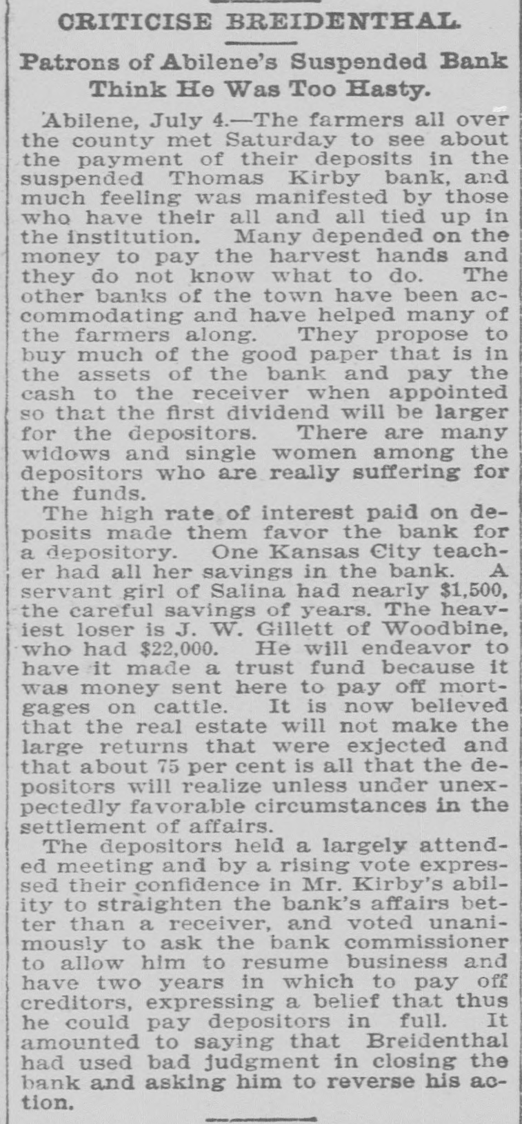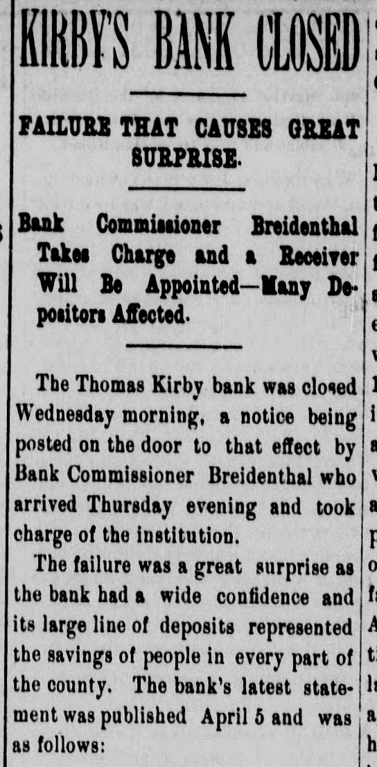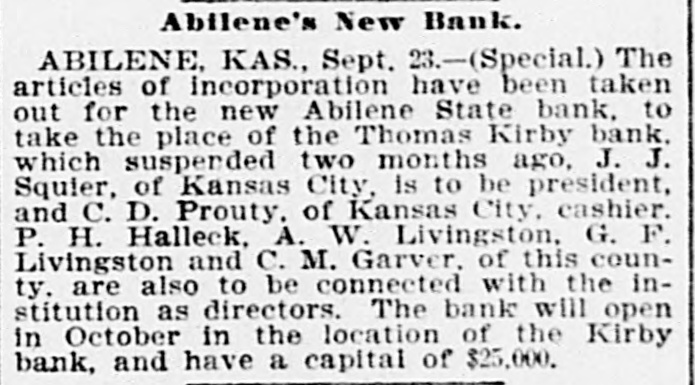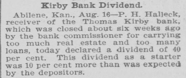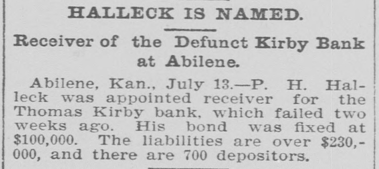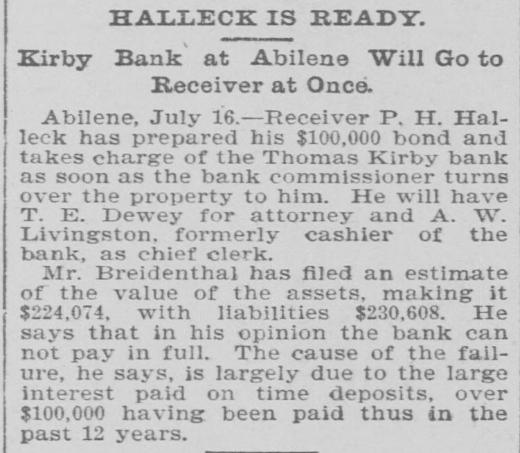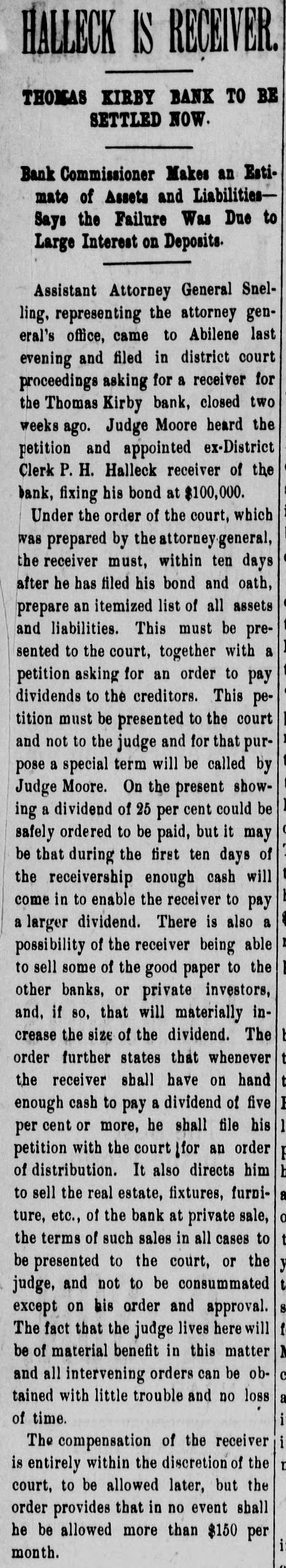 HALLECK IS RECEIVER. THOMAS KIRBY BANK TO BE SETTLED NOW. Bank Commissioner Makes an Estimate of Assets and Liabilities Says the Failure Was Due to Large Interest on Deposits. Assistant Attorney General Snelling, representing the attorney general's office, came to Abilene last evening and filed in district court proceedings asking for a receiver for the Thomas Kirby bank, closed two weeks ago. Judge Moore heard the petition and appointed ex-District Clerk P. H. Halleck receiver of the bank, fixing his bond at $100,000. Under the order of the court, which was prepared by the attorney general, the receiver must, within ten days after he has filed his bond and oath, prepare an itemized list of all assets and liabilities. This must be presented to the court, together with a petition asking for an order to pay dividends to the creditors. This petition must be presented to the court and not to the judge and for that purpose a special term will be called by Judge Moore. On the present showing a dividend of 25 per cent could be safely ordered to be paid, but it may be that during the first ten days of the receivership enough cash will come in to enable the receiver to pay a larger dividend. There is also a possibility of the receiver being able to sell some of the good paper to the other banks, or private investors, and, if so, that will materially increase the size of the dividend. The t order further states that whenever t the receiver shall have on hand I enough cash to pay a dividend of five 1 per cent or more, he shall file his petition with the court for an order of distribution. It also directs him to sell the real estate, fixtures, furniture, etc., of the bank at private sale, the terms of such sales in all cases to be presented to the court, or the y judge, and not to be consummated except on his order and approval. f The fact that the judge lives here will be of material benefit in this matter 1 c and all intervening orders can be obtained with little trouble and no loss a of time. i The compensation of the receiver n is entirely within the discretion of the court, to be allowed later, but the order provides that in no event shall he be allowed more than $150 per i month.