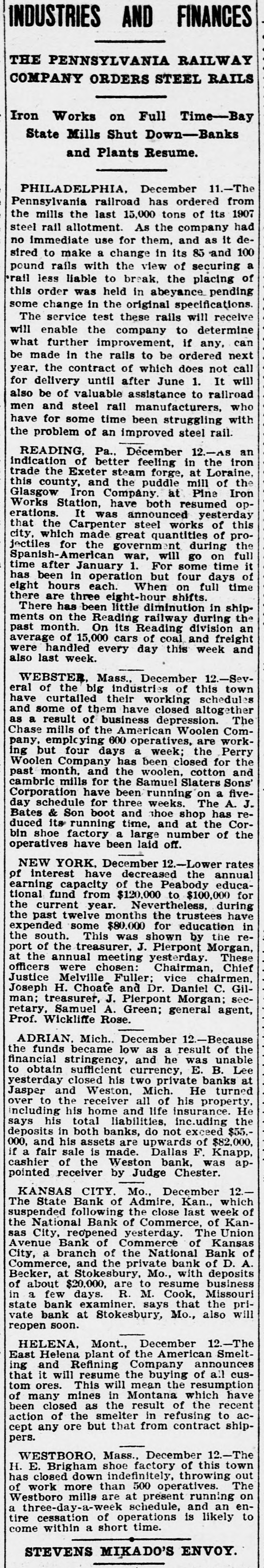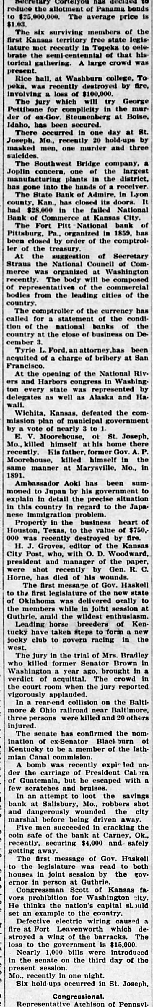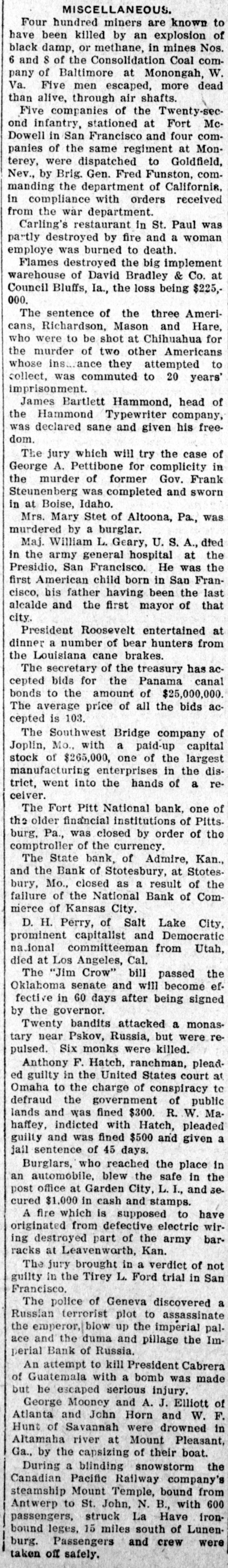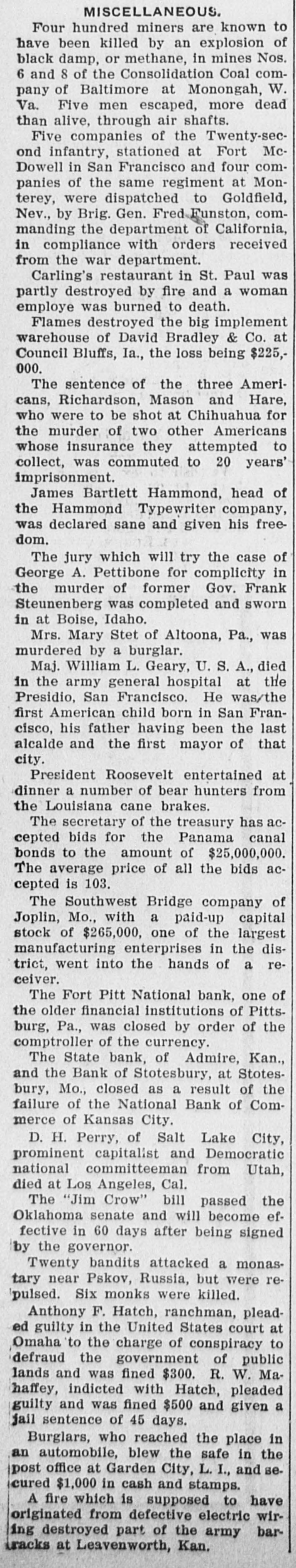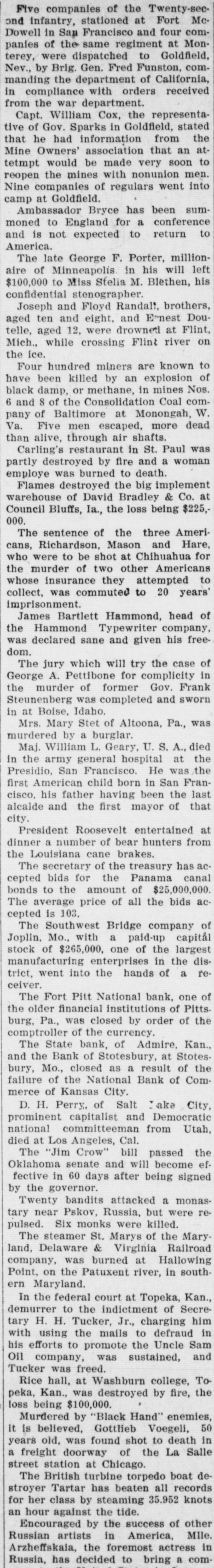 Five companies of the Twenty-secand infantry, stationed at Fort McDowell in San Francisco and four companies of the same regiment at Monterey, were dispatched to Goldfield, Nev., by Brig. Gen. Fred Funston, commanding the department of California, in compliance with orders received from the war department. Capt. William Cox, the representative of Gov. Sparks in Goldfield, stated that he had information from the Mine Owners' association that an attetmpt would be made very soon to reopen the mines with nonunion men. Nine companies of regulars went into camp at Goldfield. Ambassador Bryce has been summoned to England for a conference and is not expected to return to America. The late George F. Porter, millionaire of Minneapolis in his will left $100,000 to Miss Stelia M. Blethen, his confidential stenographer. Joseph and Floyd Randal!, brothers, aged ten and eight, and Ernest Doutelle, aged 12, were drowned at Flint, Mich., while crossing Flint river on the ice. Four hundred miners are known to have been killed by an explosion of black damp, or methane, in mines Nos. 6 and 8 of the Consolidation Coal company of Baltimore at Monongah, W. Va. Five men escaped, more dead than alive, through air shafts. Carling's restaurant in St. Paul was partly destroyed by fire and a woman employe was burned to death. Flames destroyed the big implement warehouse of David Bradley & Co. at Council Bluffs, Ia., the loss being $225,000. The sentence of the three Americans, Richardson, Mason and Hare, who were to be shot at Chihuahua for the murder of two other Americans whose insurance they attempted to collect, was commuted to 20 years imprisonment. James Bartlett Hammond, head of the Hammond Typewriter company, was declared sane and given his freedom. The jury which will try the case of George A. Pettibone for complicity in the murder of former Gov. Frank Steunenberg was completed and sworn in at Boise, Idaho. Mrs. Mary Stet of Altoona, Pa., was murdered by a burglar. Maj. William L. Geary, U. S. A., died in the army general hospital at the Presidio, San Francisco. He was the first American child born in San Francisco, his father having been the last alcalde and the first mayor of that city. President Roosevelt entertained at dinner a number of bear hunters from the Louisiana cane brakes. The secretary of the treasury has accepted bids for the Panama canal bonds to the amount of $25,000,000. The average price of all the bids accepted is 103. The Southwest Bridge company of Joplin, Mo., with a paid-up capital stock of $265,000, one of the largest manufacturing enterprises in the district, went into the hands of a receiver. The Fort Pitt National bank, one of the older financial institutions of Pitts. burg, Pa., was closed by order of the comptroller of the currency. The State bank, of Admire, Kan., and the Bank of Stotesbury, at Stotesbury, Mo., closed as a result of the failure of the National Bank of Commerce of Kansas City. D. H. Perry, of Salt Take City, prominent capitalist and Democratic national committeeman from Utah, died at Los Angeles, Cal. The "Jim Crow" bill passed the Oklahoma senate and will become effective in 60 days after being signed by the governor. Twenty bandits attacked a monastary near Pskov, Russia, but were repulsed. Six monks were killed. The steamer St. Marys of the Maryland, Delaware & Virginia Railroad company, was burned at Hallowing Point, on the Patuxent river, in southern Maryland. In the federal court at Topeka, Kan., demurrer to the indictment of Secretary H. H. Tucker, Jr., charging him with using the mails to defraud in his efforts to promote the Uncle Sam Oil company, was sustained, and Tucker was freed. Rice hall, at Washburn college, Topeka, Kan., was destroyed by fire, the loss being $100,000. Murdered by "Black Hand" enemies, it is believed, Gottlieb Voegeli, 50 years old, was found shot to death in a freight doorway of the La Salle street station at Chicago. The British turbine torpedo boat destroyer Tartar has beaten all records for her class by steaming 35.952 knots an hour against the tide. Encouraged by the success of other Russian artists in America. Mlle.