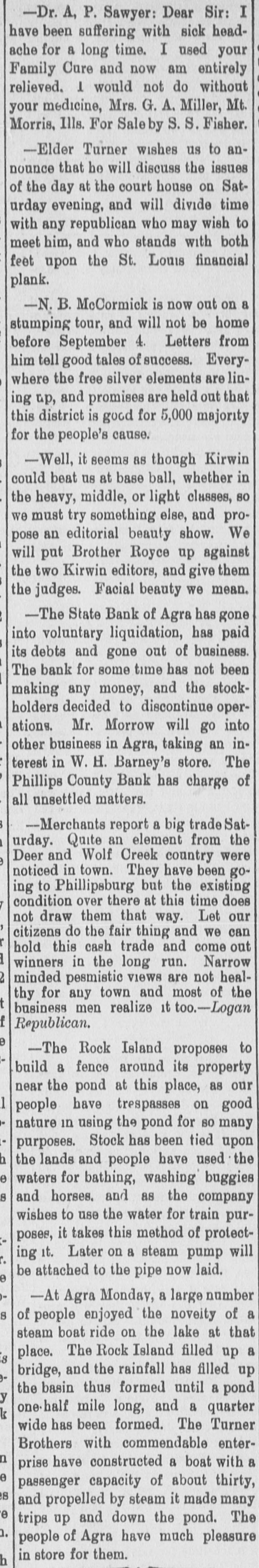 -Dr. A, P. Sawyer: Dear Sir: I have been suffering with sick headache for a long time. I used your Family Cure and now am entirely relieved. 1 would not do without your medicine, Mrs. G. A. Miller, Mt. Morris, Ills. For Sale by S. S. Fisher. -Elder Turner wishes us to announce that he will discuss the issues of the day at the court house on Saturday evening, and will divide time with any republican who may wish to meet him, and who stands with both feet upon the St. Louis financial plank. -N. B. McCormick is now out on a stumping tour, and will not be home before September 4. Letters from him tell good tales of success. Everywhere the free silver elements are lining up, and promises are held out that this district is good for 5,000 majority for the people's cause. -Well, it seems as though Kirwin could beat us at base ball, whether in the heavy, middle, or light classes, so we must try something else, and propose an editorial beauty show. We will put Brother Royce up against the two Kirwin editors, and give them the judges. Facial beauty we mean. -The State Bank of Agra has gone into voluntary liquidation, has paid its debts and gone out of business. The bank for some time has not been making any money, and the stockholders decided to discontinue operations. Mr. Morrow will go into other business in Agra, taking an interest in W. H. Barney's store. The Phillips County Bank has charge of all unsettled matters. -Merchants report a big trade Saturday. Quite an element from the Deer and Wolf Creek country were noticed in town. They have been going to Phillipsburg but the existing condition over there at this time does not draw them that way. Let our citizens do the fair thing and we can hold this cash trade and come out winners in the long run. Narrow minded pesmistic views are not healthy for any town and most of the business men realize it too.-Logan Republican. -The Rock Island proposes to build a fence around its property near the pond at this place, as our people have trespasses on good nature in using the pond for so many purposes. Stock has been tied upon the lands and people have used the e waters for bathing, washing buggies S and horses. and as the company wishes to use the water for train purposes, it takes this method of protecting it. Later on a steam pump will be attached to the pipe now laid. -At Agra Monday, a large number S of people enjoyed the noveity of a steam boat ride on the lake at that place. The Rock Island filled up a S bridge, and the rainfall has filled up the basin thus formed until a pond y one-half mile long, and a quarter wide has been formed. The Turner Brothers with commendable entern prise have constructed a boat with a e passenger capacity of about thirty, IS and propelled by steam it made many trips up and down the pond. The people of Agra have much pleasure in store for them.