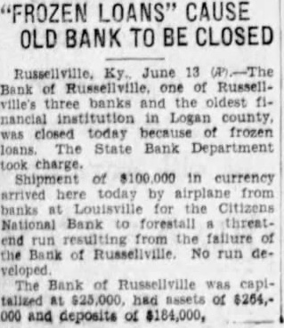Ky. June 13 Russellthree the county, today frozen State Bank charge. of currency today banks Louisville Citizens National Bank forestall threatrun failure of No run deThe Bank had of and deposits of $184,000,