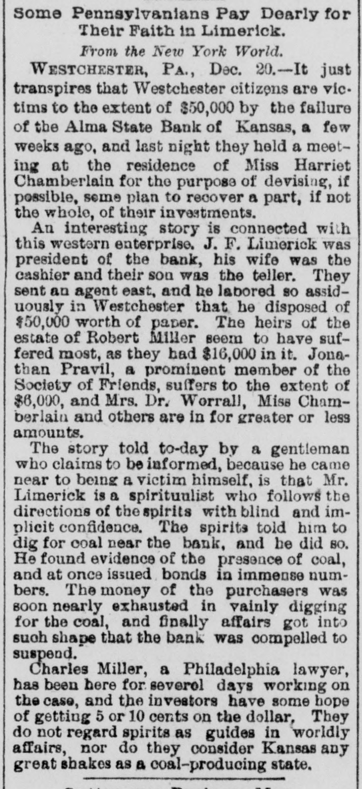 # Some Pennsylvanians Pay Dearly for Their Faith in Limerick. From the New York World. WESTCHESTER, PA., Dec. 20. -It just transpires that Westchester citizens are victims to the extent of $50,000 by the failure of the Alma State Bank of Kansas, a few weeks ago, and last night they held a meeting at the residence of Miss Harriet Chamberlain for the purpose of devising, if possible, seme plan to recover a part, if not the whole, of their investments. An interesting story is connected with this western enterprise. J. F. Limerick was president of the bank, his wife was the cashier and their son was the teller. They sent an agent east, and he labored so assiduously in Westchester that he disposed of $50,000 worth of paper. The heirs of the estate of Robert Miller seem to have suffered most, as they had $16,000 in it. Jonathan Pravil, a prominent member of the Society of Friends, suffers to the extent of $6,000, and Mrs. Dr. Worrall, Miss Chamberlain and others are in for greater or less amounts. The story told to-day by a gentleman who claims to be informed, because he came near to being a victim himself, is that Mr. Limerick is a spirituulist who follows the directions of the spirits with blind and implicit confidence. The spirits told him to dig for coal near the bank, and he did so. He found evidence of the presence of coal, and at once issued bonds in immense numbers. The money of the purchasers was soon nearly exhausted in vainly digging for the coal, and finally affairs got into such shape that the bank was compelled to suspend. Charles Miller, a Philadelphia lawyer, has been here for several days working on the case, and the investors have some hope of getting 5 or 10 cents on the dollar, They do not regard spirits as guides in worldly affairs, nor do they consider Kansas any great shakes as a coal-producing state.