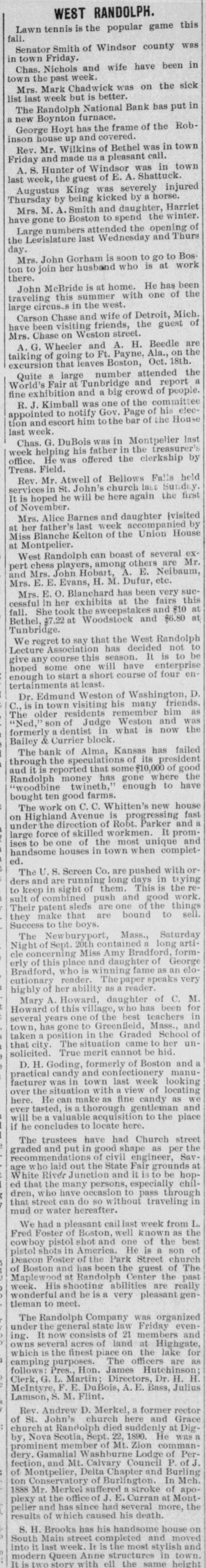 WEST RANDOLPH. Lawn tennis is the popular game this fall. Senator Smith of Windsor county was in town Friday. Chas. Nichols and wife have been in town the past week. Mrs. Mark Chadwick was on the sick list last week but is better. The Randolph National Bank has put in a new Boynton furnace. George Hoyt has the frame of the Robinson house up and covered. Rev. Mr. Wilkins of Bethel was in town Friday and made us a pleasant call. A. S. Hunter of Windsor was in town last week, the guest of E. A. Shattuck. Augustus King was severely injured Thursday by being kicked by a horse. Mrs. M. A. Smith and daughter, Harriet have gone to Boston to spend the winter. Large numbers attended the opening of the Legislature last Wednesday and Thursday. Mrs. John Gorham is soon to go to Boston to join her husband who is at work there. John McBride is at home. He has been traveling this summer with one of the large circus.s in the west. Carson Chase and wife of Detroit, Mich. have been visiting friends, the guest of Mrs. Chase on Weston street. A. G. Wheeler and A. H. Beedle are talking of going to Ft. Payne, Ala., on the excursion that leaves Boston, Oct. 18th. Quite a large number attended the World's Fair at Tunbridge and report a fine exhibition and a big crowd of people. R. J. Kimball was one of the committee appointed to notify Gov. Page of his election and escort him to the bar of the House last week. Chas. G. DuBois was in Montpelier last week helping his father in the treasurer's office. He was offered the clerkship by Treas. Field. Rev. Mr. Atwell of Bellows Falls held services in St. John's church last Sunday. It is hoped he will be here again the first of November. Mrs. Alice Barnes and daughter [visited at her father's last week accompanied by Miss Blanche Kelton of the Union House at Montpelier. West Randolph can boast of several expert chess players, among others are Mr. and Mrs. John Hobart, A. E. Neibaum, Mrs. E. E. Evans, H. M. Dufur, etc. Mrs. E. O. Blanchard has been very successful in her exhibits at the fairs this fall. She took the sweepstakes and $10 at Bethel, $7.22 at Woodstock and $6.80 at Tunbridge. We regret to say that the West Randolph Lecture Association has decided not to give any course this season. It is to be hoped some one will have enterprise enough to start a short course of four entertainments at least. Dr. Edmund Weston of Washington, D. C., is in town visiting his many friends. The older residents remember him as "Ned," son of Judge Weston and was formerly a dentist in what is now the Bailey & Currier block. The bank of Alma, Kansas has failed through the speculations of its president aud it is reported that some $10,000 of good Randolph money has gone where the "woodbine twineth," enough to have bought ten good farms. The work on C. C. Whitten's new house on Highland Avenue is progressing fast under the direction of Robt. Parker and a large force of skilled workmen. It promises to be one of the most unique and handsome houses in town when completed. The U. S. Screen Co. are pushed with orders and are running long days in trying to keep in sight of them. This is the result of combined push and good work. Their patent sleds are one of the things they make that are bound to sell. Success to the boys. The Newburyport, Mass., Saturday Night of Sept. 20th contained a long article concerning Miss Amy Bradford, formerly of this place and daughter of George Bradford, who is winning fame as an elocutionary reader. The paper speaks very highly of her ability as a reader. Mary A. Howard, daughter of C. M. Howard of this village, who has been for several years one of the best teachers in town, has gone to Greenfield, Mass., and staken a position in the Graded School of that city. The situation came to her unsolicited. True merit cannot be hid. D. H. Goding, formerly of Boston and a practical candy and confectionery manufacturer was in town last week looking over the situation with a view of locating here. He can make as fine candy as we ever tasted, is a thorough gentleman and will be a valuable acquisition to the place if he concludes to locate here. The trustees have had Church street graded and put in good shape as per the recommendations of civil engineer, Savage who laid out the State Fair grounds at White River Junction and it is to be hoped that the many persons, especially children, who have occasion to pass through that street can do so without traveling in mud or water hereafter. We had a pleasant cail last week from L. Fred Foster of Boston, well known as the cowboy pistol shot and one of the best pistol shots in America. He is a son of Deacon Foster of the Park Street church of Boston and has been the guest of The Maplewood at Randolph Center the past week. His shooting abilities are really wonderful and he is a very pleasant gentleman to meet. The Randolph Company was organized under the general state law Friday evening. It now consists of 21 members and owns several acres of land at Highgate, which is the finest place on the lake for camping purposes. The officers are as follows: Pres., Hon. James Hutchinson; Clerk, G. L. Martin; Directors, Dr. H. H. McIntyre, F. E. DuBois, A. E. Bass, Julius Lamson, S. M. Flint. Rev. Andrew D. Merkel, a former rector of St. John's church here and Grace church at Randolph died suddenly at Digby, Nova Scotia, Sept. 22, 1890. He was a prominent member of Mt. Zion commandery. Gamalial Washburne Lodge of Perfection, and Mt. Calvary Council P. of J. of Montpelier, Delta Chapter and Burlington Conservatory of Burlington. In Mch. -1888 Mr. Merkel suffered a stroke of apoplexy at the office of J. E. Curran at Montpelier and has since had several more, the results of which caused his death. S. H. Brooks has his handsome house on South Main street completed and moved into it last week. It is the most stylish and modern Queen Anne structures in town. It is two story with ell the same height