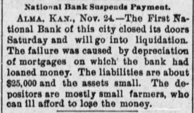 National Bank Suspends Payment. Alma, KAN., Nov. 24-The First National Bank of this city closed its doors Saturday and will go into liquidation. The failure was caused by depreciation of mortgages on which the bank had loaned money. The liabilities are about $25,000 and the assets small. The depositors are mostly small farmers, who can ill afford to lose the money.