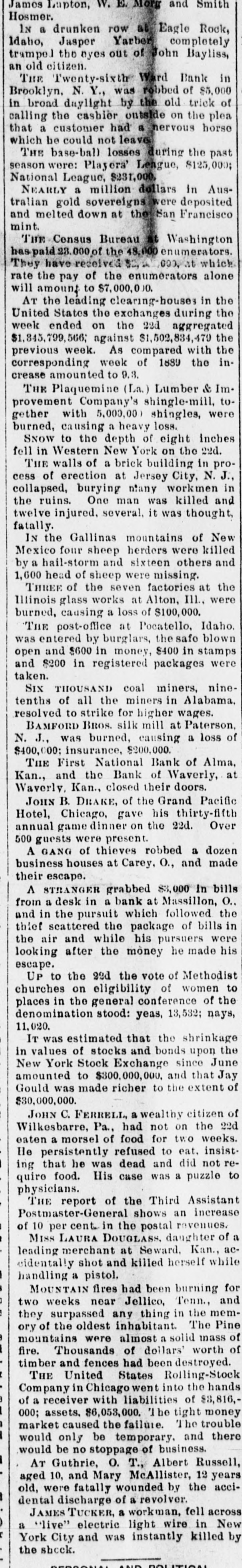James Lapton, W. M more and Hosmer. IN a drunken row at Eagle Rock, Idaho, Jasper Yarber completely trampel the nyes out of John Bayliss, an old citizen. Twenty-sixth Ward Bank in N. Y., was by the of Brooklyn, THE broad daylight robbed old of trick $5,000 the cashier outside on had a senvous in calling that a customer the horse plea which be could not leave THE base-ball losses during the past season were: Playera' Lengue, $125,000; National League, $231,000. NEARLY a million dollars in Australian gold sovereigns were deposited and melted down at the San Francisco mint. l'ine Census Bureau at Washington has paid 23.000 pt the 48,000 enumerators. have received 1000, at which the of the They rate pay enumerators alone will amount to $7,000,000. AT the leading clearing-house in the United States the exchanges during the week ended on the 22d aggregated against week. As the $1,845,799,566; previous compared $1,502,834,479 with the incorresponding week of 1889 the crease amounted to 9.3. THE Plaquemine (La.) Lumber & ImCompany's provement shingle-mill, shingles, were together with 5,000.00 burned, causing a heavy loss. SNOW to the depth of eight inches fell Western New York on the 22d. of a brick proerection at Jersey cess THE in of walls building City, in N. J., in burying ntany workmen One man was collapsed, the ruins. killed and twelve injured, several, it was thought, fatally. IN the Gallinas mountains of New Mexico four sheep herders were killed by a hail-storm and sixteen others and 1,600 head of sheep were missing. THREE of the seven factories at the Illinois glass works at Alton, Ill., were burned, causing a loss of $100,000. THE post-office at Pocatello, Idaho. was entered by burglars, the safe blown open and $600 in money, $400 in stamps and $200 in registered packages were taken. Six THOUSAND coal miners, nineall the miners in Alabama. to strike for BROS. silk mill at Paterson, resolved tenths BAMFORD of higher wages. N. J., was burned, causing a loss of $400,000; insurance, $200,000. THE First National Bank of Alma, at Kan., and the Bank of Waverly, Waverly, Kan., closed their doors. JOHN B. DRAKE, of the Grand Pacific Hotel, Chicago, gave his thirty-fifth Over annual game dinner on the 22d. 500 guests were present. A GANG of thieves robbed a dozen business houses at Carey, O., and made their escape. A STRANGER grabbed $3,000 in bills O., a desk in a bank at Massillon, and from in the pursuit which followed the thief scattered the package of bills in the air and while his pursuers were his looking after the money he made escape. UP to the 22d the vote of Methodist churches on eligibility of women the to places in the general conference of denomination stood: yeas, 13,532; nays, 11,020. IT was estimated that the shrinkage of stocks and bonds upon the in Stock Exchange to $300,000,000. and amounted New values York since that June Jay of Gould was made richer to the extent $30,000,000. JOHN C. FERRELL, a wealthy citizen 22d of Wilkesbarre, Pa., had not on the eaten a morsel of food for two weeks. He persistently refused to eat. insistthat he was dead and did not re- to ing quire food. His case was a puzzle physicians. THE report of the Third Assistant increase Postmaster-General shows an a of 10 per cent. in the postal revenues. of MISS LAURA DOUGLASS. daughter merchant at Seward, Kan., while aceidentally leading shot and killed herself handling a pistol. MOUNTAIN fires had been burning and for weeks near Jellico, Tenn., two surpassed any thing in the mem- Pine they of the oldest inhabitant. The mountains ory were almost a solid mass of of Thousands of dollars' worth timber fire. and fences had been destroyed. THE United States Rolling-Stock hands Company in Chicago went into the $3,816,of receiver with liabilities of a assets. $6,053,000. '1 he tight trouble money market 000; caused the failure. he there would only be temporary. and would be no stoppage of business. AT Guthrie, O. T., Albert Russell, 10, and Mary McAllister, the 12 years acciold, aged were fatally wounded by dental discharge of a revolver. JAMES TUCKER, a workman, fell across New "live" electric light wire in a York City and was instantly killed by the sheck.