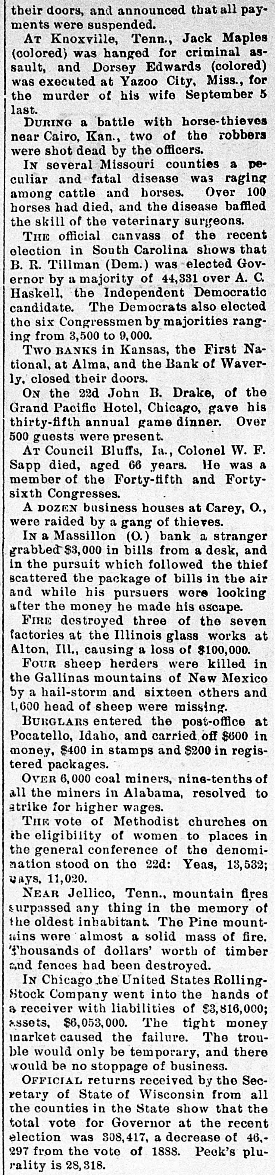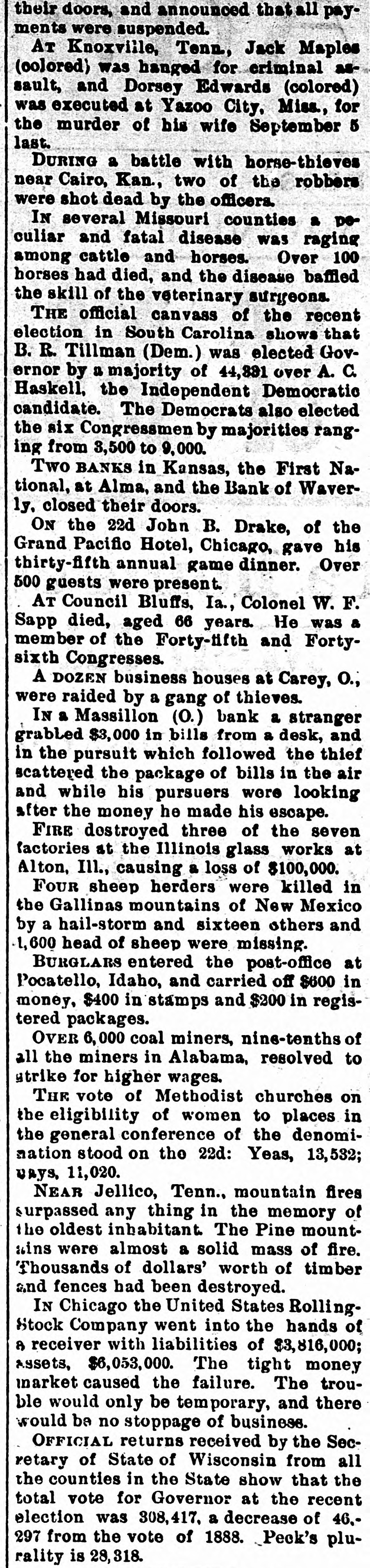 their doors, and announced that all payments were suspended. AT Knoxville, Tenn., Jack Maples (colored) was hanged for criminal assault, and Dorsey Edwards (colored) was executed at Yazoo City, Miss., for the murder of his wife September 5 last. DURING a battle with horse-thieves near Cairo, Kan., two of the robbers were shot dead by the officers. IN several Missouri counties a peculiar and fatal disease was raging among cattle and horses. Over 100 horses had died, and the disease baffled the skill of the veterinary surgeons. THE official canvass of the recent election in South Carolina shows that B. R. Tillman (Dem.) was elected Governor by a majority of 44,331 over A. C. Haskell, the Independent Democratic candidate. The Democrats also elected the six Congressmen by majorities ranging from 3,500 to 9,000. Two BANKS in Kansas, the First National, at Alma, and the Bank of Waverly. closed their doors. ON the 22d John B. Drake, of the Grand Pacific Hotel, Chicago, gave his thirty-fifth annual game dinner. Over 500 guests were present. AT Council Bluffs, Ia., Colonel W. F. Sapp died, aged 66 years. He was a member of the Forty-fifth and Fortysixth Congresses. A DOZEN business houses at Carey, O., were raided by a gang of thieves. IN a Massillon (0.) bank a stranger grabbed $3,000 in bills from a desk, and in the pursuit which followed the thief scattered the package of bills in the air and while his pursuers were looking after the money he made his escape. FIRE destroyed three of the seven factories at the Illinois glass works at Alton, Ill., causing a loss of $100,000. FOUR sheep herders were killed in the Gallinas mountains of New Mexico by a hail-storm and sixteen others and 1,600 head of sheep were missing. BURGLARS entered the post-office at Pocatello, Idaho, and carried off $600 in money, $400 in stamps and $200 in registered packages. OVER 6,000 coal miners, nine-tenths of all the miners in Alabama, resolved to strike for higher wages. THE vote of Methodist churches on the eligibility of women to places in the general conference of the denomimation stood on the 22d: Yeas, 13,532; uays, 11,020. NEAR Jellico, Tenn., mountain fires surpassed any thing in the memory of the oldest inhabitant. The Pine mountains were almost a solid mass of fire. Thousands of dollars' worth of timber and fences had been destroyed. IN Chicago the United States RollingStock Company went into the hands of 8 receiver with liabilities of $3,816,000; Assets, $6,053,000. The tight money market caused the failure. The trouble would only be temporary, and there would be no stoppage of business. OFFICIAL returns received by the Secretary of State of Wisconsin from all the counties in the State show that the total vote for Governor at the recent election was 308,417, a decrease of 46,297 from the vote of 1888. Peck's plurality is 28,318.