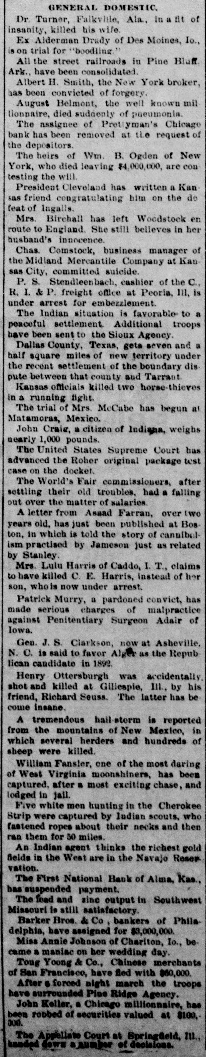 GENERAL DOMESTIC. Dr. Turner, Falkville, Ala, in a fit of insanity, killed his wife. Ex Alderman Drady of Des Moines, Io., is on trial for "boodling All the street railroads in Pine Blaff Ark., have been consolidated. Albert H. Smith, the New York broker, has been convicted of forgery. August Belmont, the well known mil lionnaire, died suddenly of pneumonia. The assignee of Prettyman's Chicago bank has been removed at the request of the depositors. The heirs of Wm. B. Ogden of New York, who died leaving $4,000,000, are con testing the will. President Cleveland has written a Kan sas friend congratulating him on the do feat of Ingalls. Mrs. Birchall has left Woodstock en route to England. She still believes in her husband's innocence. Chas. Comstock, business manager of the Midland Mercantile Company at Kan sas City, committed suicide. P. S. Stendleenbach, cashier of the C., R. I. & P. freight office at Peoria, 111, is under arrest for embezzlement. The Indian situation is favorable to a peaceful settlement Additional troops have been sent to the Sioux Agency. Dallas County, Texas, gets seven and a half square miles of new territory under the recent settlement of the boundary dis pute between that county and Tarrant Kansas officials killed two horse-thieves in a running fight. The trial of Mrs. McCabe has begun at Matamoras, Mexico. John Crais, a citizen of Indiana, weighs nearly 1,000 pounds. The United States Supreme Court has advanced the Roher original package test case on the docket. The World's Fair commissioners, after settling their old troubles, had a falling out over the matter of salaries. A letter from Asaad Farran, over two years old, has just been published at Bos ton, in which is told the story of cannibalism practised by Jameson just as related by Stanley. Mrs. Lulu Harris of Caddo, I. T., claims to have killed C. E. Harris, instead of her son, who is now under arrest. Patrick Murry, a pardoned convict, has made serious charges of malpractice against Penitentiary Surgeon Adair of Iowa. Gen. J.S. Clarkson, now at Asheville, N. C. is said to favor Alget as the Repub lican candidate in 1892. Henry Ottersburgh was accidentally, shot and killed at Gillespie, III., by his friend, Richard Seuss. The latter has be come insane. A tremendous hail-storm is reported from the mountains of New Mexico, in which several herders and hundreds of sheep were killed. William Fansler, one of the most daring of West Virginia moonshiners, has been captured, after a most exciting chase, and lodged in jail. Five white men hunting in the Cherokee Strip were captured by Indian scouts, who fastened ropes about their necks and then ran them for 50 miles. An Indian agent thinks the richest gold fields in the West are in the Navajo Reser vation. The First National Bank of Alma, Kas, has suspended payment. The fead and sinc output in Southwest Missouri is still satisfactory. Barker Bros. & Co bankers of Phila. delphia, have assigned for $3,000,000. Miss Annie Johnson of Chariton, Io., became a maniac on her wedding day. Toug Yoong & Co., Chinese merchants of San Francisco, have fied with $60,000. After a forced night march the troops have surrounded Pine Ridge Agency. John Keller, a Chicago millionnaire, has been robbed of securities valued at 8100, 000. The Appellate Court at Springfield, III., handed down summer of decisions.