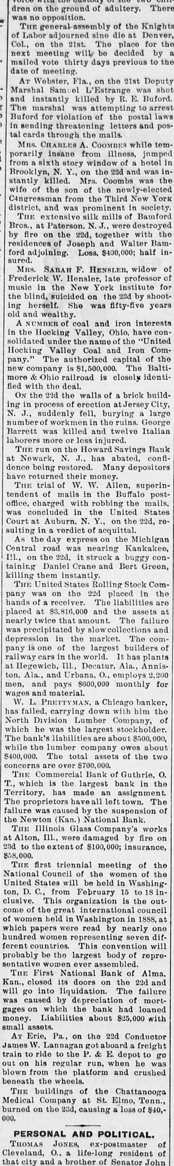 voice custody or one There dren on the ground of adultery. was no opposition. THE general-assembly of the Knights of Labor adjourned sine die at Denver, the Col., on the 21st. The place for next meeting will be decided by the a mailed vote thirty days previous to date of meeting. AT Webster, Fla., on the 21st Deputy shot Marshal Samuel L'Estrange was and instantly killed by R. E. Buford. The marshal was attempting to arrest laws Buford for violation of the postal in sending threatening letters and postal cards through the mails. MRS. CHARLES A. COOMBES while temporarily insane from illness, jnmped in from a sixth story window of a hotel inBrooklyn, N. Y., on the 22d and was the stantly killed. Mrs. Coombs was wife of the son of the newly-elected York C4ngressman from the Third New district, and was prominent in society. THE extensive silk mills of Bamford Bros., at Paterson. N.J., were destroyed the fire on the 22d, together with Bamresidences by of Joseph and Walter inford adjoining. Loss, $400,000; half sured. MRS. SARAH F. HENSLER, widow of Frederick W. Hensler, late professor of music in the New York institute shoot- for the blind, suicided on the 23d by ing herself. She was fifty-five years old and wealthy. A NUMBER of coal and iron interests conthe Hocking Valley, Ohio, have solidated in under the name of the "United ComHocking Valley Coal and Iron of pany." The authorized capital Balti- the company is $1,500,000. The identimore new & Ohio railroad is closely fied with the deal. ON the 22d the walls of a brick buildin process of erection at Jersey large City, N. ing J., suddenly fell, burying a number of workmen in the ruins. George Italian Barrett was killed and twelve laborers more or less injured. THE run on the Howard Savings confi- Bank Newark, N. J., has abated, depositors at dence being restored. Many have returned their money. THE trial of W. W. Allen, superintendent of mails in the Buffalo postoffice, charged with robbing the States mails, concluded in the United rewas Court at Auburn. N. Y., on the 22d, sulting in a verdict of acquittal. As the day express on the Michigan Central road was nearing Kankakee, conon the 22d, it struck a buggy taining I!!., Daniel Crane and Bert Green, killing them instantly. THE United States Rolling Stock Com- the was on the 22d placed in pany hands of a receiver. The liabilities are at $3,816,000 and the assets failure at placed twice that amount The and nearly precipitated by collections The comdepression was in the market. is one of the largest builders plants of pany cars in the world. It has Annisat railway Hegewich, III., Decatur, Ala., 2,200 Ala., and Urbana, O., employs for men, ton. and pays $600,000 monthly and material. wages W. L. PRETTYMAN, a Chicago banker, the failed, carrying down with him of has Division Lumber Company, which North he was the largest stockholder. bank's liabilities are about $500,000, about The while the lumber company owes two $400,000. The total assets of the concerns are over $700,000. Commercial Bank of Guthrie, the O. THE which is the largest bank in T., has made an assignment The Territory. proprietors haveall left town. of The was caused by the suspension the failure Newton (Kan.) National Bank. Illinois Glass Company's works on THE Ill., were damaged by fire 23d at Alton, to the extent of $100,000; insurance, $58,000. first triennial meeting of of the the THE Council of the women National States will be held in Washing- to 18 inUnited D. C., from February 15 the outclusive. ton, This organization is council of the great international 1888, at come women held in Washington in one which of papers were read by nearly seven difhundred women representing will countries. This convention ferent probably be the largest body of representative women ever assembled. First National Bank of Alma, and THE closed its doors on the 22d failure Kan., into liquidation. The of mortwill go caused by depreciation loaned was which the bank had with small assets. money. gages on Liabilities about $25,000 Erie, Pa., on the 22d Conductor freight AT W. Lannagan t aboard a to go James to ride to the P. & E. depot he was train his regular run, when crushed blown out on from the platform and beneath the wheels. buildings of the Chattanooga Tenn., THE Company at St. Elmo, $40, 000. burned Medical on the 23d, causing a loss of PERSONAL AND POLITICAL. JONES, ex-postmaster of of THOMAS O., a life-long resident John that Cleveland, city and a brother of Senator