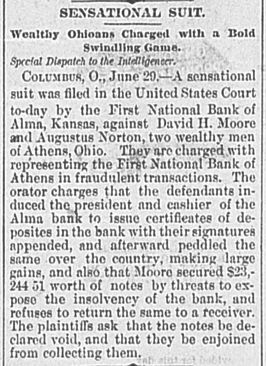 SENSATIONAL SUIT. Wealthy Ohioans Charged with a Bold Swindling Game. Special Dispatch to the Intelligeneer. COLUMBUS, O., June 29.-A sensational suit was filed in the United States Court to-day by the First National Bank of Alma, Kansas, against David H. Moore and Augustus Norton, two wealthy men of Athens, Ohio. They are charged with representing the First National Bank of Athens in fraudulent transactions. The orator charges that the defendants induced the president and cashier of the Alma bank to issue certificates of deposites in the bank with their signatures appended, and afterward peddled the same over the country, making large gains, and also that Moore secured $23,244 51 worth of notes by threats to expose the insolvency of the bank, and refuses to return the same to a receiver. The plaintiffs ask that the notes be declared void, and that they be enjoined from collecting them. zab