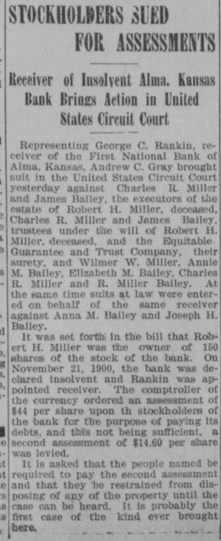 STOCKHOLDERS SUED FOR ASSESSMENTS Receiver of Insolvent Alma. Kansas Bank Brings Action in United States Circuit Court Representing George C. Rankin, receiver of the First National Bank of Alma, Kansas, Andrew C. Gray brought suit in the United States Circuit Court yesterday against Charles R. Miller and James Bailey, the executors of the estate of Robert H. Miller, deceased, Charles R. Miller and James Bailey, trustees under the will of Robert H. Miller, deceased, and the Equitable Guarantee and Trust Company, their surety, and Wilmer W. Miller, Annie M. Bailey, Elizabeth M. Bailey, Charles R. Miller and R. Miller Bailey. At the same time suits at law were entered on behalf of the same receiver against Anna M. Bailey and Joseph H. Bailey. It was set forth in the bill that Rob ert H. Miller was the owner of 150 shares of the stock of the bank. On November 21, 1900, the bank was declared insolvent and Rankin was appointed receiver. The comptroller of the currency ordered an assessment of $44 per share upon th stockholders of the bank for the purpose of paying its debts. and this not being sufficient, a second assessment of $14.60 per share was levied. It is asked that the people named be required to pay the second assessment and that they be restrained from disposing of any of the property until the case can be heard. It is probably the first case of the kind ever brought here.