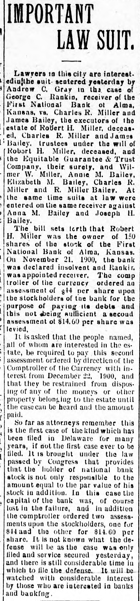 IMPORTANT LAW SUIT. Lawvers 10 this city are interestedin|the suit. sentered yesterday by Andrew C. Gray in the case of George C. Rankin. receiver of the First National Bank ot Alma, Kansas. vs. Charles R. Miller and James Bailey, the executors of the estate of Robert H. Miller. deceas. ed, Charles R. Miller and James Bailey. trustees under the will of Robert H. Miller. deceased, and the Equitable Guarantee & Trust Company. their surety. and Wilmer W. Miller, Annie M. Bailey, Elizabeth M. Bailey, Charles R. Miller and R. Miller Bailev. At the same time suits at law were entered on the same receiver against Anna M. Bailey and Joseph H. Bailey. The bill sets torth that Robert H. Miller was the owner of 150 shares of the stock of the First National Bank of Alma, Kansas. On November 21. 1900, the bank was declared insolvent and Rankir. was appointed receiver. The comp troller of the currency ordered an assessment of $14 per share upon the stockholders of the bank for the purpose of paying its debts and this not being aufficient a second assessment ot $14.60 per share was levied, It is asked that the people named, all of whom are interested in the estate, be required to pay this second assessment ordered by direction of the Comptroller of the Currency with interest from December 22, 1900, and that they be restrained from disposing of any of the moneys or other property belonging to the estate until the casecan be heard and the amount paid. So far as attorneys remember this is the first case of the kind which has been filed in Delaware for many years, if not the first case ever to be filed. It IS brought under the law passed by Congress that provides that the holder of national bank stock is not only responsible to the amount equal to the par value of his stock in addition. In this case the capital of the bank was, of course lost in the failure, and in addition the comptroller ordered two assessments upon the stockholders, one for $44 and the other for $14.60 per share. It is not known what the defense will be as the case was only filed and service secured yesterday, and there is still considerable time in which to file the defense. It will be watched with considerable interest by those who are interested in banks and banking.