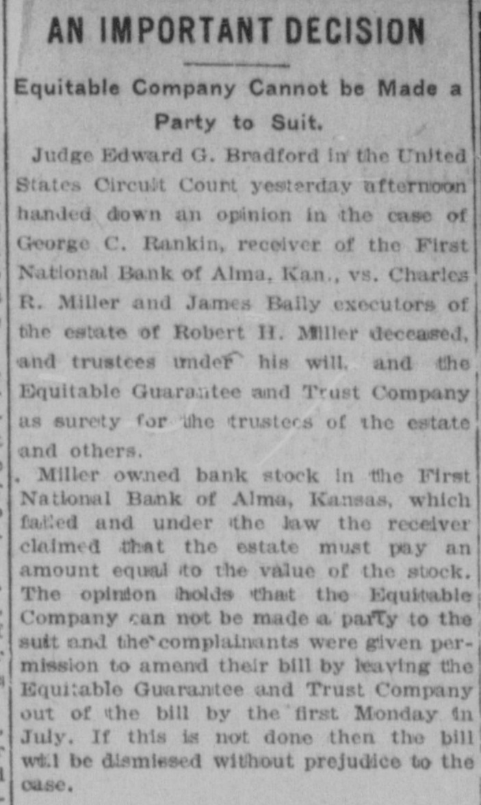 AN IMPORTANT DECISION Equitable Company Cannot be Made a Party to Suit. Judge Edward G. Bradford in the United States Circuit Count yesterday afternoon handed down an opinion in the case of George C. Rankin, receiver of the First National Bank of Alma, Kan., vs. Charles R. Miller and James Bally executors of the estate of Robert H. Miller deceased, and trustces under his will. and the Equitable Guarantee and Trust Company as surety for the trustees of the estate and others. Miller owned bank stock in the First National Bank of Alma, Kansas, which failed and under the law the receiver claimed that the estate must pay an amount equal to the value of the stock. The opinion holds that the Equitable Company can not be made a party to the suit and the complainants were given permission to amend their bill by leaving the Equitable Guarantee and Trust Company out of the bill by the first Monday in July. If this is not done then the bill wt.l be dismissed without prejudice to the case.