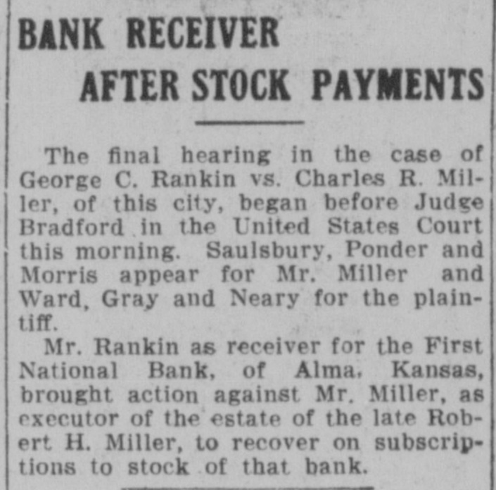 BANK RECEIVER AFTER STOCK PAYMENTS The final hearing in the case of George C. Rankin VS. Charles R. Miller, of this city, began before Judge Bradford in the United States Court this morning. Saulsbury, Ponder and Morris appear for Mr. Miller and Ward, Gray and Neary for the plaintiff. Mr. Rankin as receiver for the First National Bank, of Alma, Kansas, brought action against Mr. Miller, as executor of the estate of the late Robert H. Miller, to recover on subscriptions to stock of that bank.