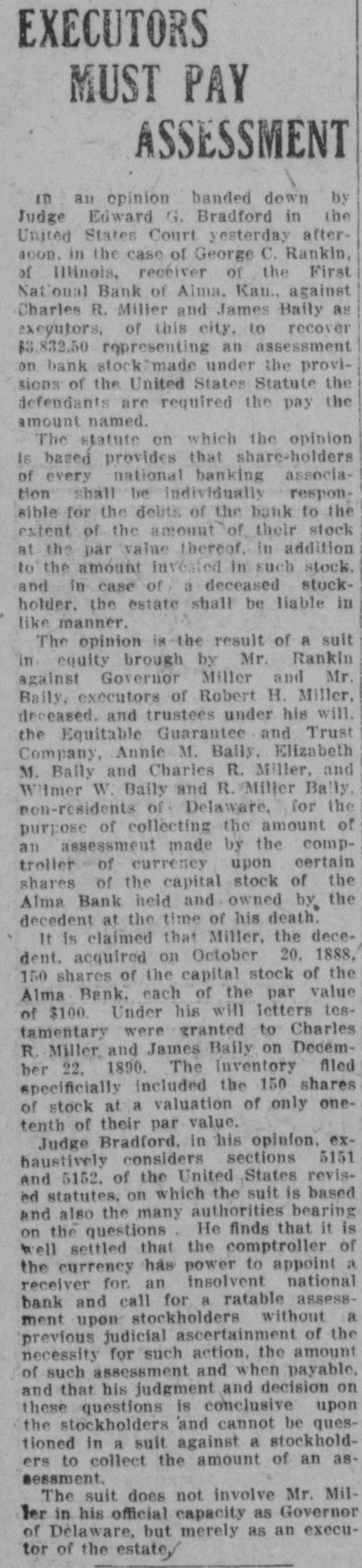 EXECUTORS MUST PAY ASSESSMENT in an opinion banded down by Judge Edward G. Bradford in the United States Court yesterday afteracon. in the case of George C. Rankin, of Illinois, receiver of the First National Bank of Alma, Kan., against Charles R. Miller and James Baily as executors, of this city, to recover $3,832.50 representing an assessment on bank stock? made under the provisions of the United States Statute the defendants are required the pay the amount named. The statute en which the opinion Is based provides that share-holders of every national banking association shall be individually responsible for the delits of the bank to the extent of the amount of their stock at the par value thereof, in addition to the amount invested in such stock, and in case of a deceased stockholder. the estate shall be liable in like manner. The opinion is the result of a suit in equity brough by Mr. Rankin against Governor Miller and Mr. Baily, executors of Robert H. Miller, deceased. and trustees under his will. the Equitable Guarantee and Trust Company, Annie M. Baily, Elizabeth M. Baily and Charles R. Miller, and Wilmer W. Baily and R. Miller Bally non-residents of Delaware, for the purpose of collecting the amount of an assessment made by the comptroller of currency upon certain shares of the capital stock of the Alma Bank held and owned by the decedent at the time of his death. It is claimed that Miller, the decedent. acquired on October 20, 1888, 150 shares of the capital stock of the Alma Bank, each of the par value of $100. Under his will letters testamentary were granted to Charles R. Miller and James Baily on December 22. 1890. The inventory filed specifically included the 150 shares of stock at a valuation of only onetenth of their par value. Judge Bradford, in his opinion. exhaustively considers sections 5151 And 5152. of the United States revised statutes, on which the suit is based and also the many authorities bearing on the questions. He finds that it is well settled that the comptroller of the currency has power to appoint a receiver for. an insolvent national bank and call for a ratable assessment upon stockholders without a previous judicial ascertainment of the necessity for such action, the amount his of and such that assessment judgment and and when decision payable, on these questions is conclusive upon the stockholders and cannot be questioned in a suit against a stockholders to collect the amount of an assessment. The suit does not involve Mr. Miller in his official capacity as Governor of Delaware, but merely as an executor of the estate,