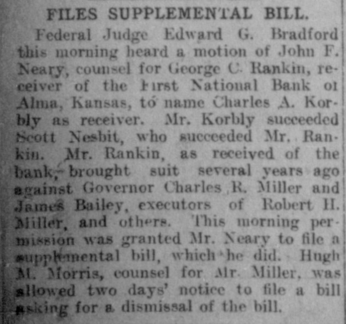 FILES SUPPLEMENTAL BILL. Federal Judge Edward G. Bradford this morning heard a motion of John F. Neary, counsel for George C. Rankin, receiver of the First National Bank of Alma, Kansas, to name Charles A. Korbly as receiver. Mr. Korbly succeeded Scott Nesbit, who succeeded Mr. Rankin. Mr. Rankin, as received of the bank, brought suit several years ago against Governor Charles R. Miller and James Bailey, executors of Robert H. Miller, and others. This morning permission was granted Mr. Neary to file a supplemental bill, which he did. Hugh M. Morris, counsel for Mr. Miller, was allowed two days' notice to file a bill asking for a dismissal of the bill.